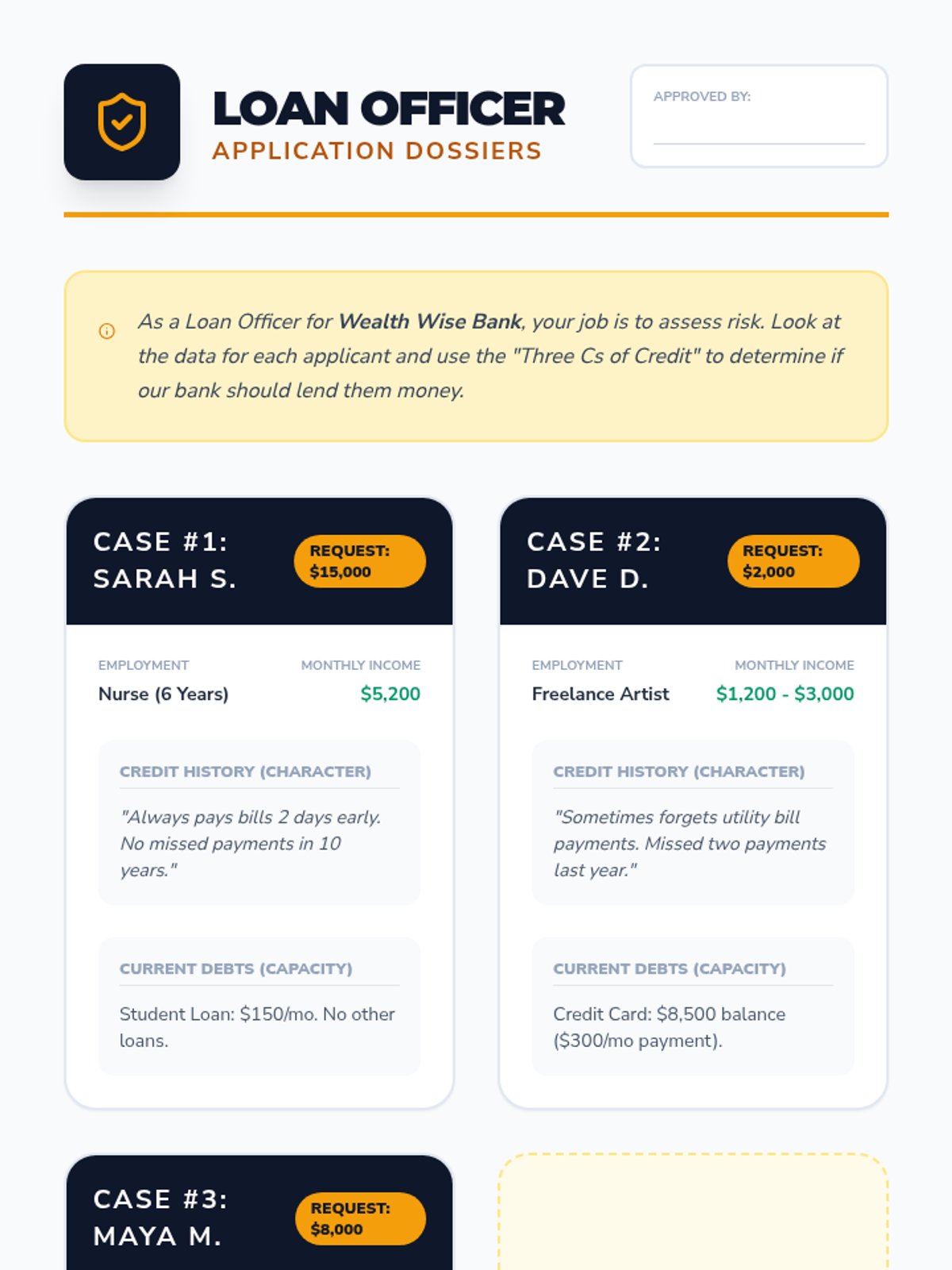 Students step into the role of loan officers to evaluate fictional applications using the 'Three Cs of Credit', analyzing the costs and responsibilities of borrowing money.