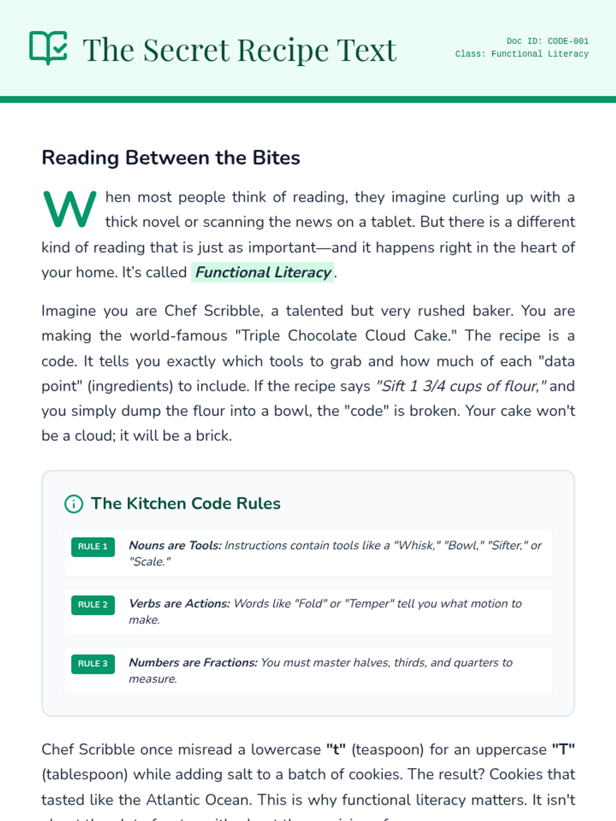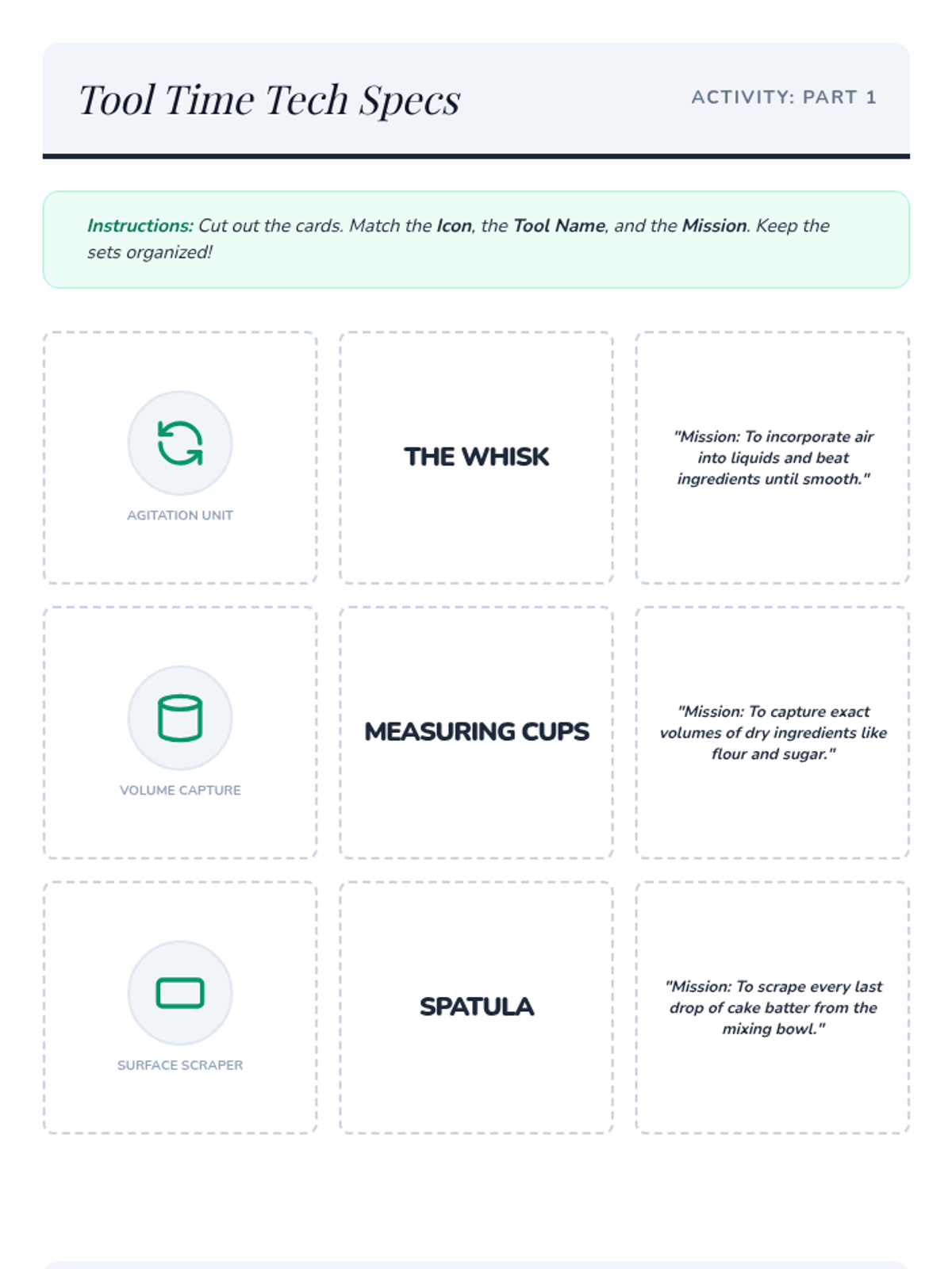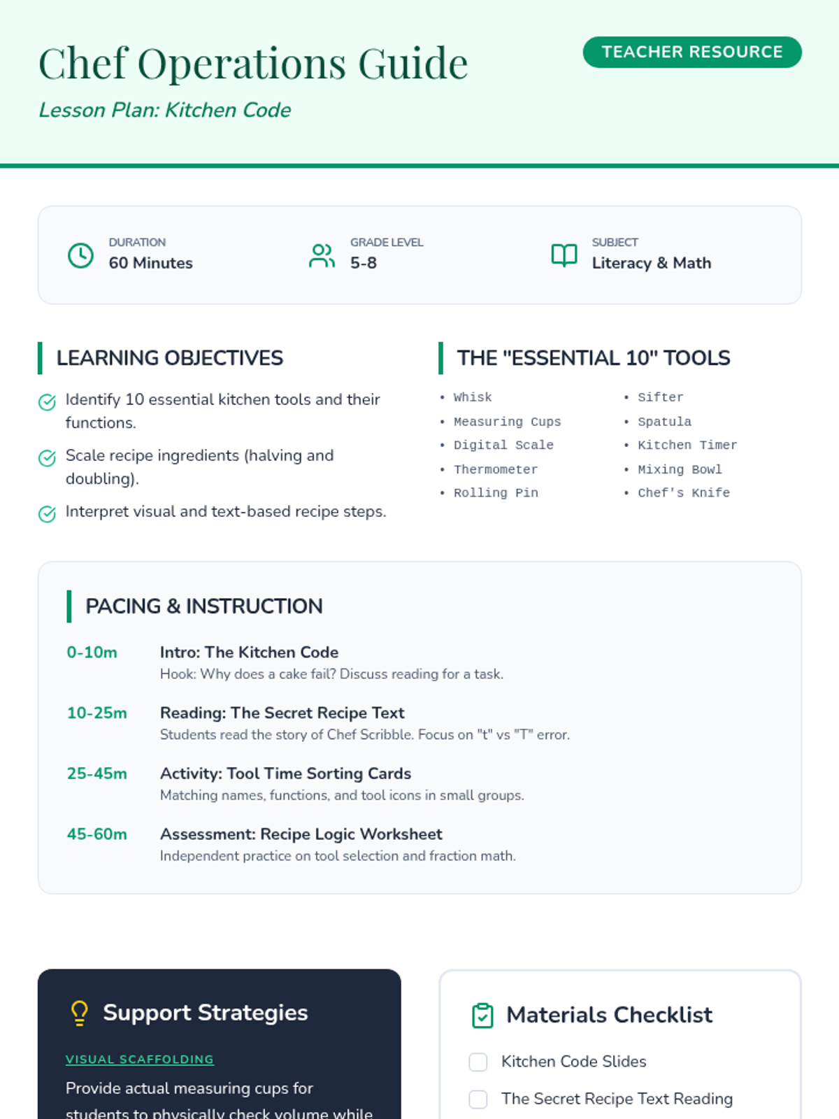 A comprehensive lesson where students learn functional literacy and math through the lens of cooking, focusing on kitchen tool identification and fraction scaling.
