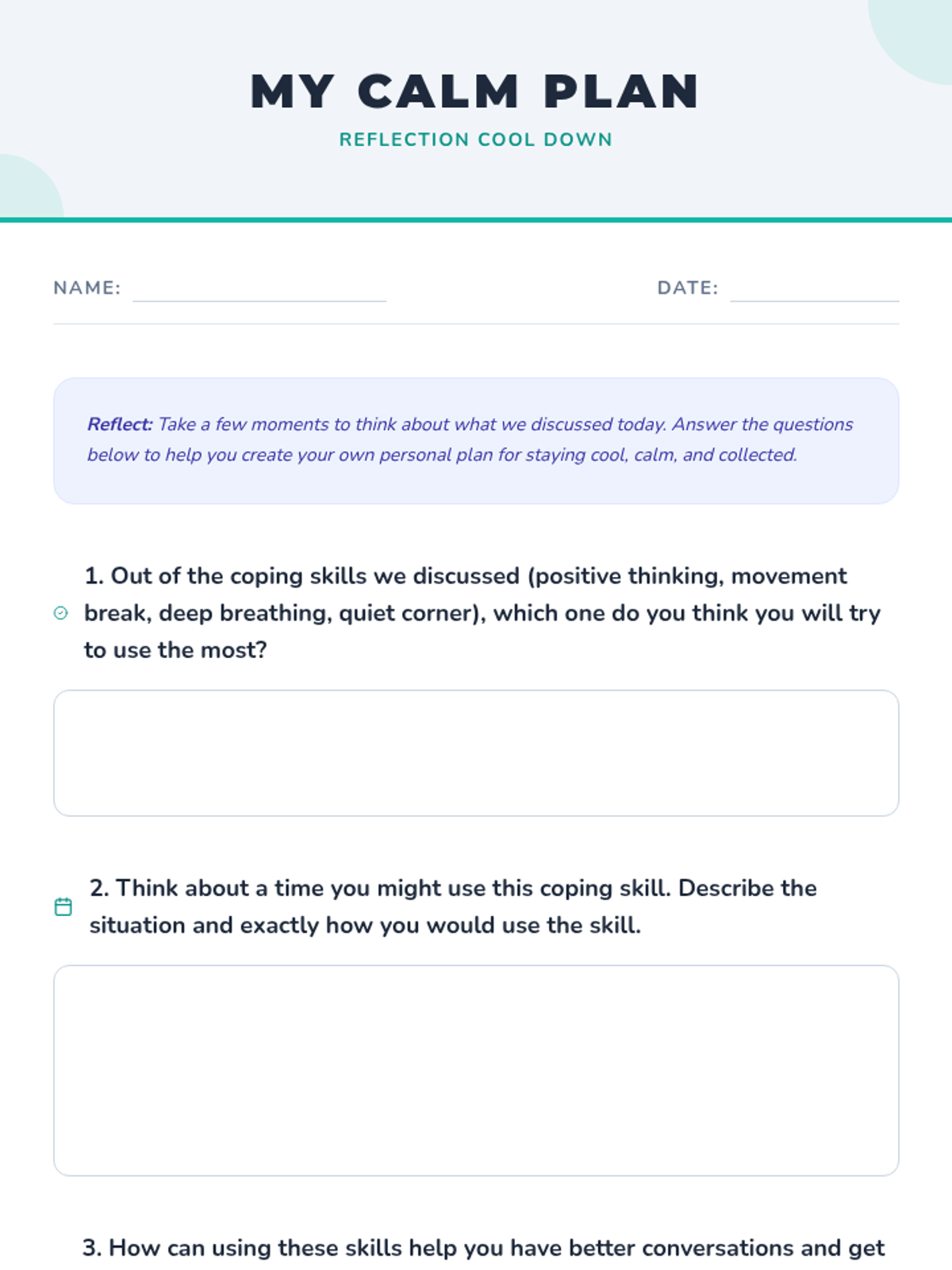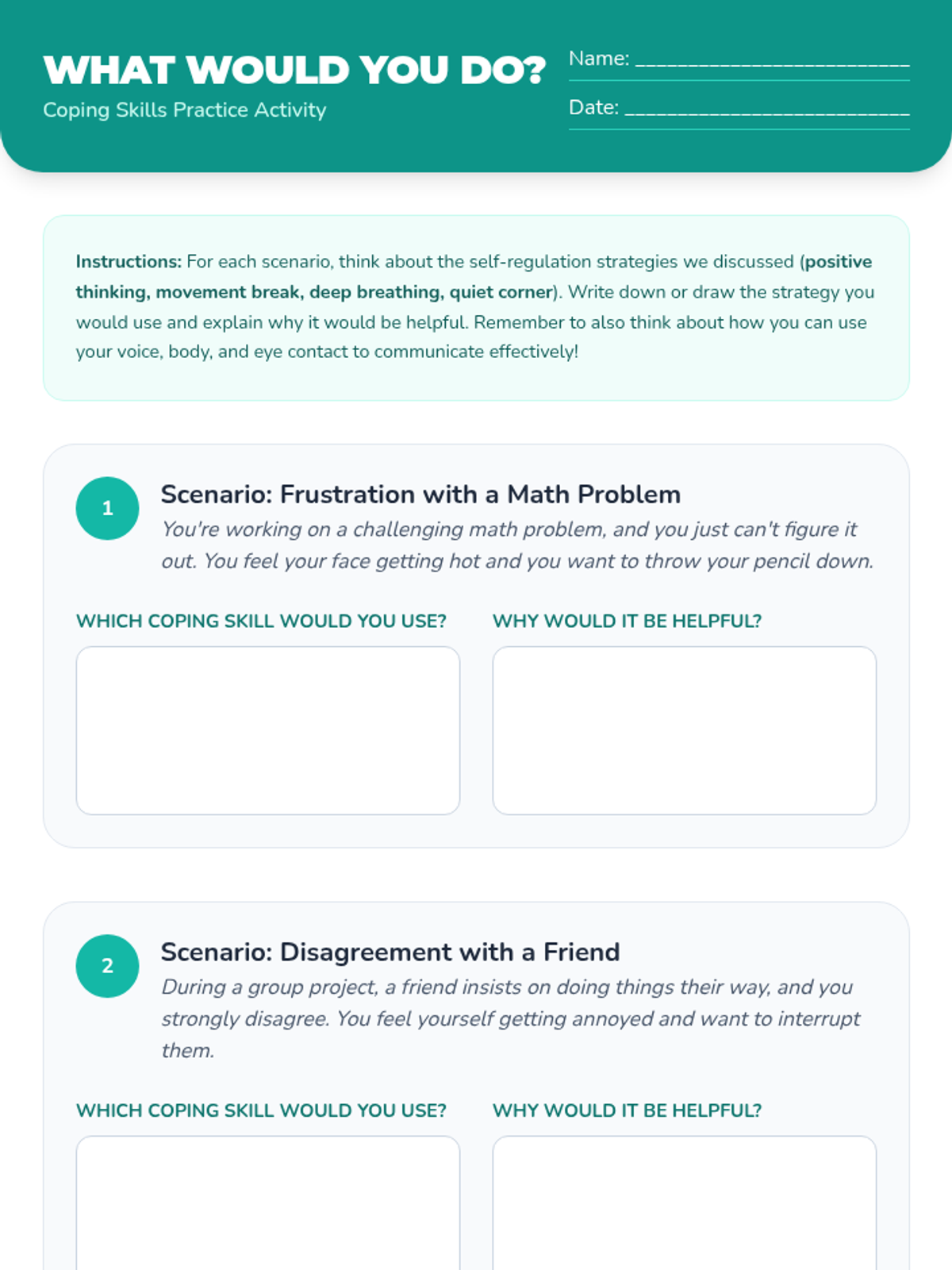 Students identify personal emotional triggers and use an "Emotion Thermometer" to rate intensity and plan calming strategies.