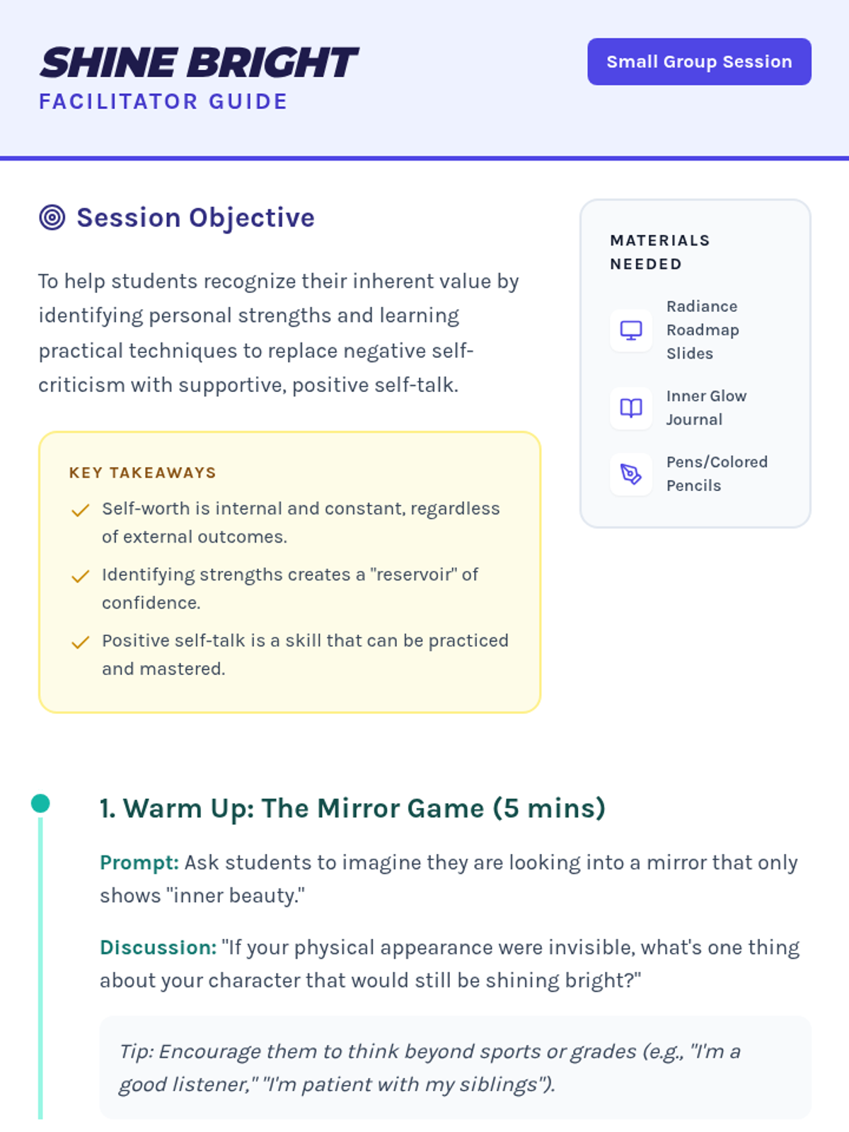 A lesson designed for small groups to explore self-worth by identifying individual strengths and mastering the art of positive self-talk through guided discussion and reflection.