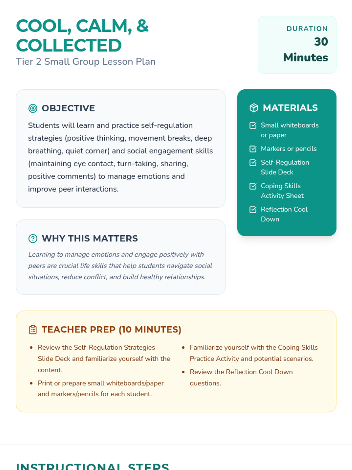 A Tier 2 small group lesson for 6th graders focused on managing strong emotions through self-regulation strategies and improving peer relationships with prosocial behaviors.