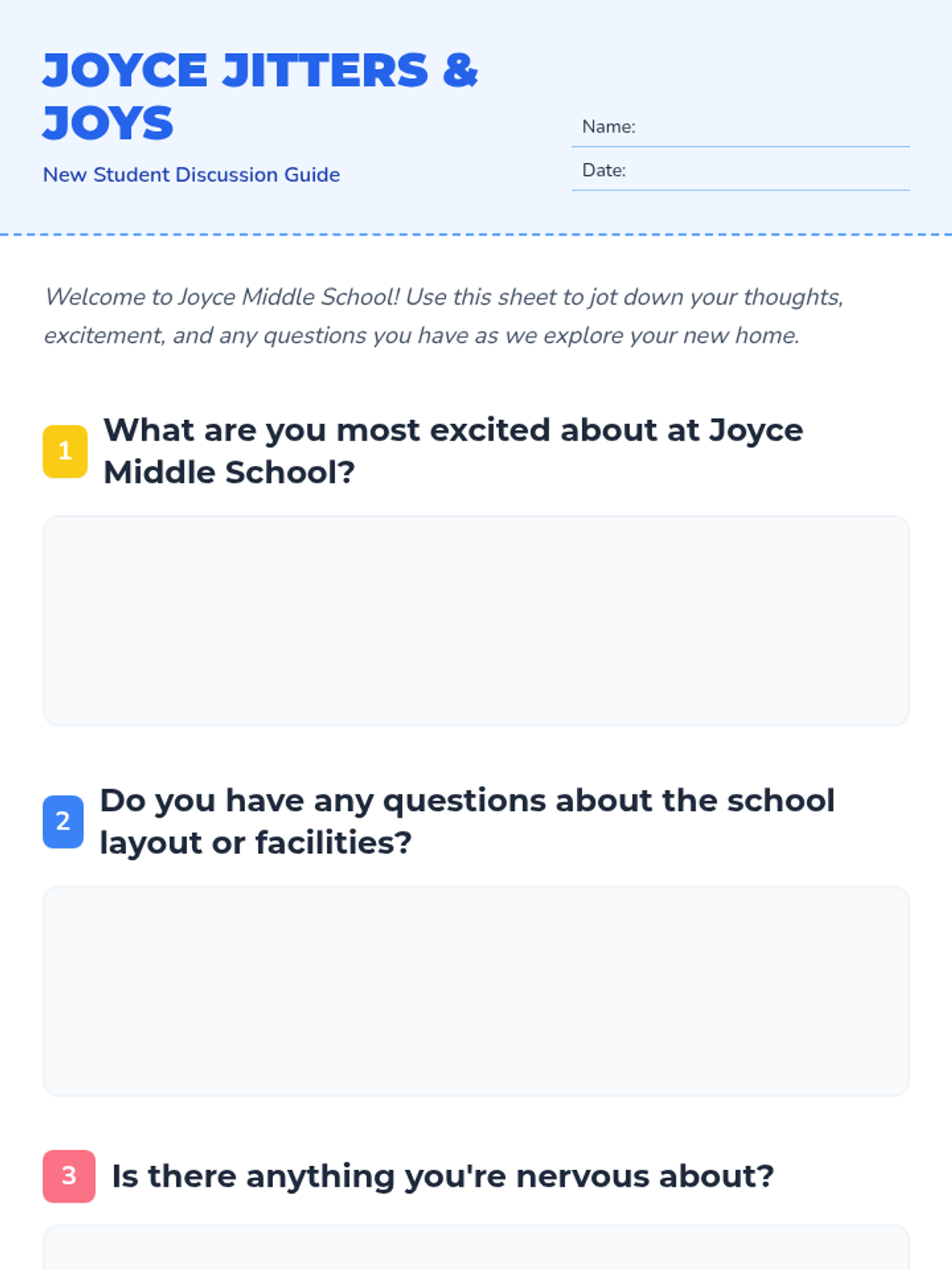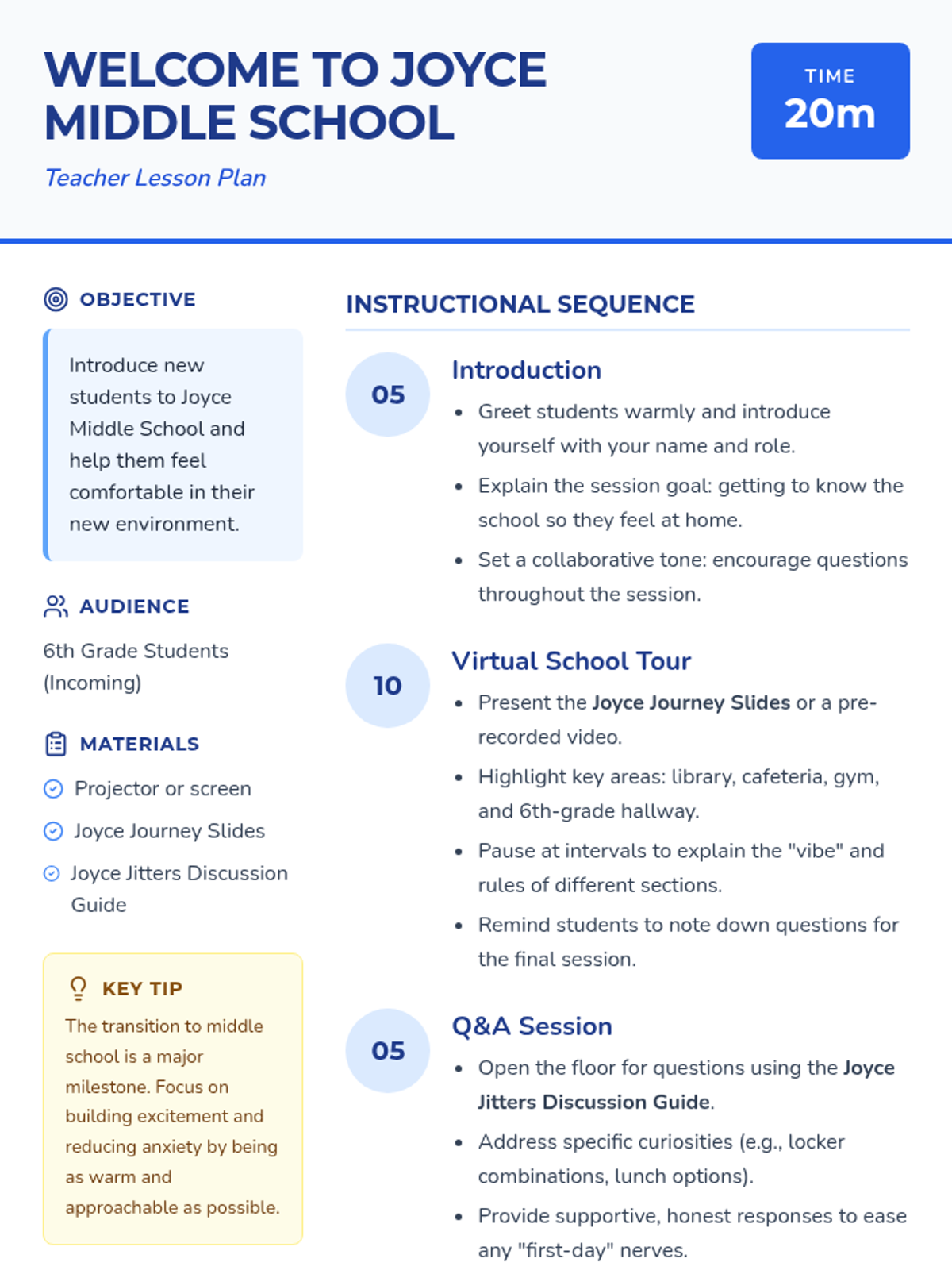 A warm orientation lesson for incoming 6th graders to Joyce Middle School, featuring a school tour and Q&A session.
