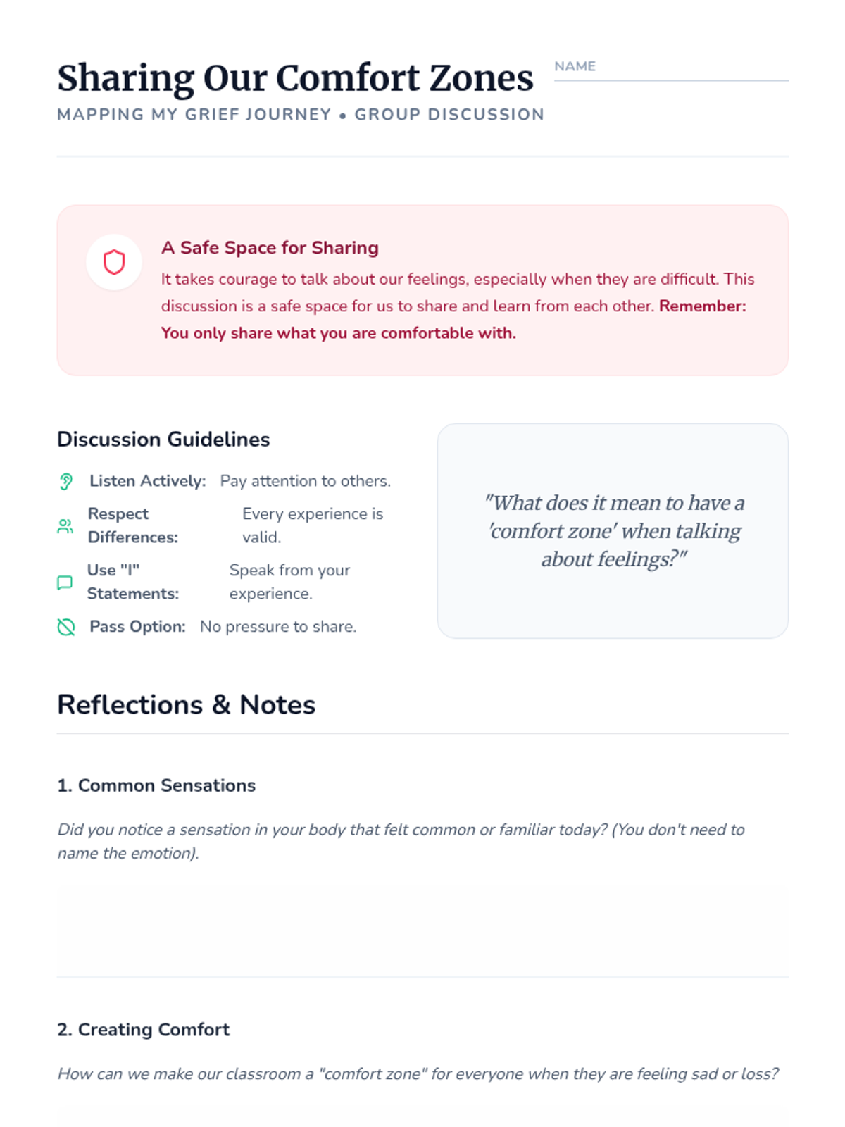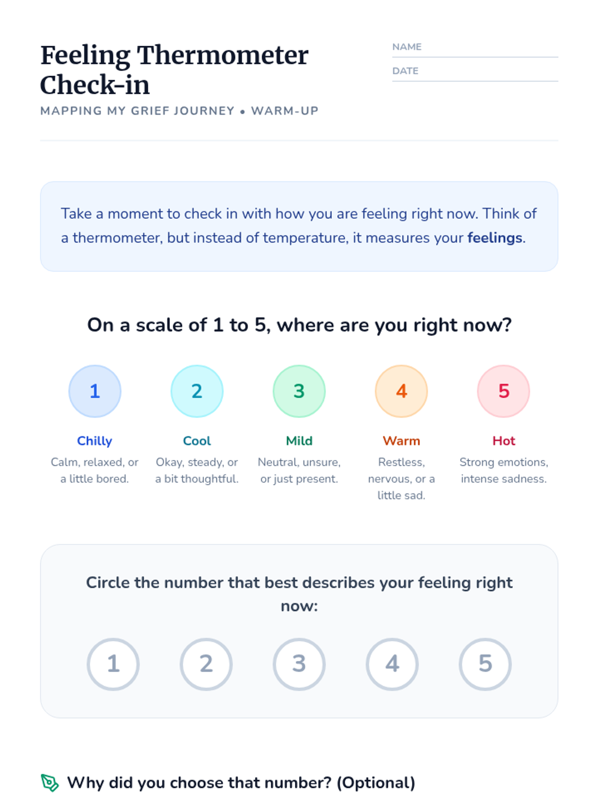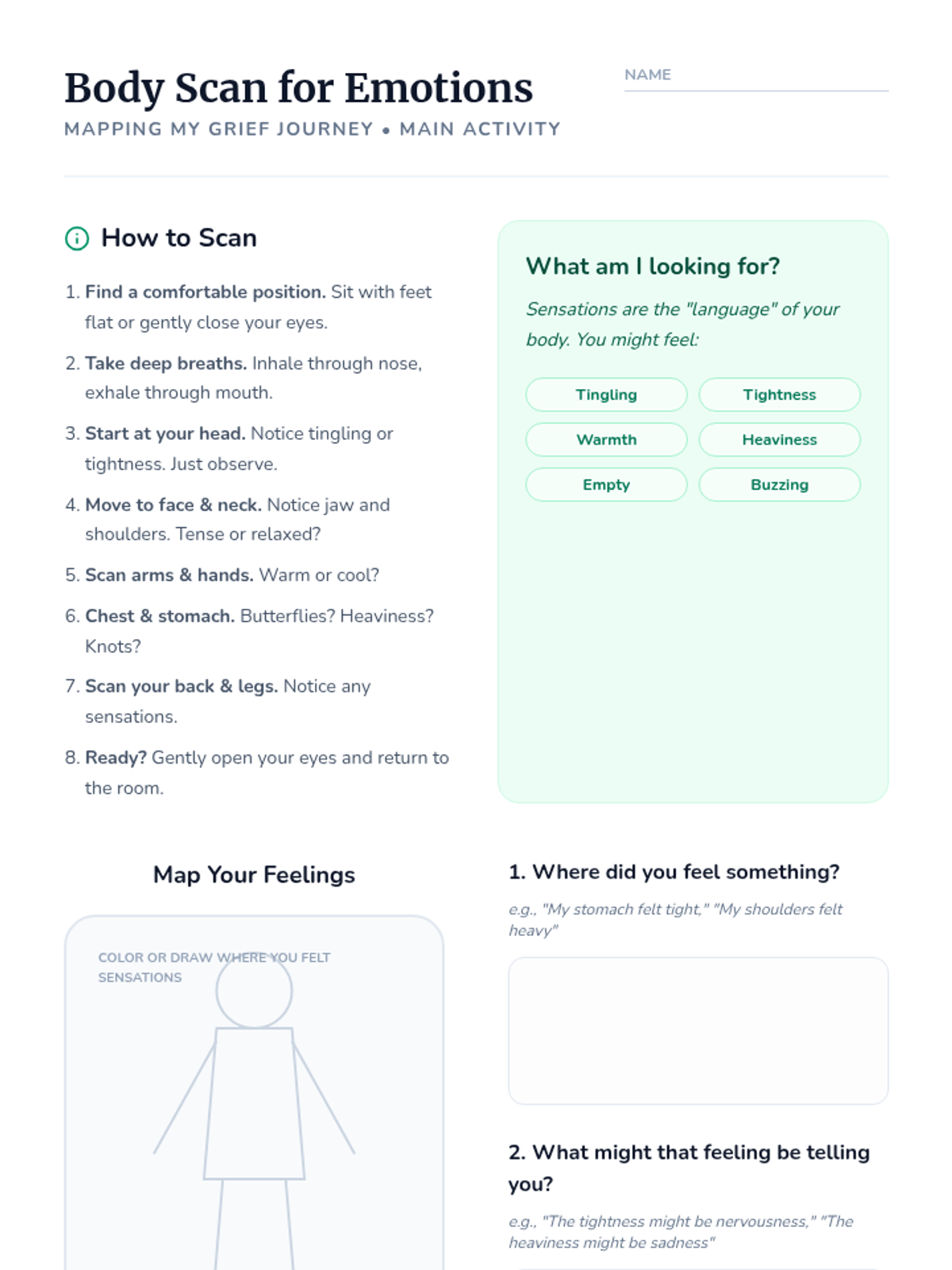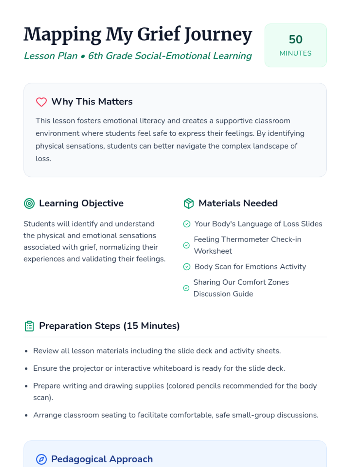 This lesson helps 6th-grade students identify and understand the physical and emotional sensations associated with grief. Through guided discussion and a body scan activity, students will learn to normalize their experiences and develop self-compassion.