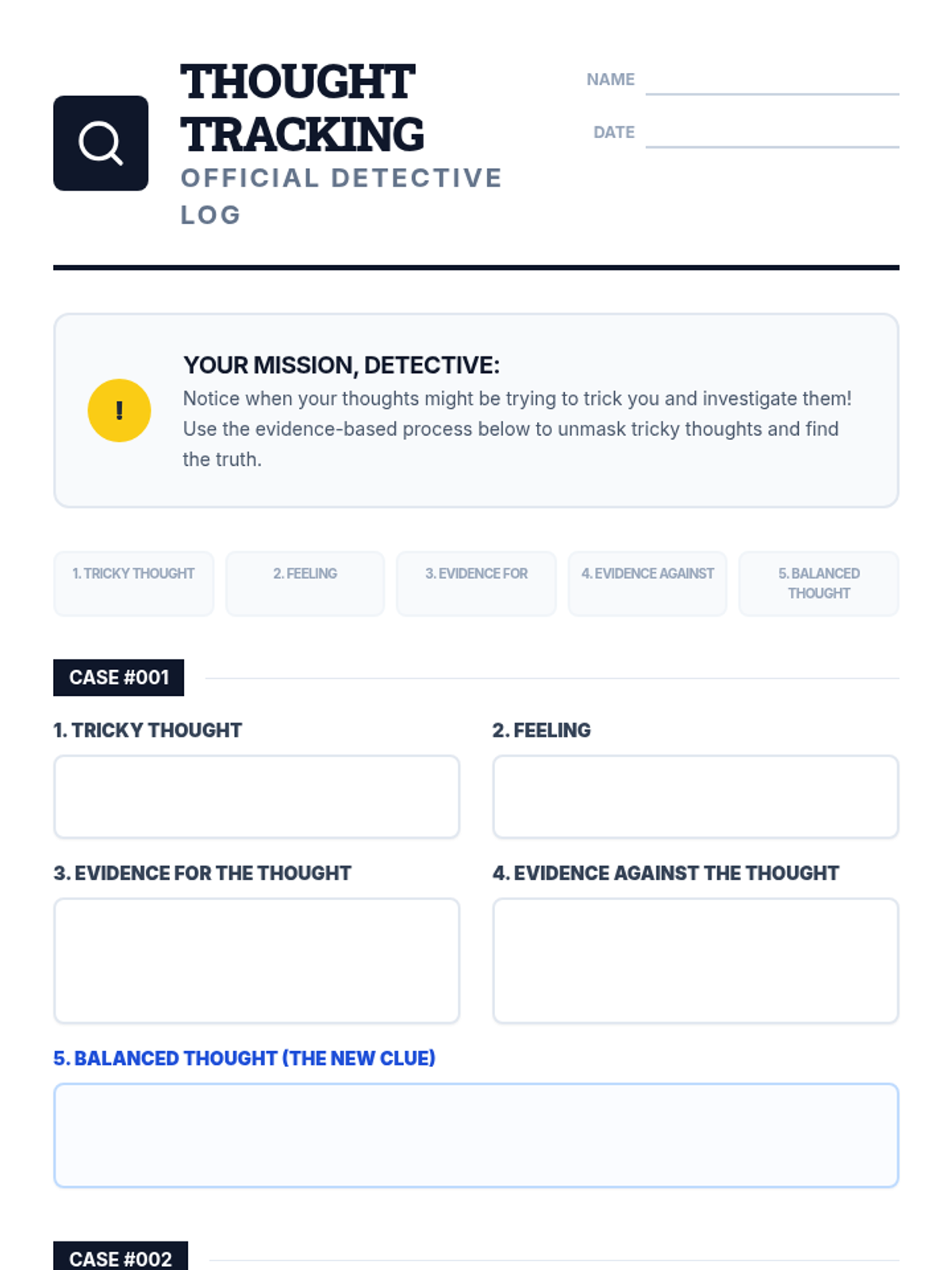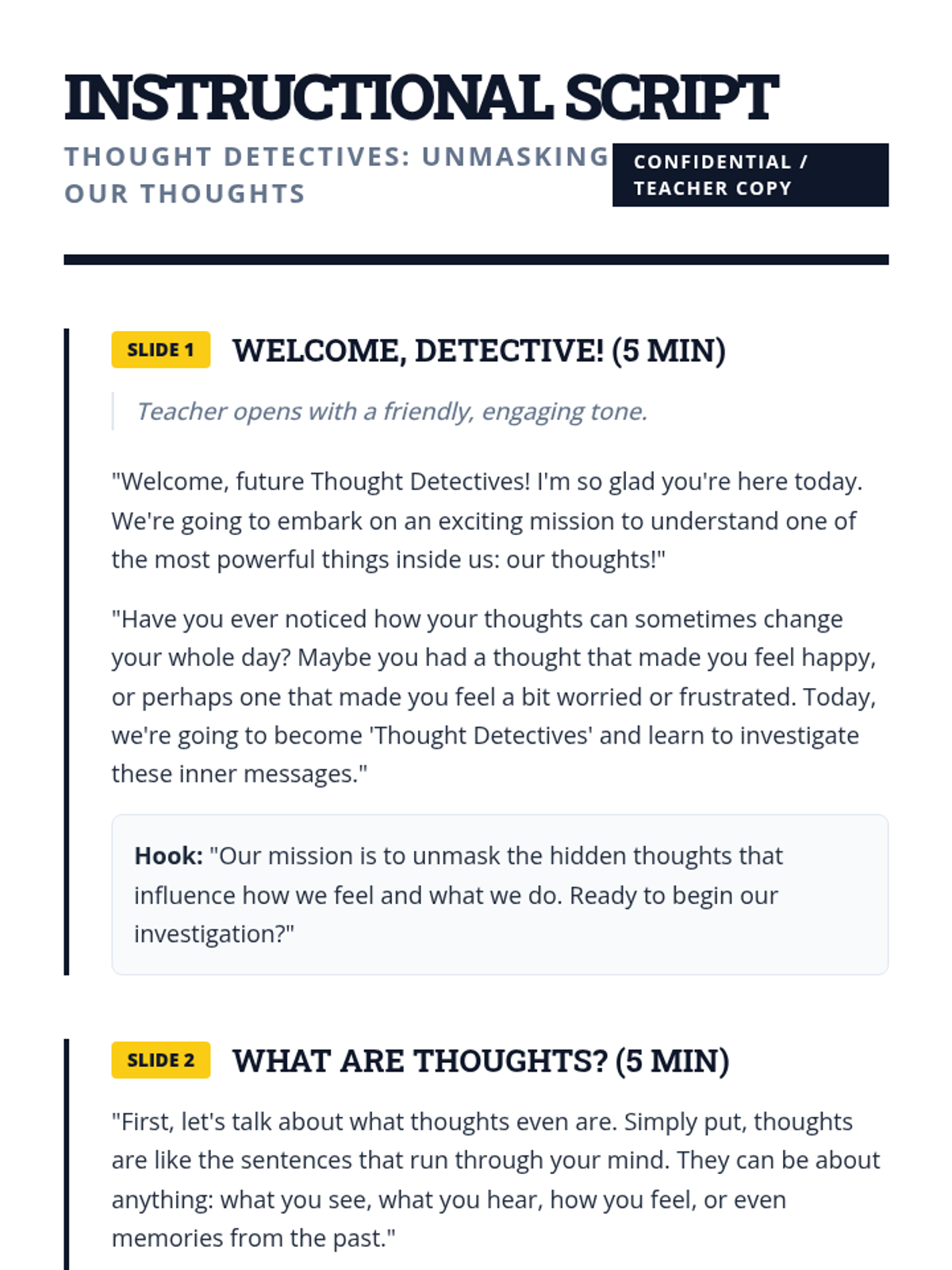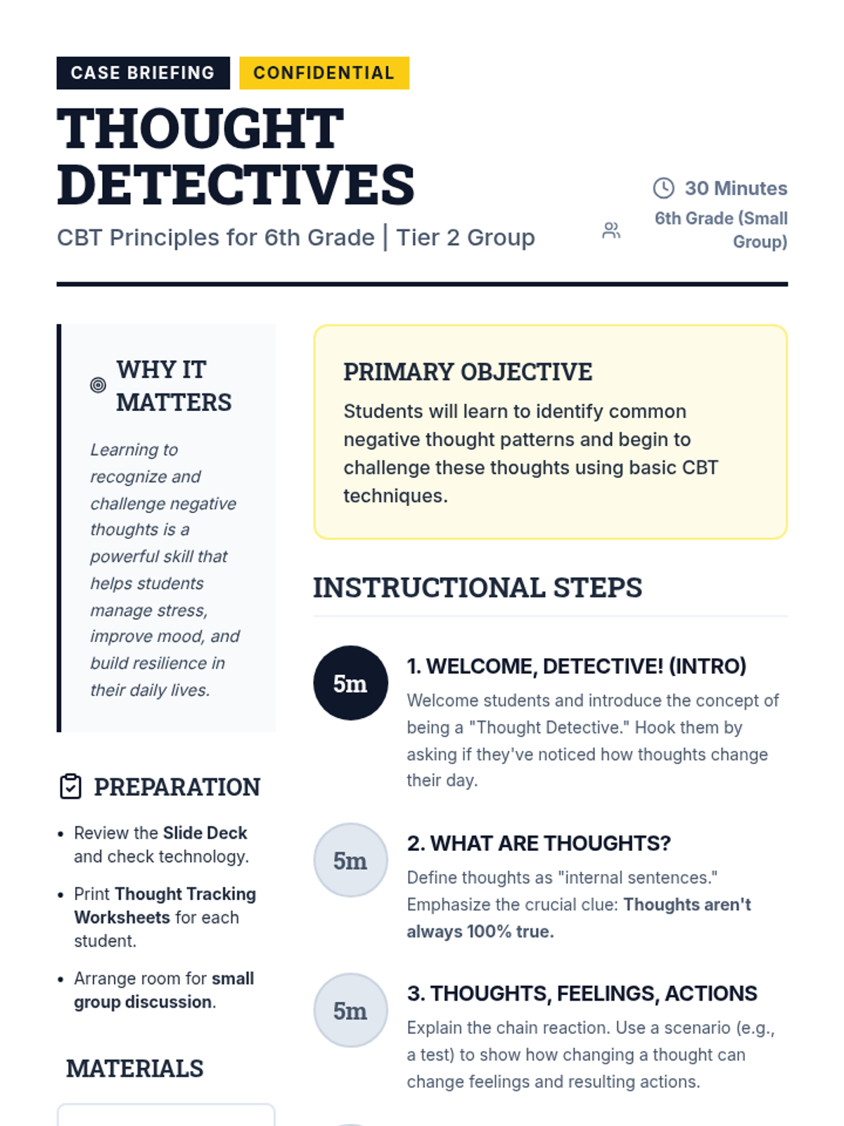 This lesson introduces 6th-grade students to Cognitive Behavioral Therapy (CBT) principles, helping them identify and challenge negative thoughts in a small group setting using a detective-themed approach.