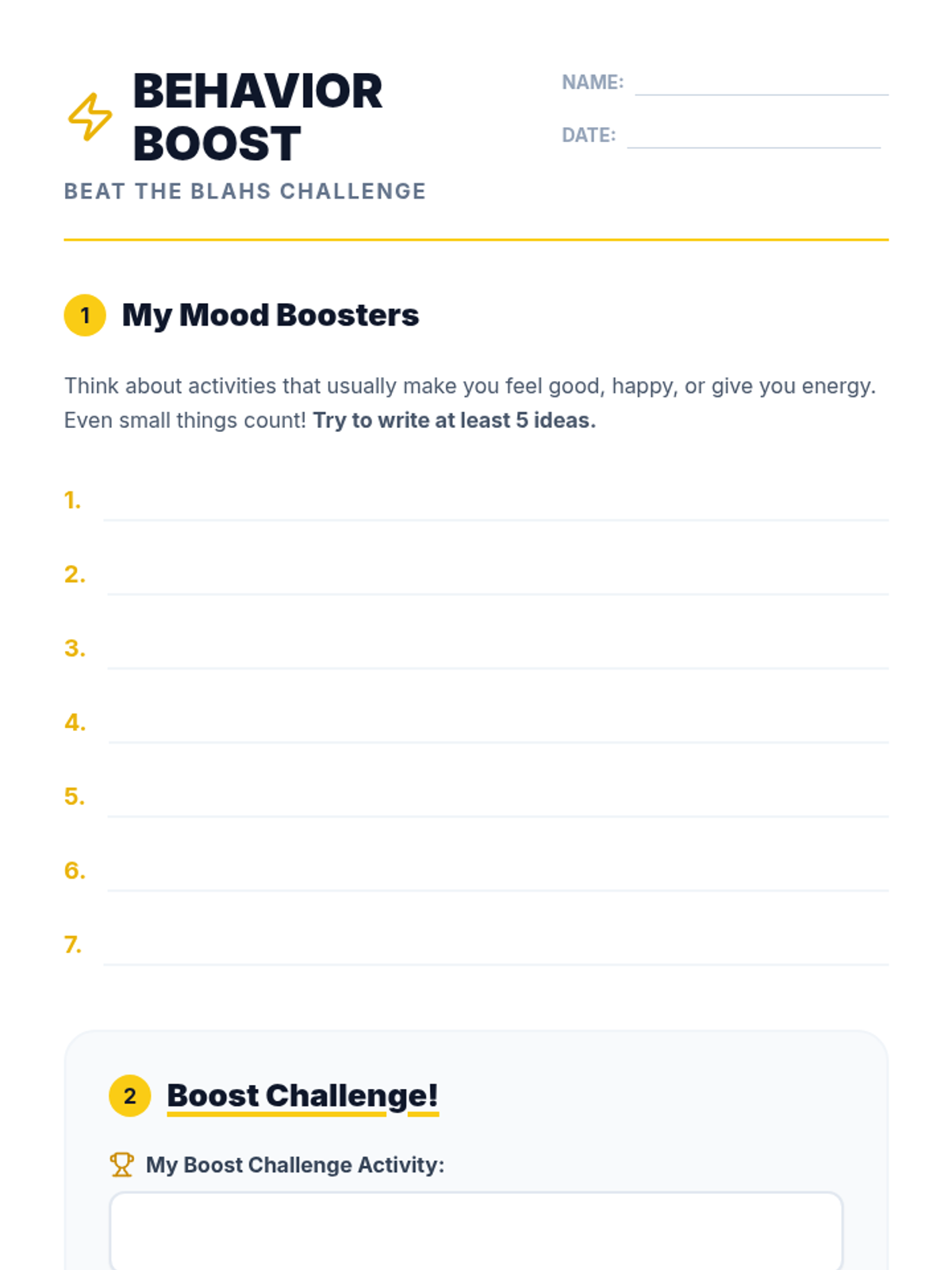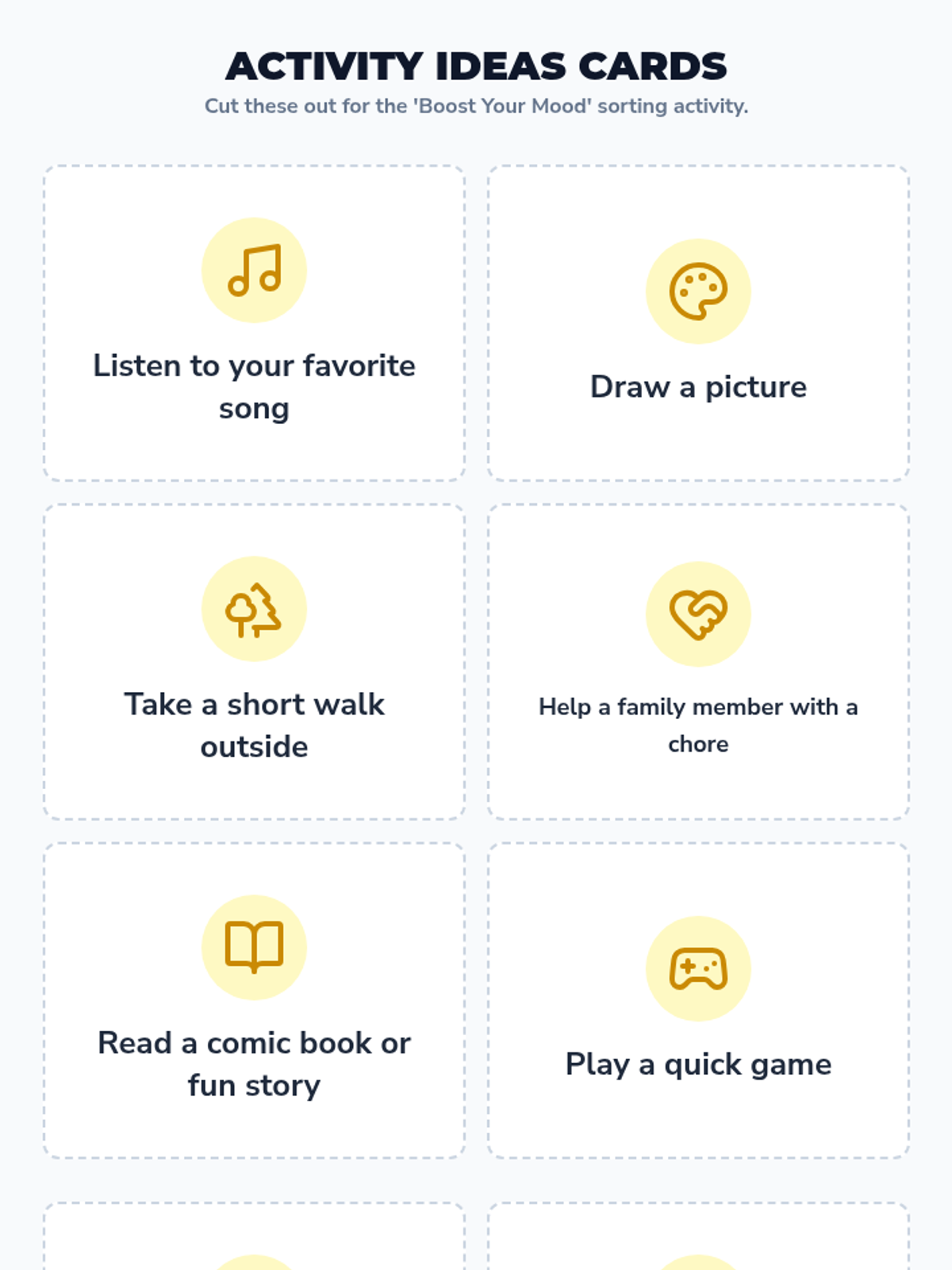 Synthesizing their learning, students create a 'Break the Glass' emergency plan for days when they feel low or anxious. They select their most effective pleasure and mastery activities and write specific implementation intentions (If I feel X, then I will do Y).