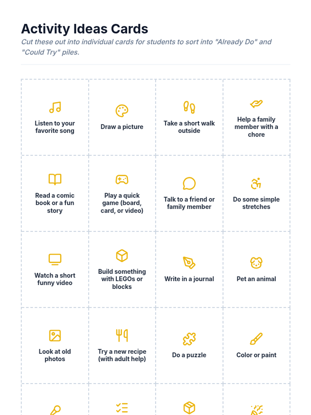 Students distinguish between activities that feel good in the moment (Pleasure) and those that make us feel accomplished (Mastery). Through a sorting workshop, they brainstorm examples for both categories, understanding that a balanced diet of experiences includes both fun and achievement.