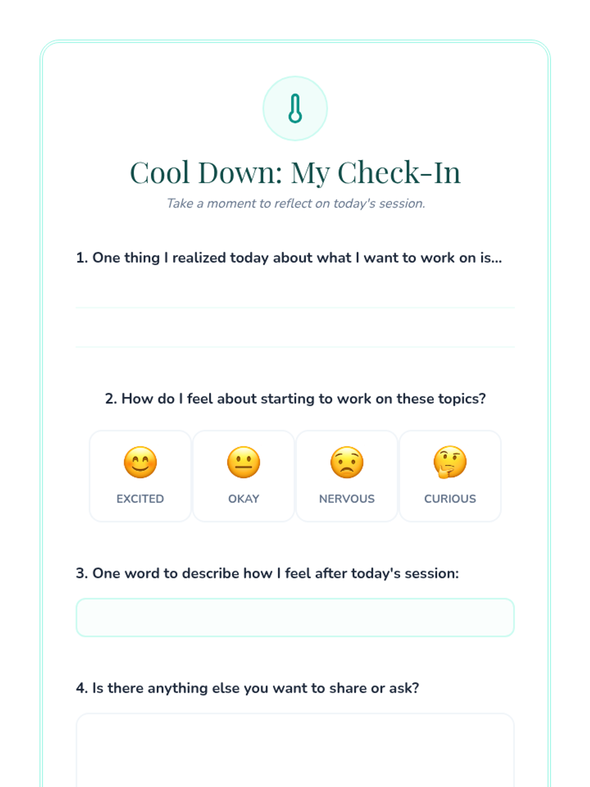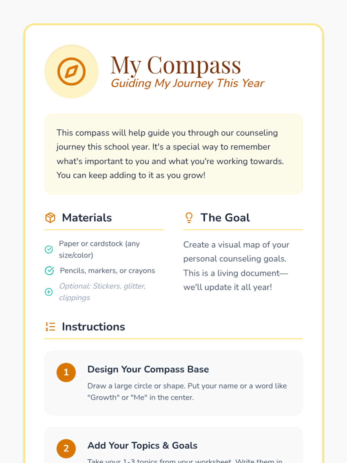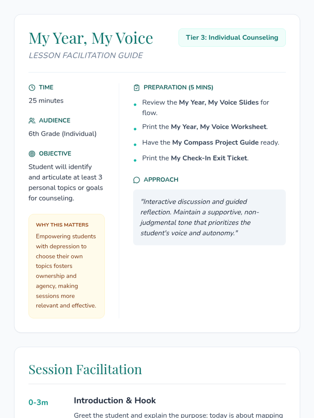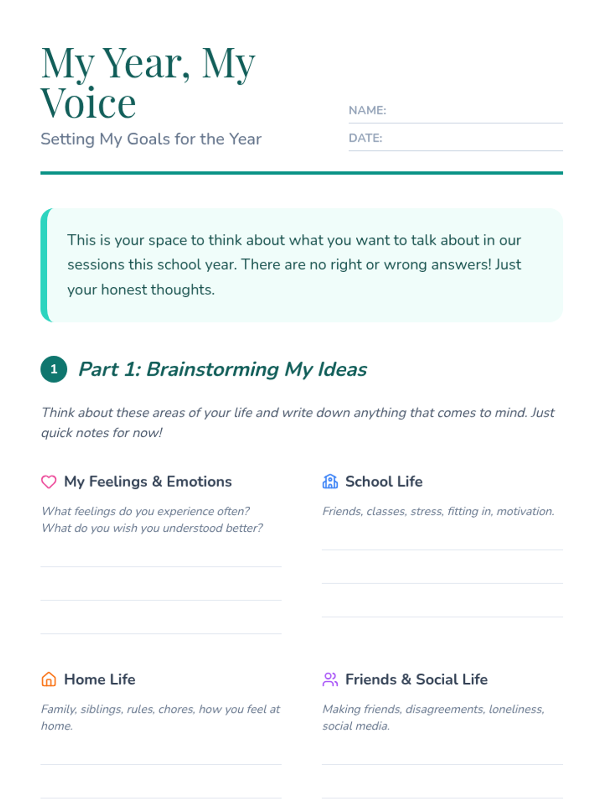 Counseling & Life SkillsSelf-AwarenessBasic Emotion RecognitionComplex Emotion IdentificationEmotional Nuance & Mixed FeelingsBuilding Positive Self-ImageRecognizing Strengths & Growth AreasAccurate Self-AssessmentPersonal Values IdentificationCultural & Individual Identity ExplorationValues-Based Decision MakingSelf-ManagementStop-and-Think StrategiesDelaying GratificationIndependent Impulse ManagementIdentifying Stress TriggersShort-Term Goal SettingSMART Goals DevelopmentGoal Monitoring & AdjustmentBuilding Perseverance & ResilienceInternal Motivation DevelopmentComprehensive Stress Reduction PlanningSocial AwarenessRecognizing Others' FeelingsDemonstrating EmpathyRespecting Individual DifferencesUnderstanding Cultural DiversityComplex Empathetic ResponsesMultiple Viewpoint ConsiderationMulti-Perspective AnalysisChallenging Stereotypes & BiasRelationship SkillsActive ListeningClear Verbal & Nonverbal CommunicationBuilding Positive FriendshipsWorking Cooperatively in GroupsCommunicating Personal BoundariesRespecting Others' BoundariesAssertive ExpressionPeaceful Problem-SolvingContributing to Team GoalsComplex Conflict NavigationMediation & NegotiationHealthy Romantic RelationshipsResponsible Decision-MakingDaily Problem IdentificationBrainstorming Multiple SolutionsEvaluating Pros & ConsRecognizing Risks & ConsequencesApplying Ethical FrameworksInformed Risk-Benefit DecisionsRoot Cause AnalysisMindfulnessMindful BreathingBody Scan MeditationDaily Mindfulness ApplicationDaily Self-Care RoutinesBalancing Life DemandsAdvocating for Wellness NeedsMental Health SupportUnderstanding Anxiety SymptomsWorry Management StrategiesProgressive Muscle RelaxationRecognizing Depression SignsBuilding Mood-Supporting RoutinesBehavioral Activation for MoodUnderstanding Grief StagesHealthy Grief CopingCreative Expression of LossBehavioral SupportDaily Check-In ProceduresDaily Goal Setting & ReviewRecognizing Escalation Warning SignsRequesting Breaks & SupportSelf-Calming During DistressUnderstanding Positive ReinforcementToken Economy ImplementationBehavior Chart TrackingAnalyzing Behavior PatternsIdentifying Antecedents & ConsequencesDetermining Behavior FunctionFunction-Based InterventionsIndividualized Behavior ContractsData-Driven Behavior AdjustmentTherapeutic ApproachesThoughts-Feelings-Behaviors ConnectionRecognizing Thinking PatternsChallenging Negative ThoughtsPositive Self-Talk PracticeThought Record TrackingAdvanced Cognitive RestructuringComprehensive CBT PlansBehavioral Activation TechniquesBuilding Positive ExperiencesExposure Hierarchies for AnxietyPresent-Moment AwarenessNon-Judgmental ObservationSelf-Soothing & DistractionComplex Emotion LabelingReducing Emotional Vulnerability (PLEASE)DEAR MAN CommunicationGIVE Skills for RelationshipsFAST Skills for Self-RespectRadical Acceptance PracticeCrisis Survival Skills (TIPP)Understanding Trauma EffectsTrauma Responses & TriggersIdentifying Trauma FeelingsGrounding TechniquesRegulation During Trauma DistressSafe Place VisualizationProcessing Through NarrativeDeveloping Trauma StoryPersonalized Safety PlanningGroup SupportTurn-Taking & SharingGroup Conversation SkillsSharing in Supportive EnvironmentLearning from Similar ChallengesBuilding Community & BelongingNavigating Peer RelationshipsGroup Skill PracticeGroup Mental Health EducationStress & Anxiety UnderstandingCrisis Support & SafetyKnowing When to Seek HelpIdentifying Mental Health CrisesGrounding During CrisisUsing Crisis HotlinesBuilding Support NetworksAccessing Mental Health ResourcesWarning Signs & Coping StrategiesDeveloping Personal Safety PlansUnderstanding Suicide Warning SignsGatekeeper Skills for PeersDigital LiteracySocial MediaTechnology BasicsProductivity ToolsInternet and Online ResearchWeb Design and PublishingDigital CitizenshipOnline Safety and PrivacyEmerging TechnologiesFinancial LiteracyMaking Financial DecisionsBanking and AccountsConsumer SkillsSaving and InvestingCredit and DebtEmployment and IncomeTaxesInsuranceMajor PurchasesEconomic ConceptsFinancial PlanningCollege & Post-Secondary PlanningCareer ExplorationUnderstanding Post-Secondary OptionsCollege Research & SelectionAdmission RequirementsCollege Application ProcessPersonal Statement WritingFAFSA CompletionScholarship Search & ApplicationsUnderstanding Student LoansContinuing Education PlanningInterview PreparationResearching EmployersCommon Interview QuestionsSTAR Method ResponsesProfessional Interview PresenceVirtual Interview SkillsInterview Follow-UpJob Search SkillsUnderstanding Job PostingsEffective Job Search StrategiesNetworking for OpportunitiesResume Writing BasicsAction Verbs & AchievementsTailoring Resumes to JobsCover Letter WritingProfessional ReferencesProfessional CommunicationBusiness Email EtiquettePhone & Voicemail ProfessionalismMeeting ParticipationPresentation SkillsProfessional Work EthicTime Management & ProductivityTeamwork & CollaborationAdaptability & FlexibilityProblem-Solving at WorkConstructive FeedbackWorkplace RightsUnderstanding Employment LawsPay & Benefits UnderstandingWorkplace SafetyAnti-Discrimination & Harassment