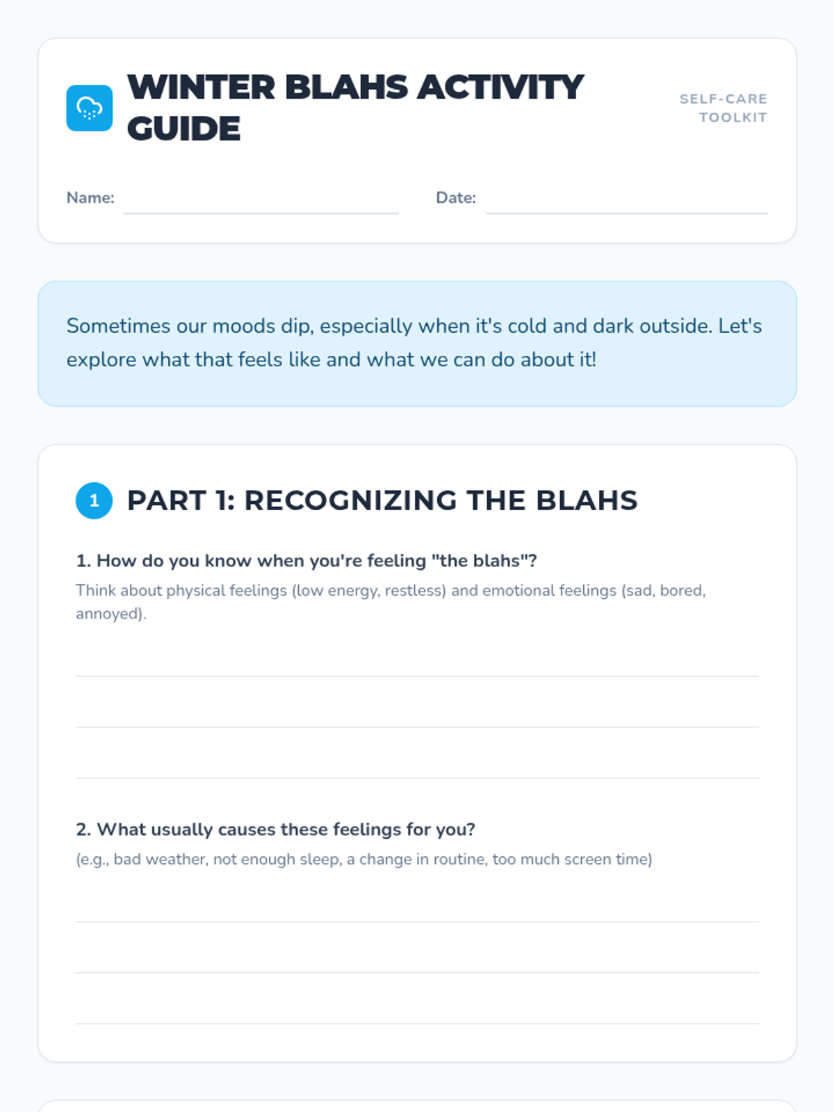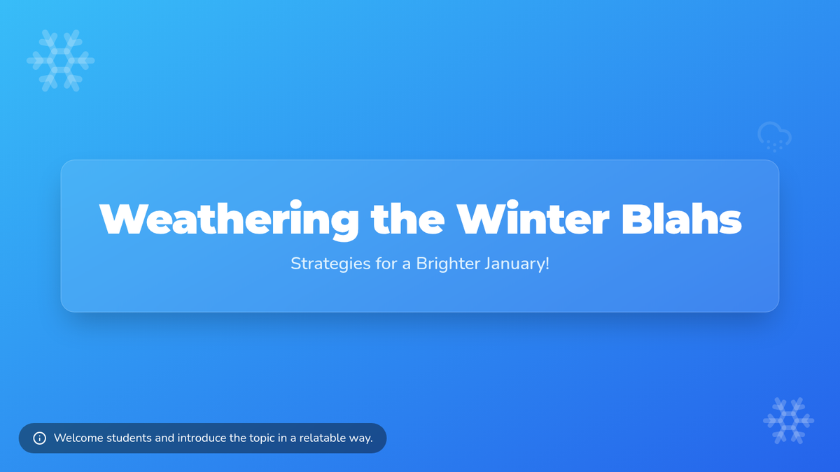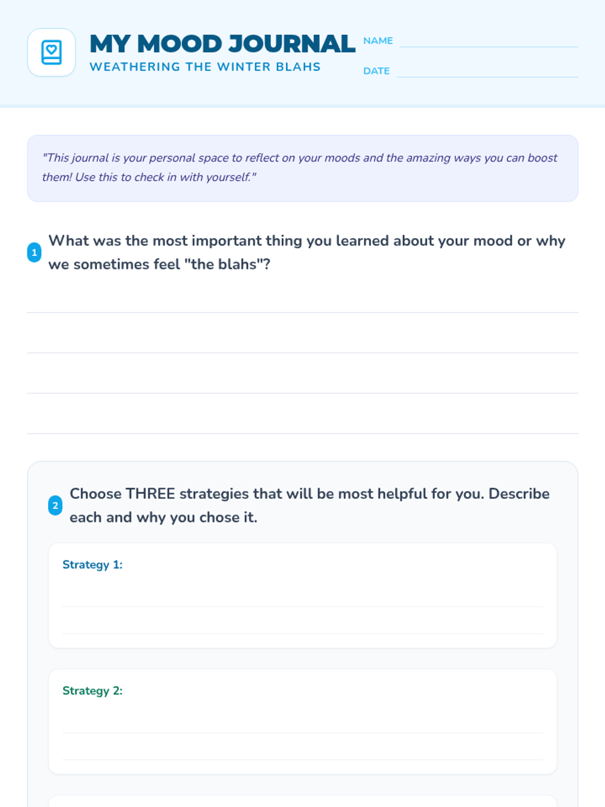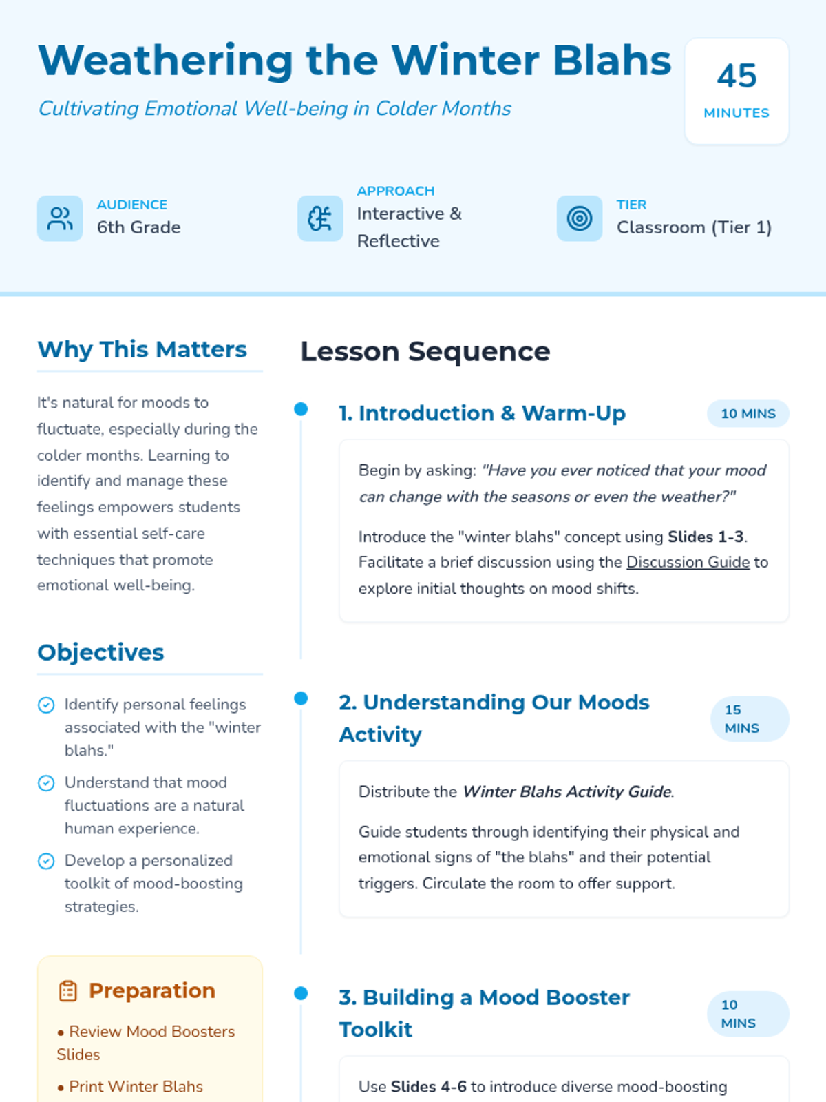 A 45-minute social-emotional learning lesson for 6th graders to identify 'winter blahs' and build a personal toolkit of mood-boosting strategies.