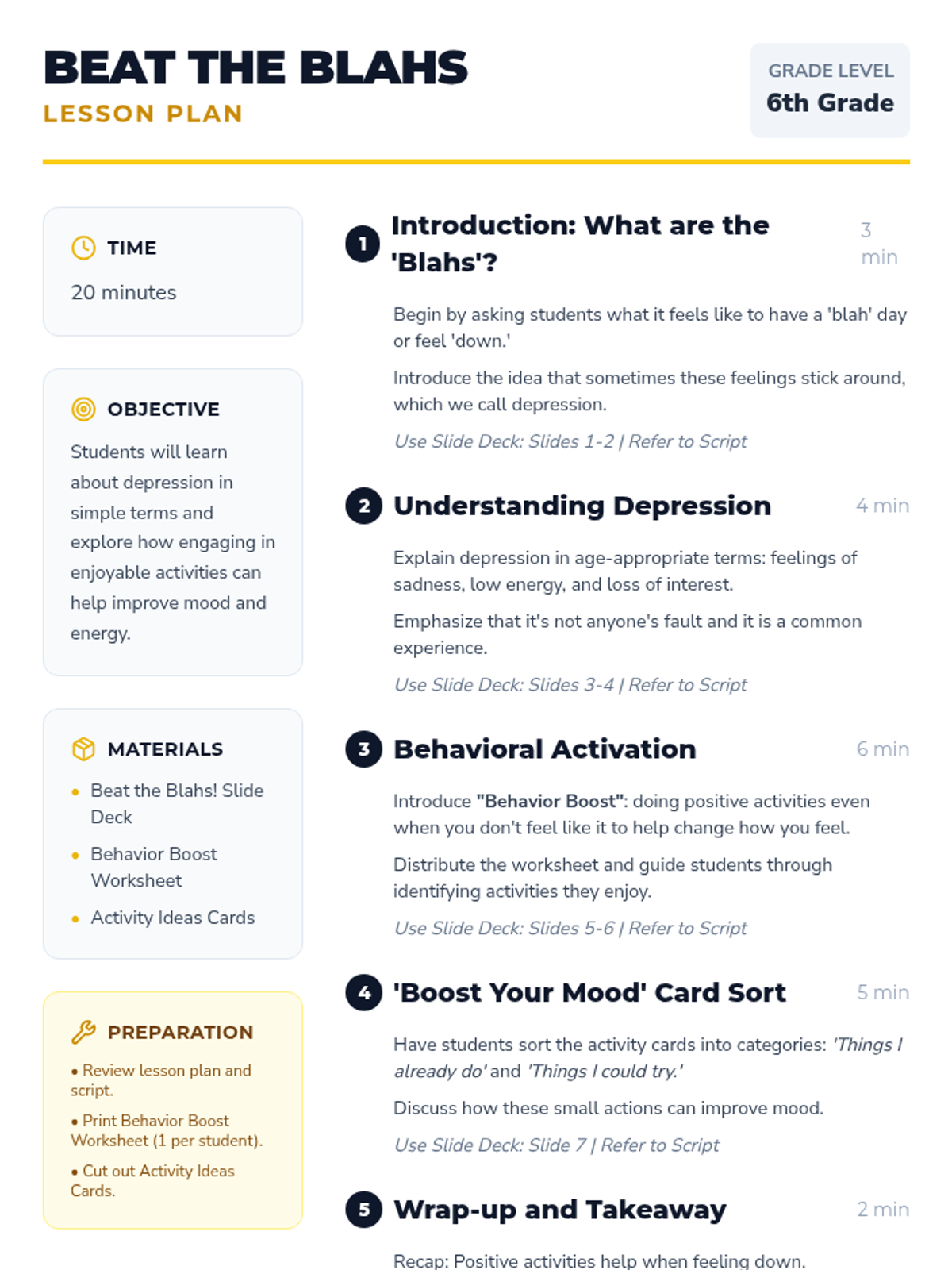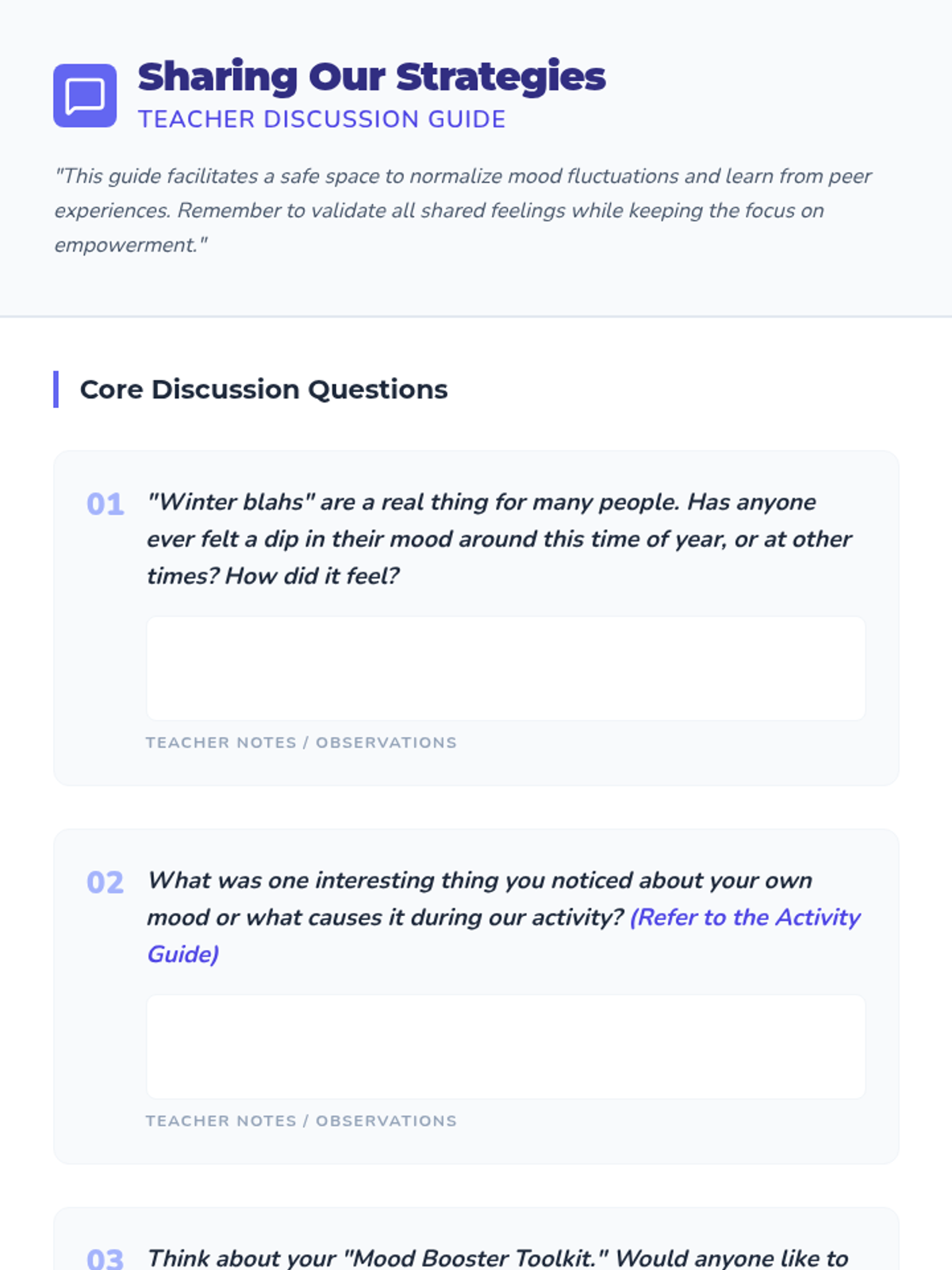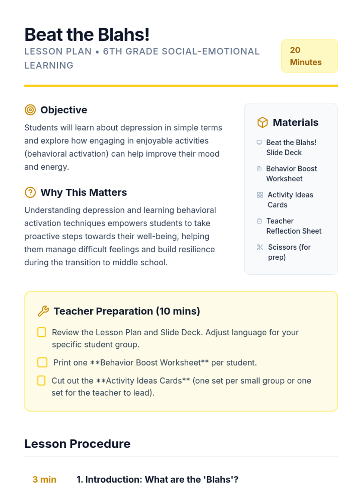 A 45-minute social-emotional learning lesson for 6th graders to identify 'winter blahs' and build a personal toolkit of mood-boosting strategies.