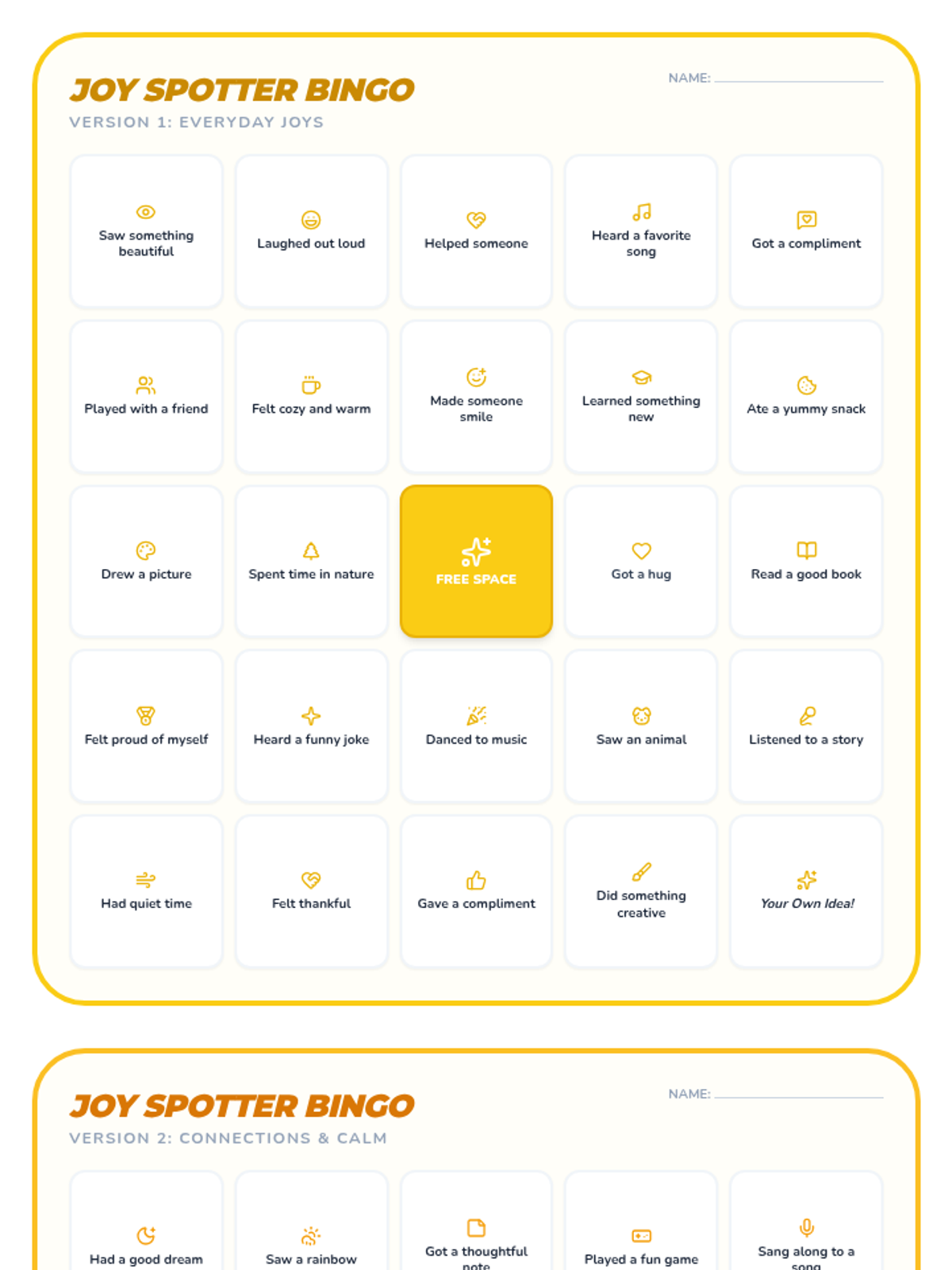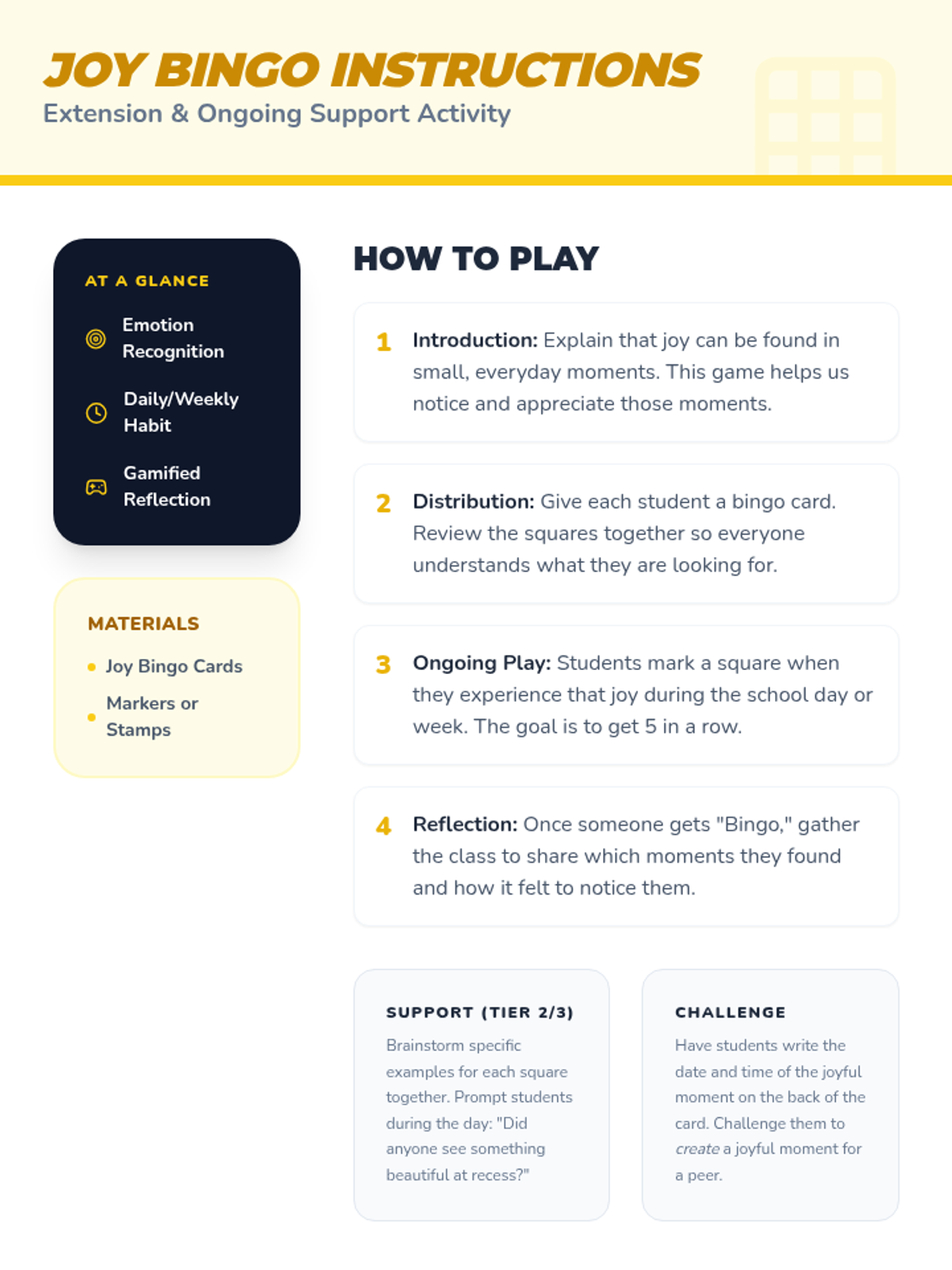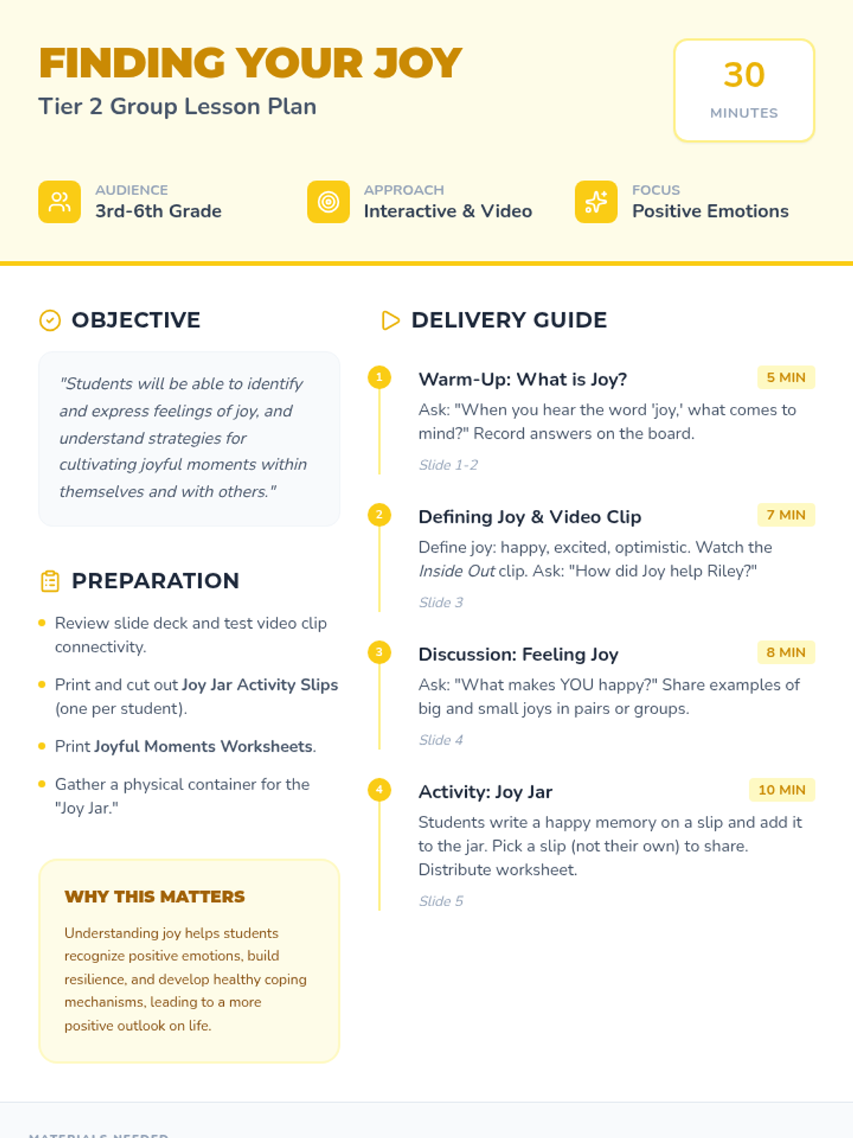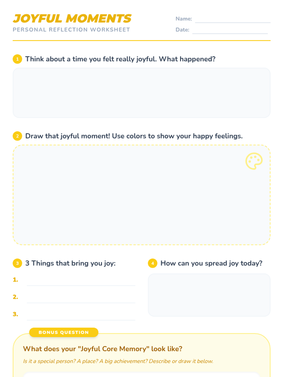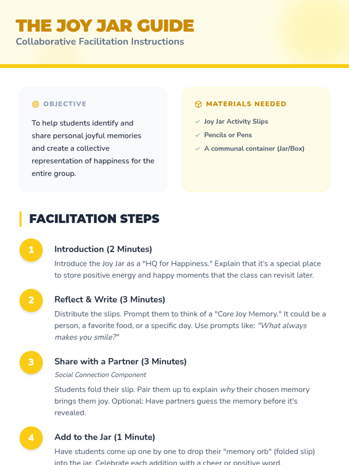 Inspire students to identify and actively seek out sources of joy in their daily lives, cultivating an optimistic and resilient mindset through interactive activities and reflection.