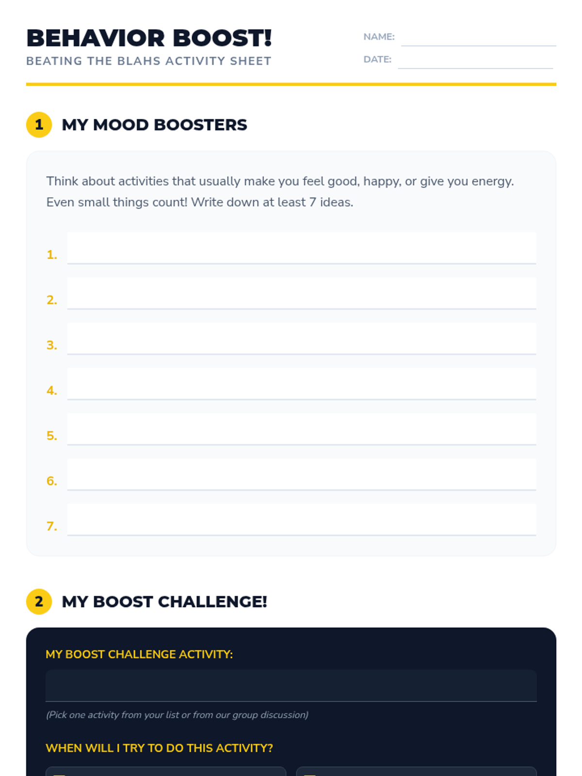 Students participate in a discussion and mapping activity to visualize the cycle between thoughts, feelings, and behaviors. They identify how doing nothing often leads to feeling worse (the downward spiral) and how small actions can reverse this.