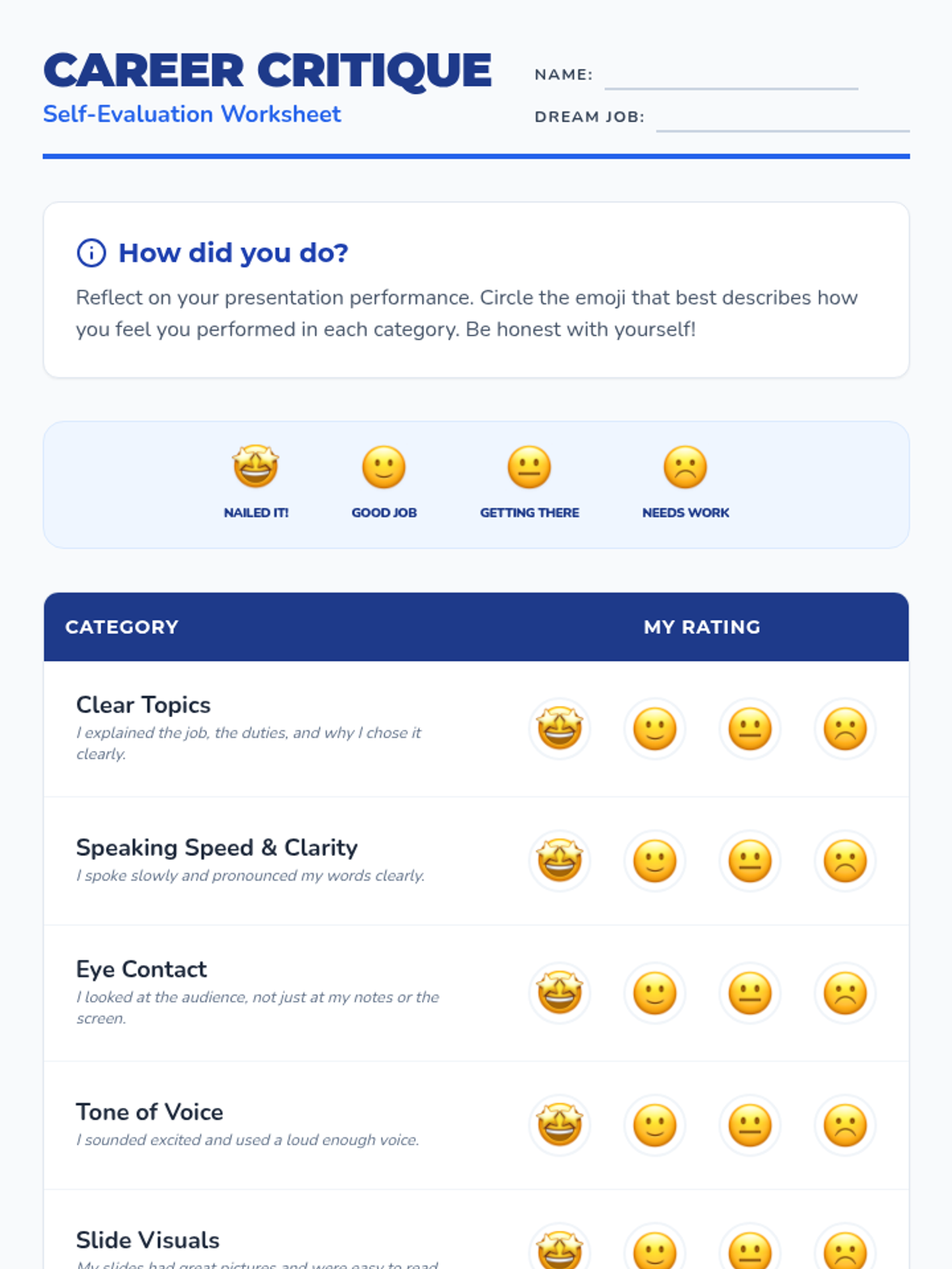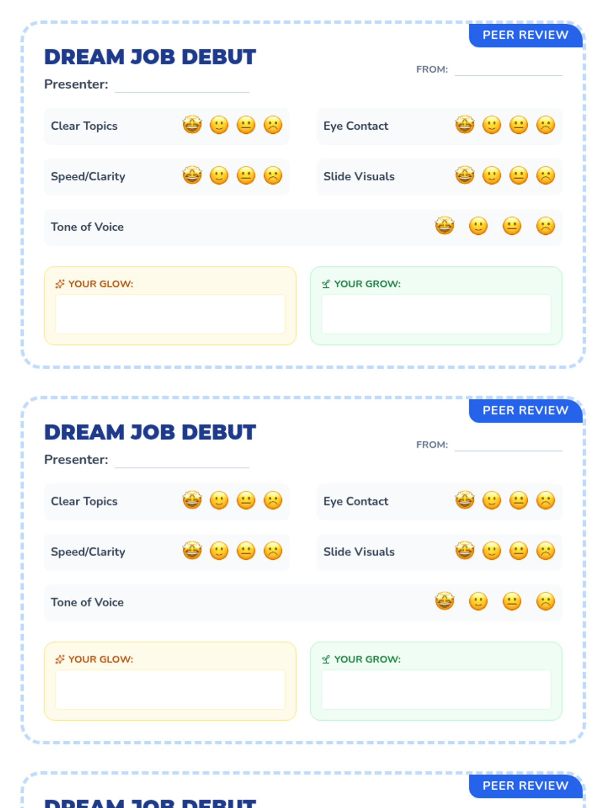 A lesson focused on presenting dream career research and providing constructive feedback through self-reflection and peer evaluation.