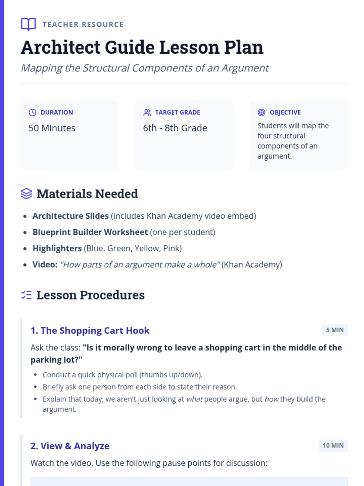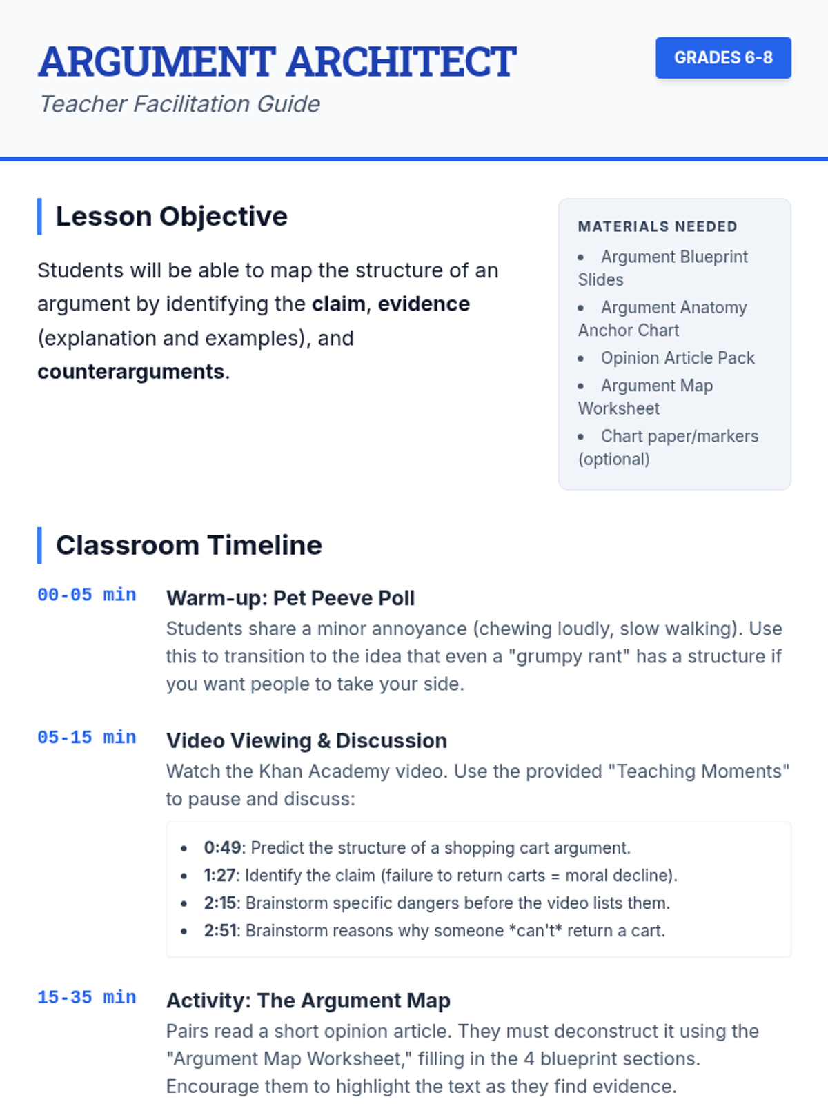 A middle school lesson focused on analyzing the structure of an argument (Introduction, Expansion, Examples, and Counter-argument) using a Khan Academy video and a relevant editorial text.