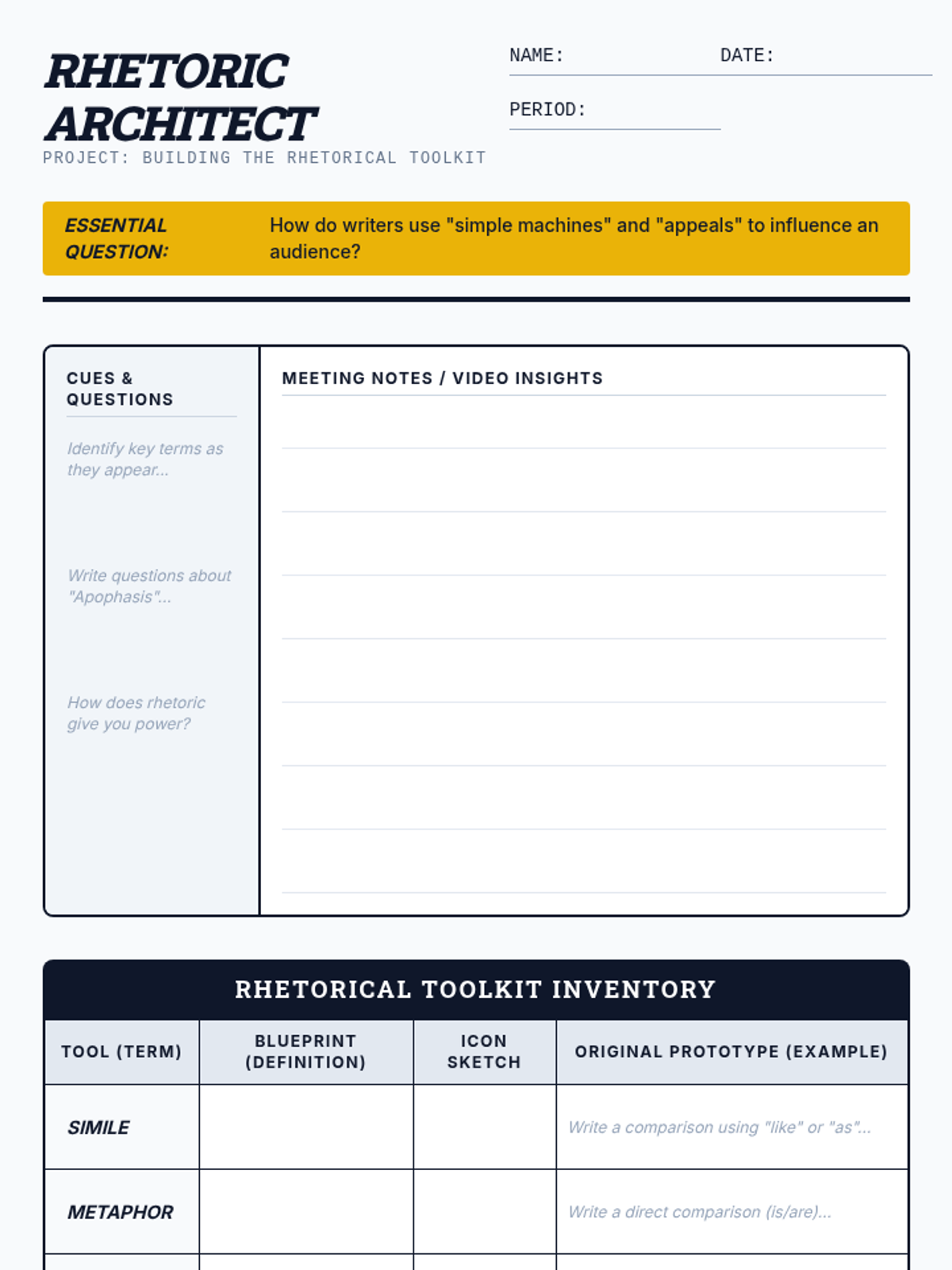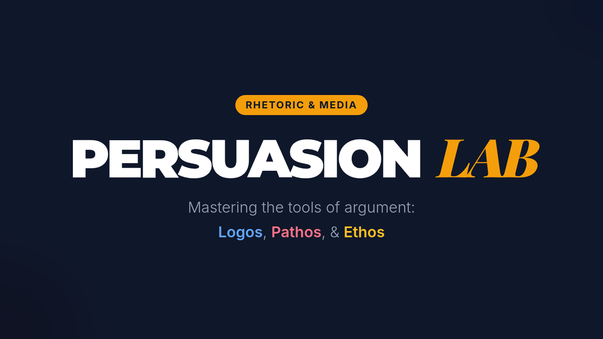 Students explore the fundamentals of rhetoric through video analysis and collaborative poster creation, mastering rhetorical devices (simile, metaphor, hyperbole) and appeals (ethos, logos, pathos) to build a 'Rhetorical Toolkit'.