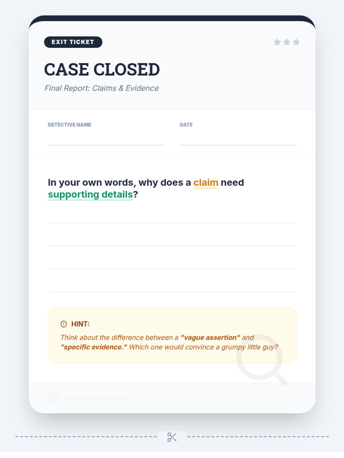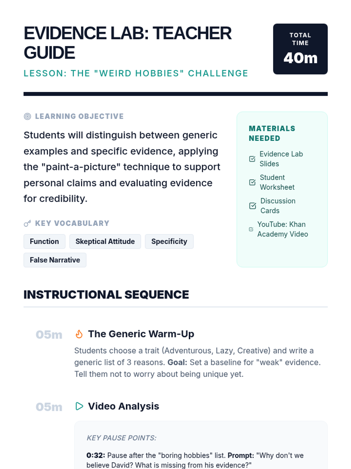 A 6th-grade lesson on distinguishing between anecdotal and solid evidence to build persuasive arguments. Students analyze a video case study, evaluate evidence types, and write a courtroom-style closing argument for a fictional 'crime.'