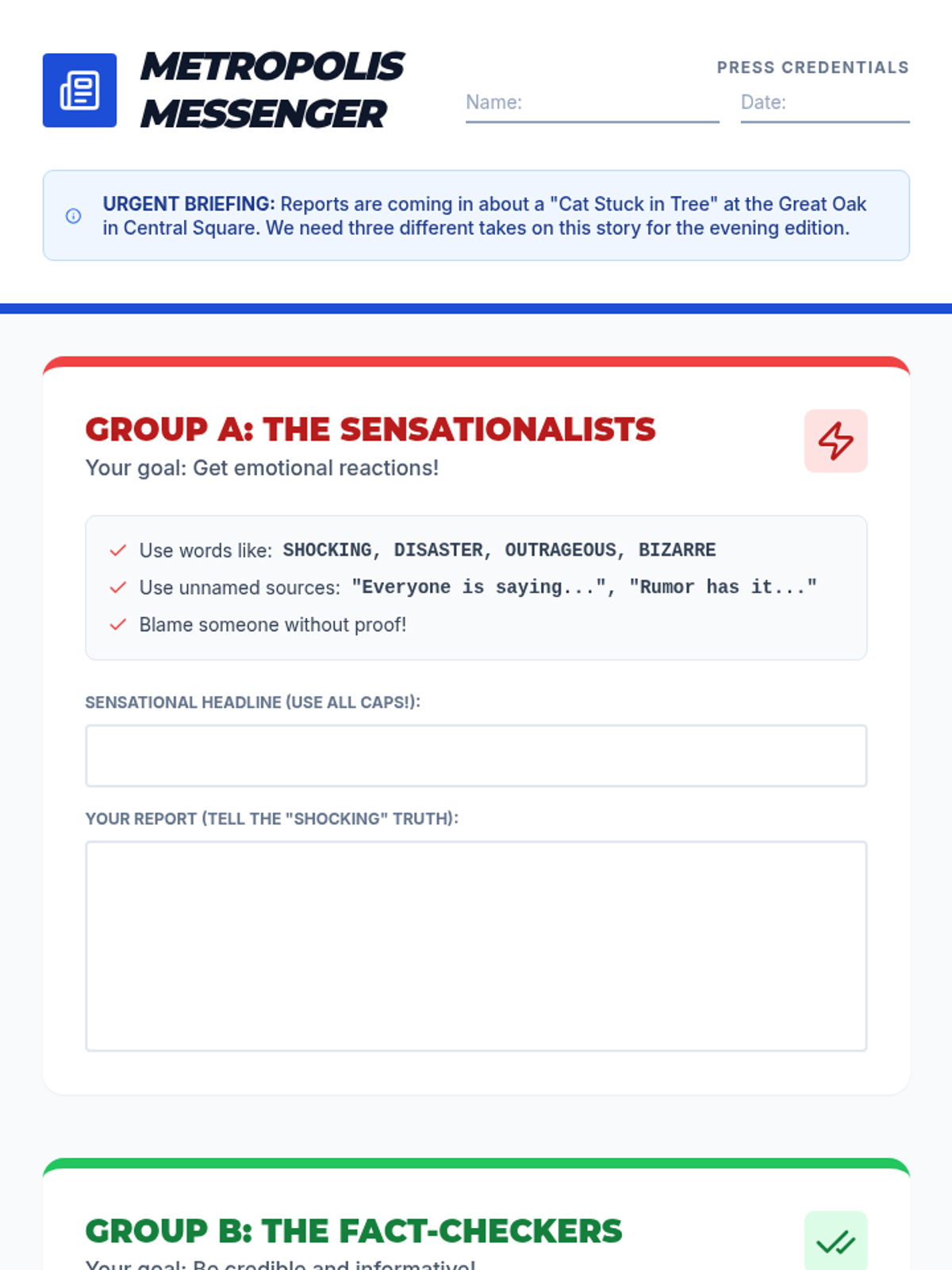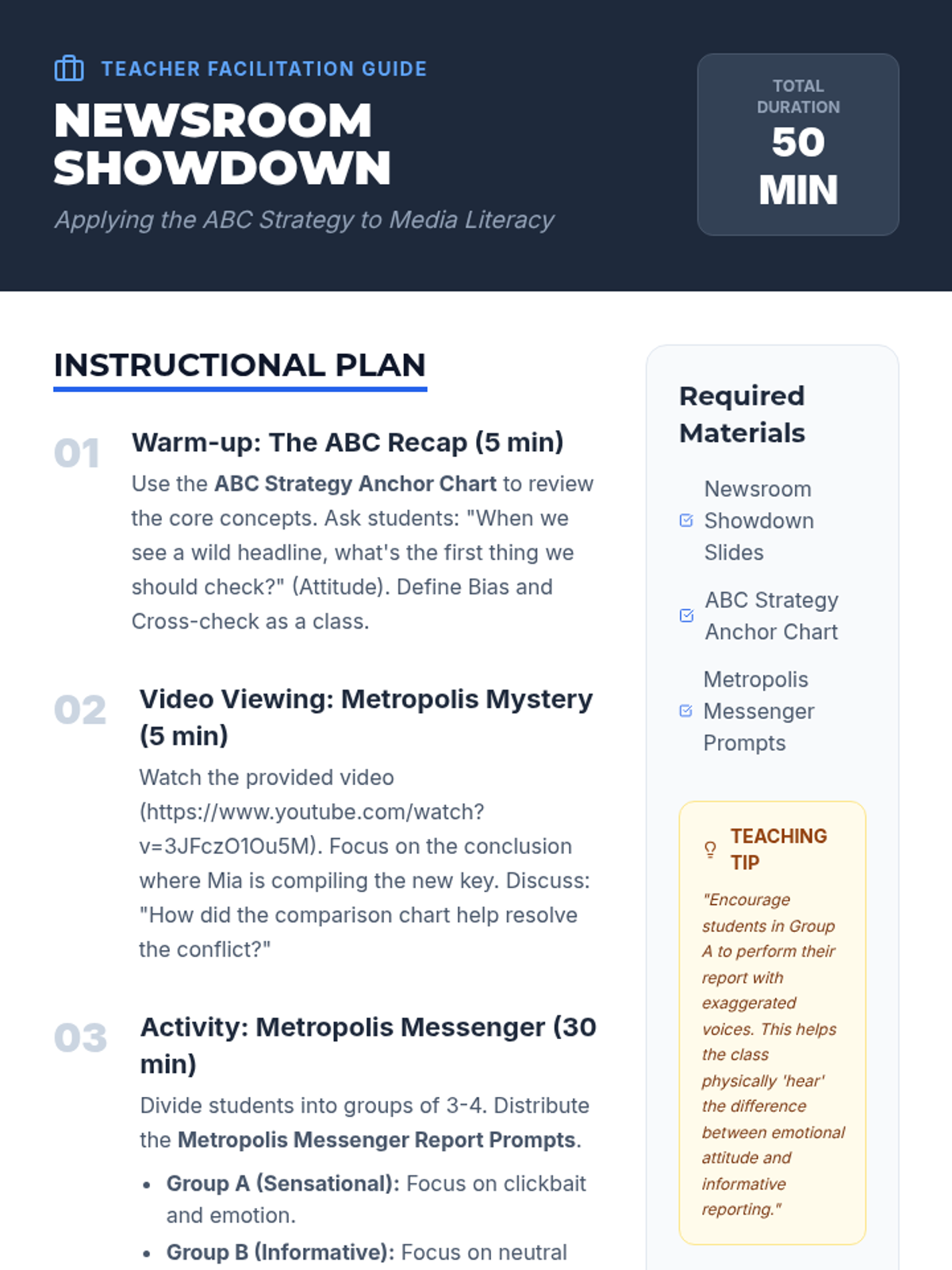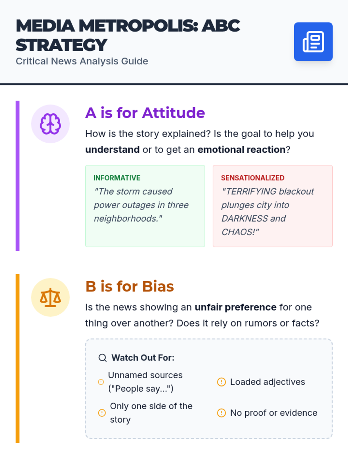 A journalism-themed lesson where students apply the ABC strategy (Attitude, Bias, Cross-check) to create and analyze news reports about a local event in Media Metropolis.