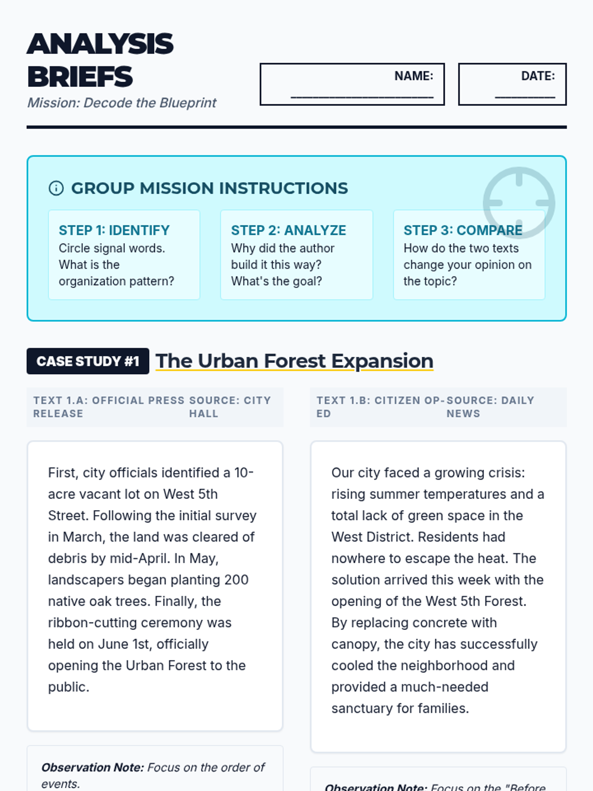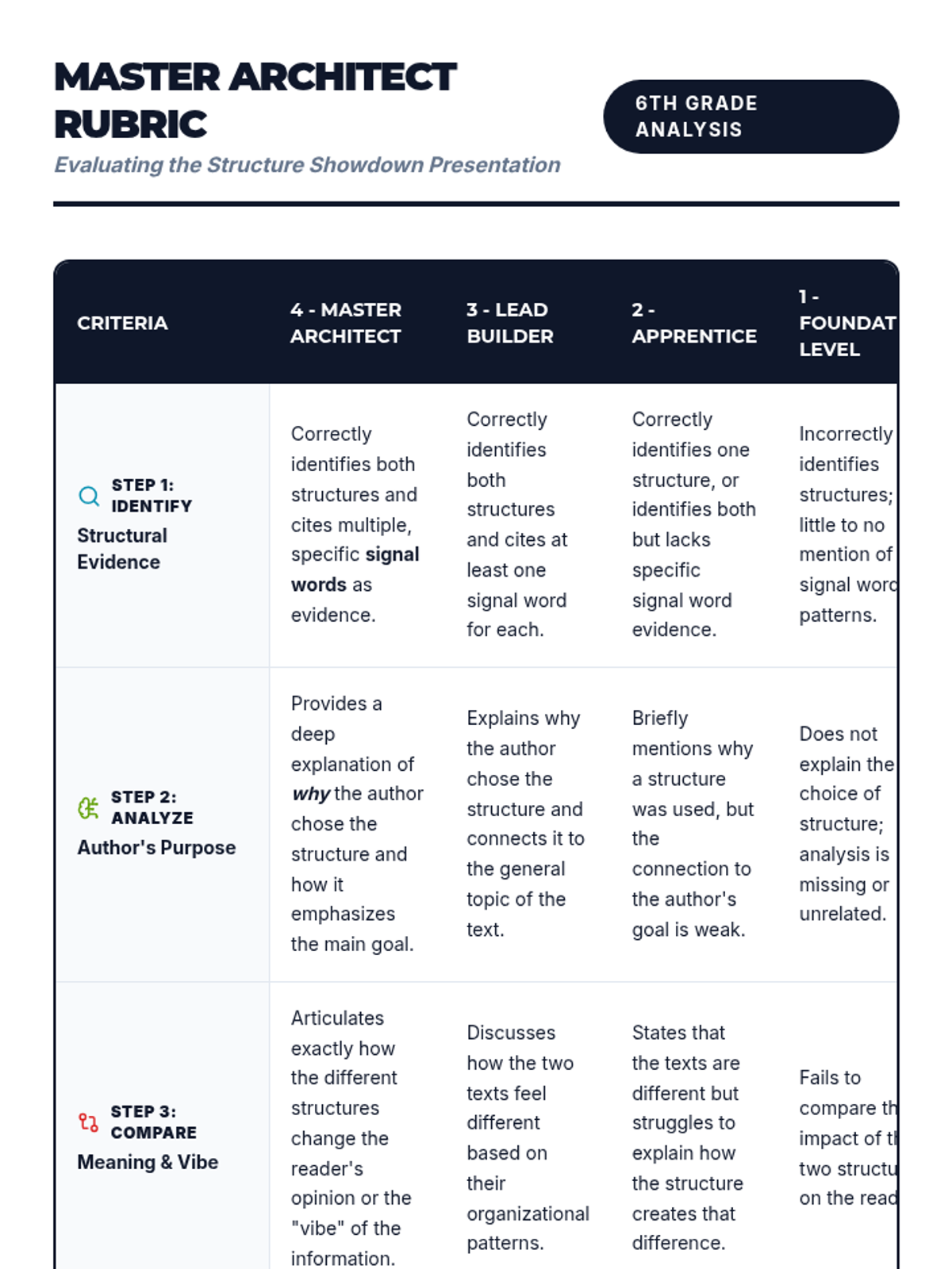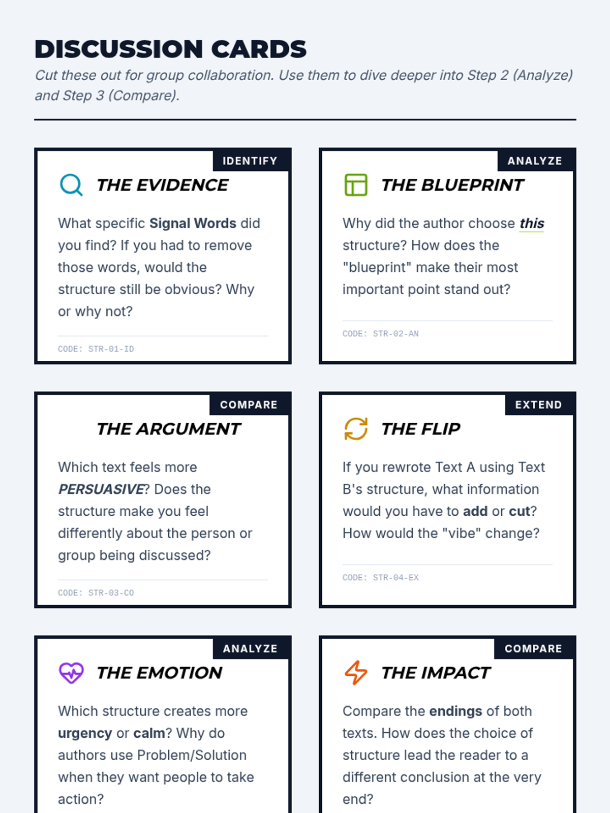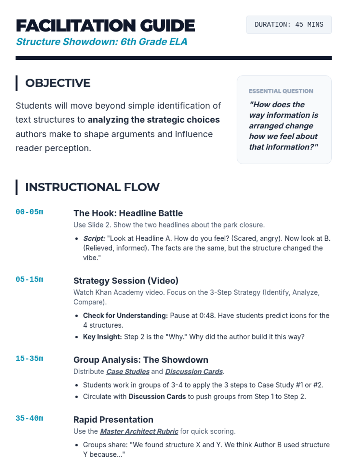 In this lesson, students will learn to analyze and compare text structures (Chronology, Cause/Effect, Problem/Solution, and Comparison) to understand how organizational choices shape an author's argument and influence the reader.
