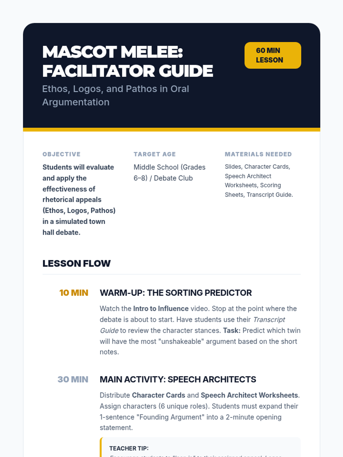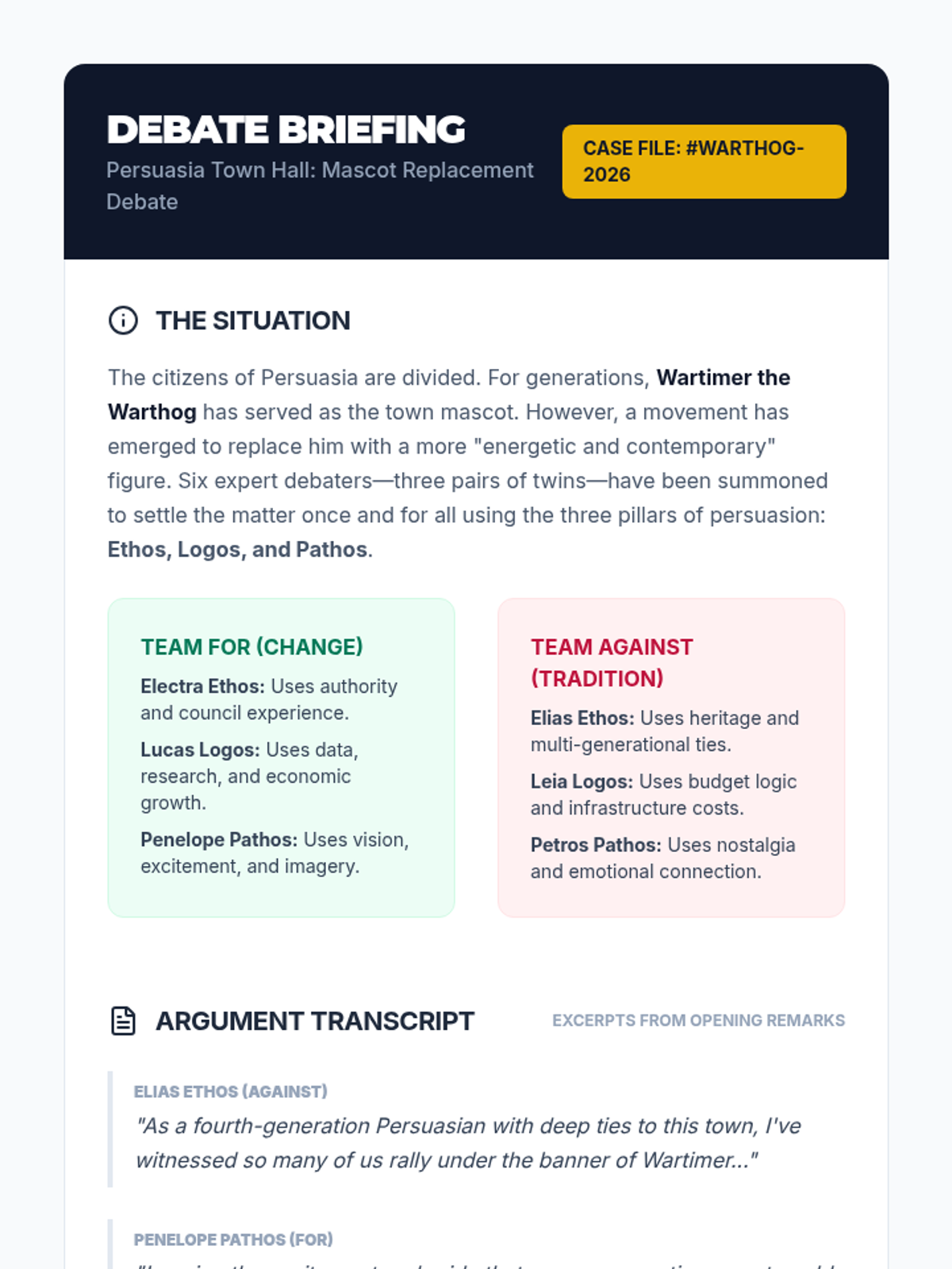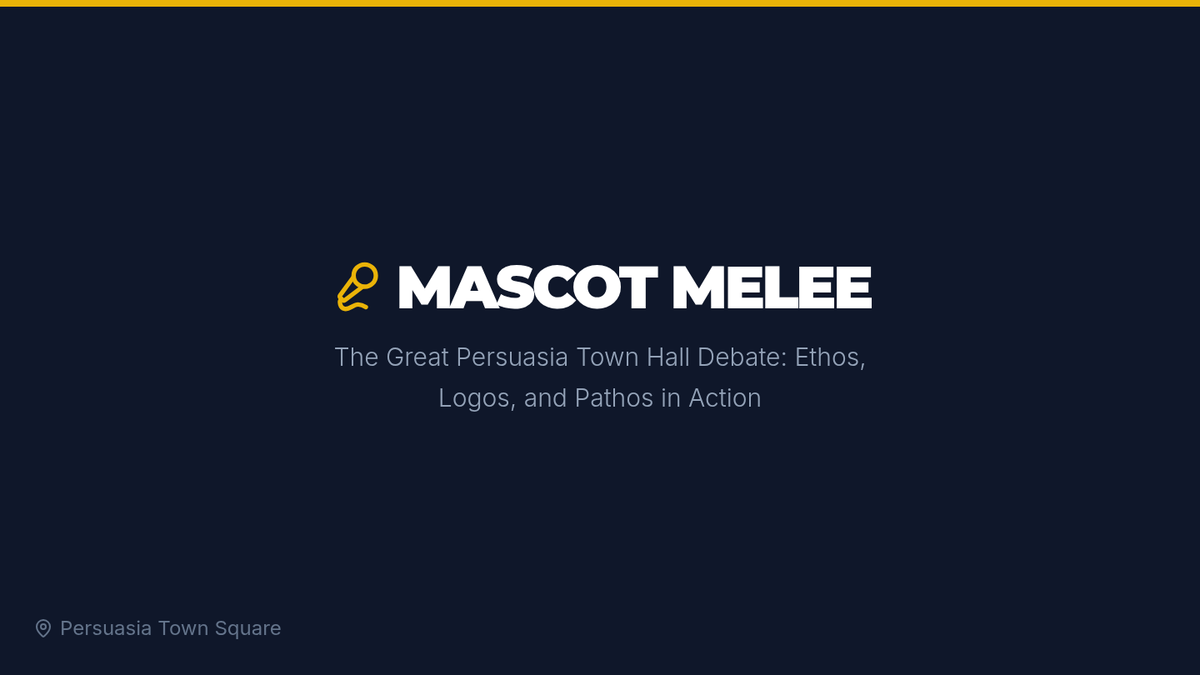 A high-energy debate lesson where students roleplay as characters from the city of Persuasia to argue for or against replacing the town mascot, Wartimer the Warthog. Students will analyze rhetorical appeals (Ethos, Logos, Pathos) and expand short arguments into full-length opening statements.