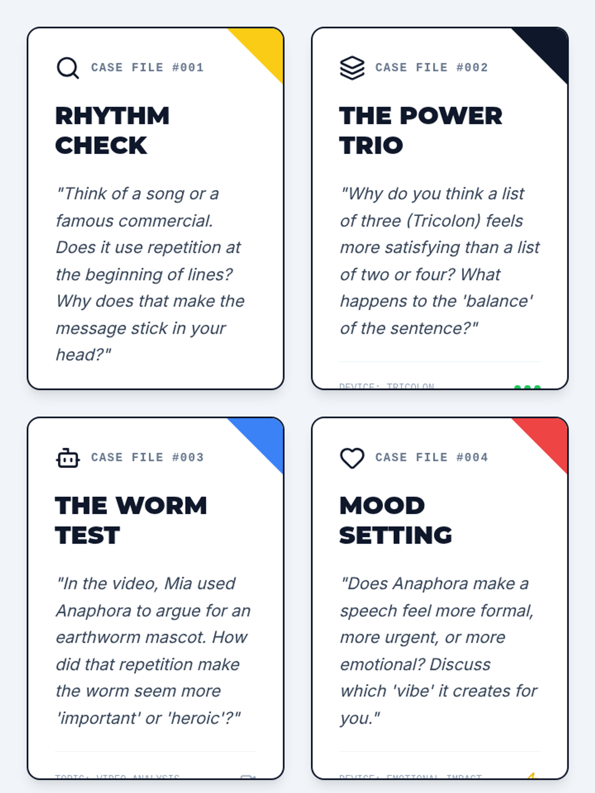Students will learn to identify and apply anaphora and tricolon in persuasive writing, using examples from the 'Persuasive Power' video and historical speeches. This lesson includes a video analysis, a 'Rhetoric Detectives' identification activity, and a creative writing application.