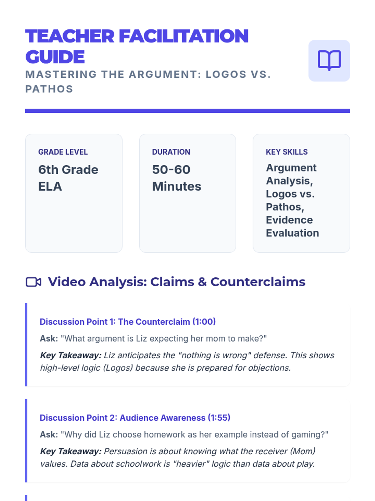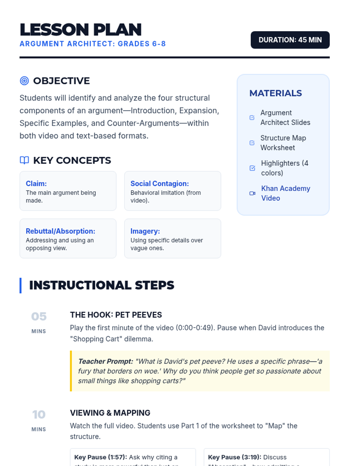 Students will learn to identify and analyze the four key structural components of an argument: Introduction, Expansion, Examples, and Counter-arguments. This lesson uses a humorous podcast-style video to anchor the concepts before applying them to a new text.