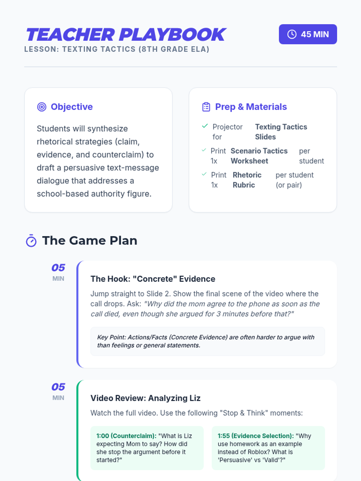 Students learn rhetorical strategies (claim, evidence, and counterclaim) by analyzing a video about a failing phone and then applying those skills to write a text-message dialogue between a student and a principal.