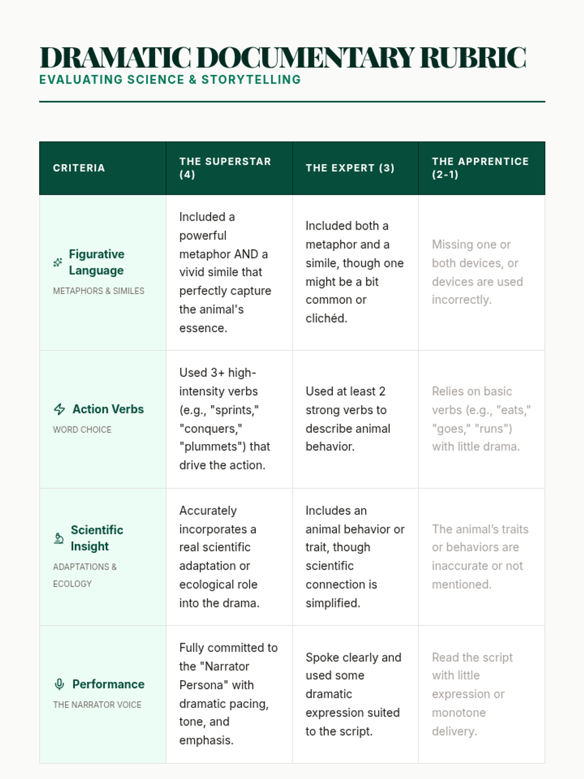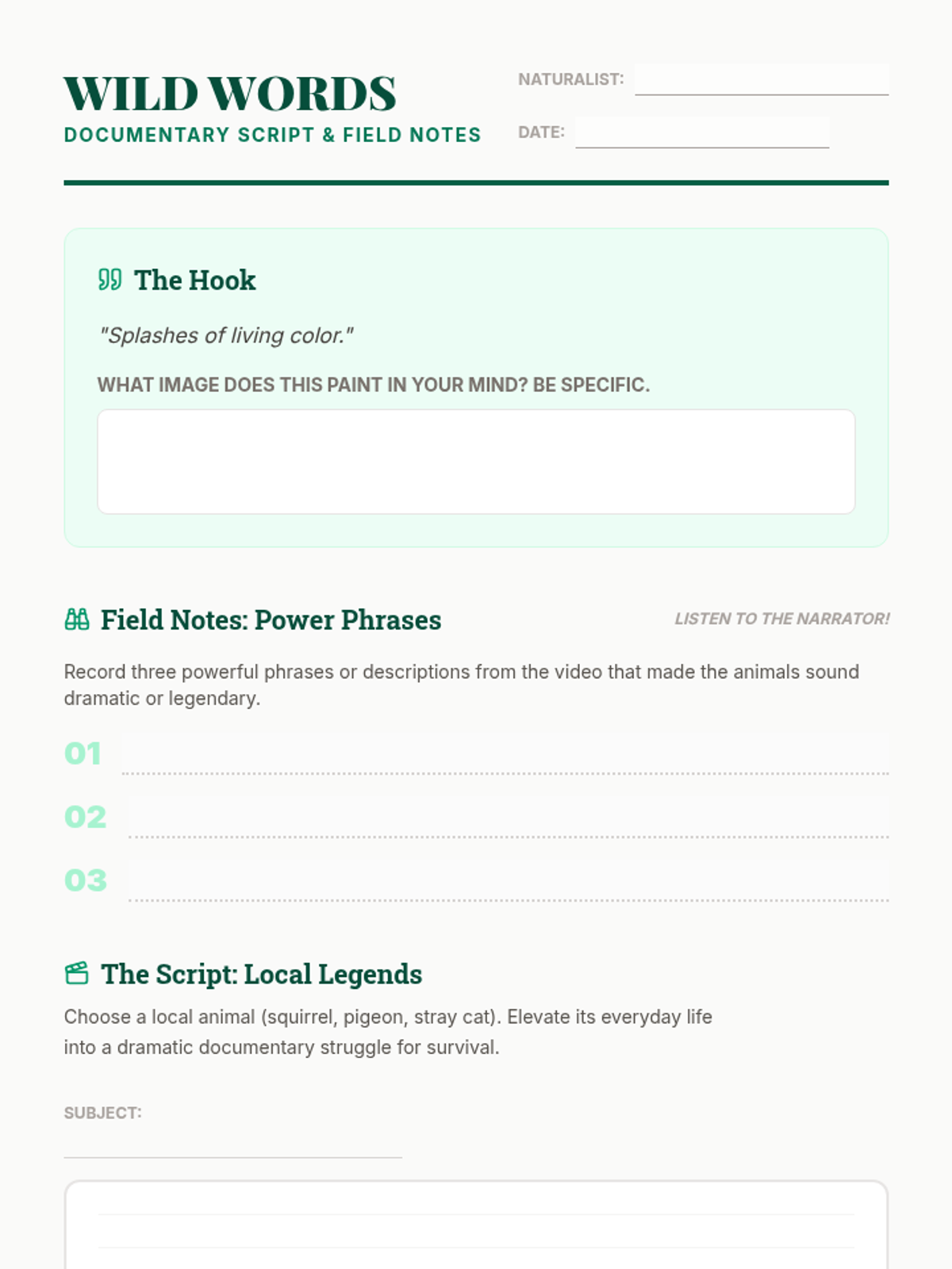 A creative writing and science lesson where students analyze the dramatic language of nature documentaries to craft their own scripts about local wildlife. Students use metaphors, similes, and vivid verbs to transform everyday animals into prehistoric-style protagonists.