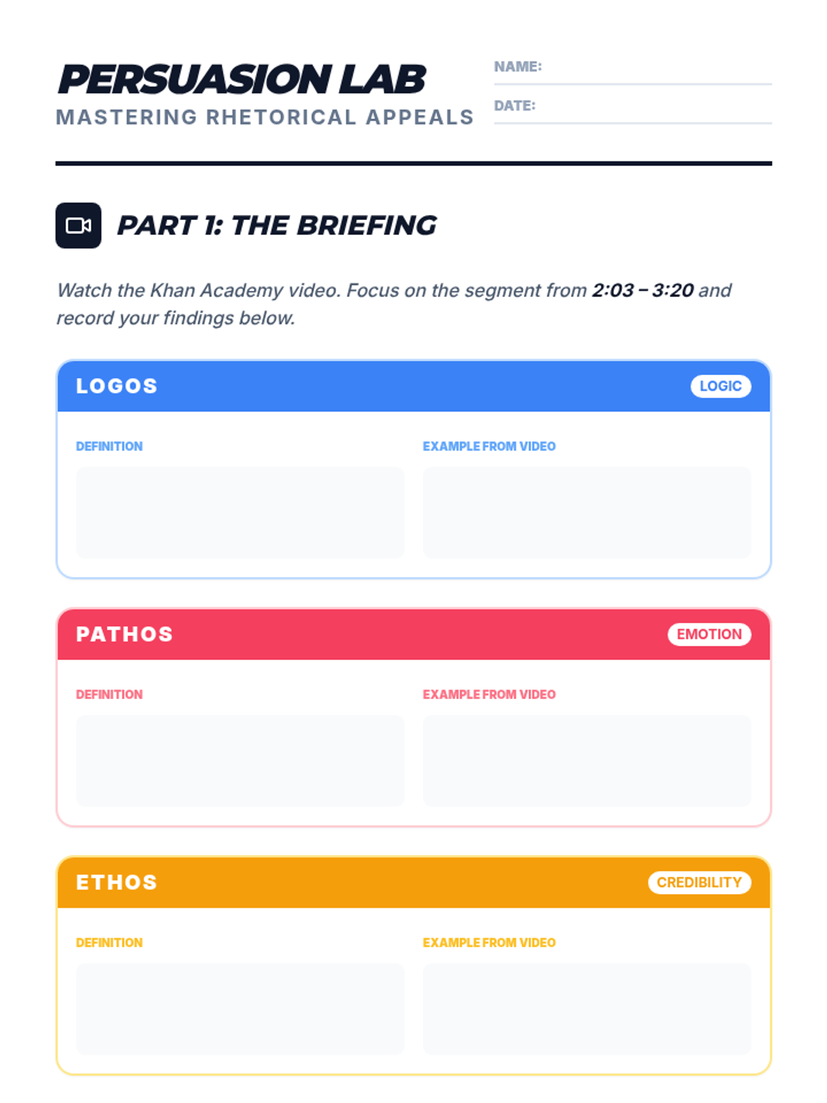 Students will learn the three rhetorical appeals (Ethos, Pathos, and Logos) through a Khan Academy video and apply their knowledge by analyzing and sorting media advertisements.