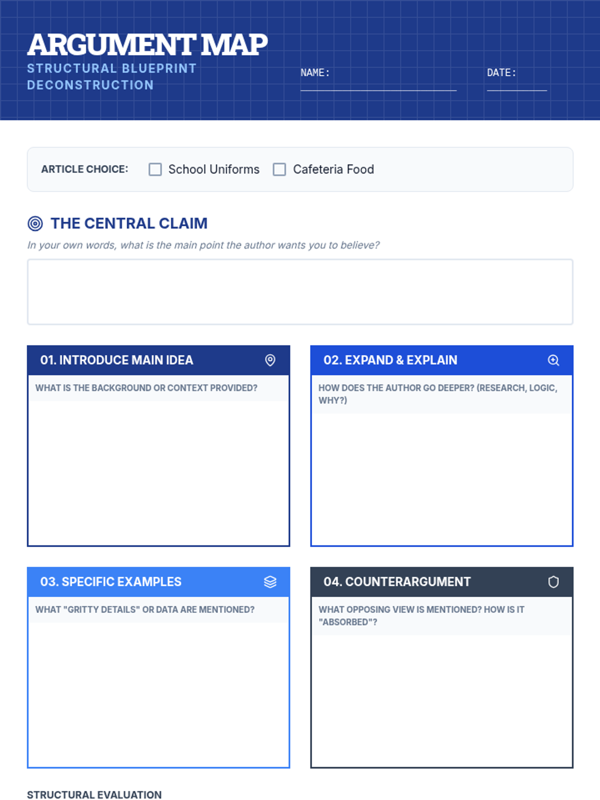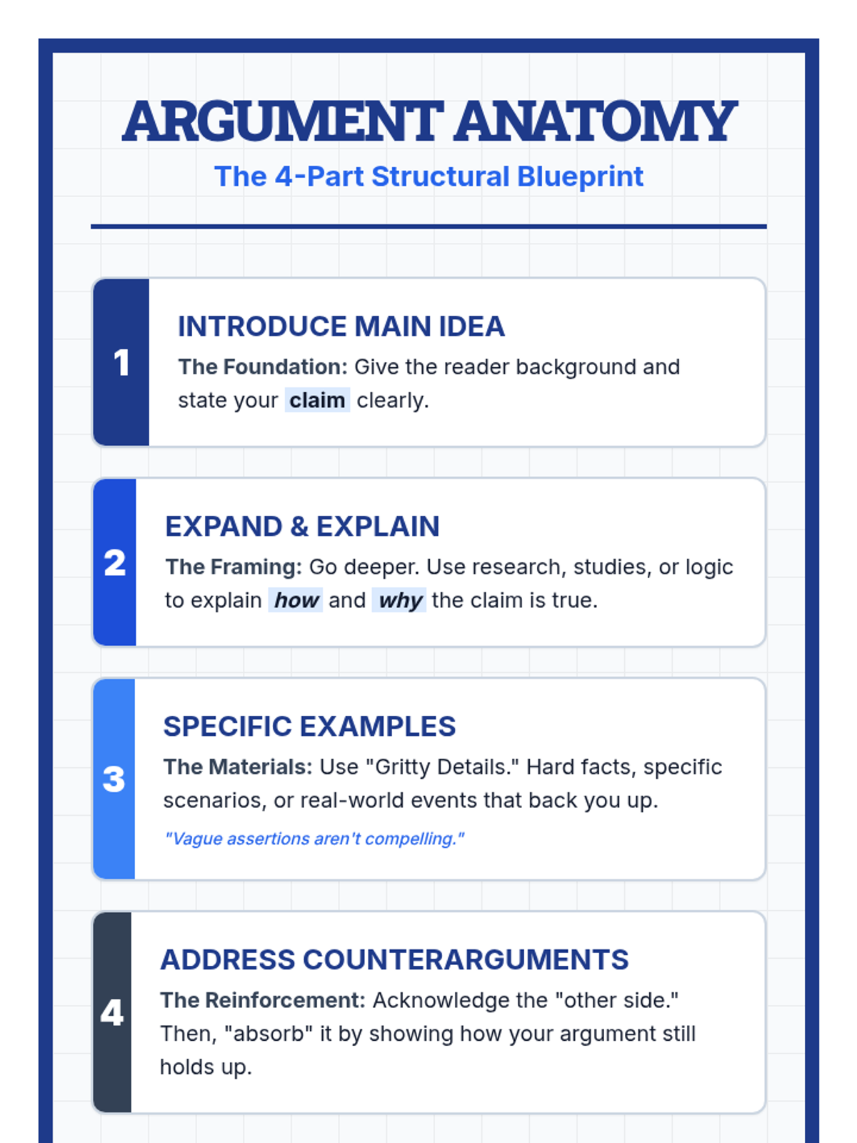 Students will learn to deconstruct arguments into four key components—Introduction, Expansion, Examples, and Counterarguments—using a Khan Academy video and short opinion articles to map the structural 'blueprint' of persuasive writing.