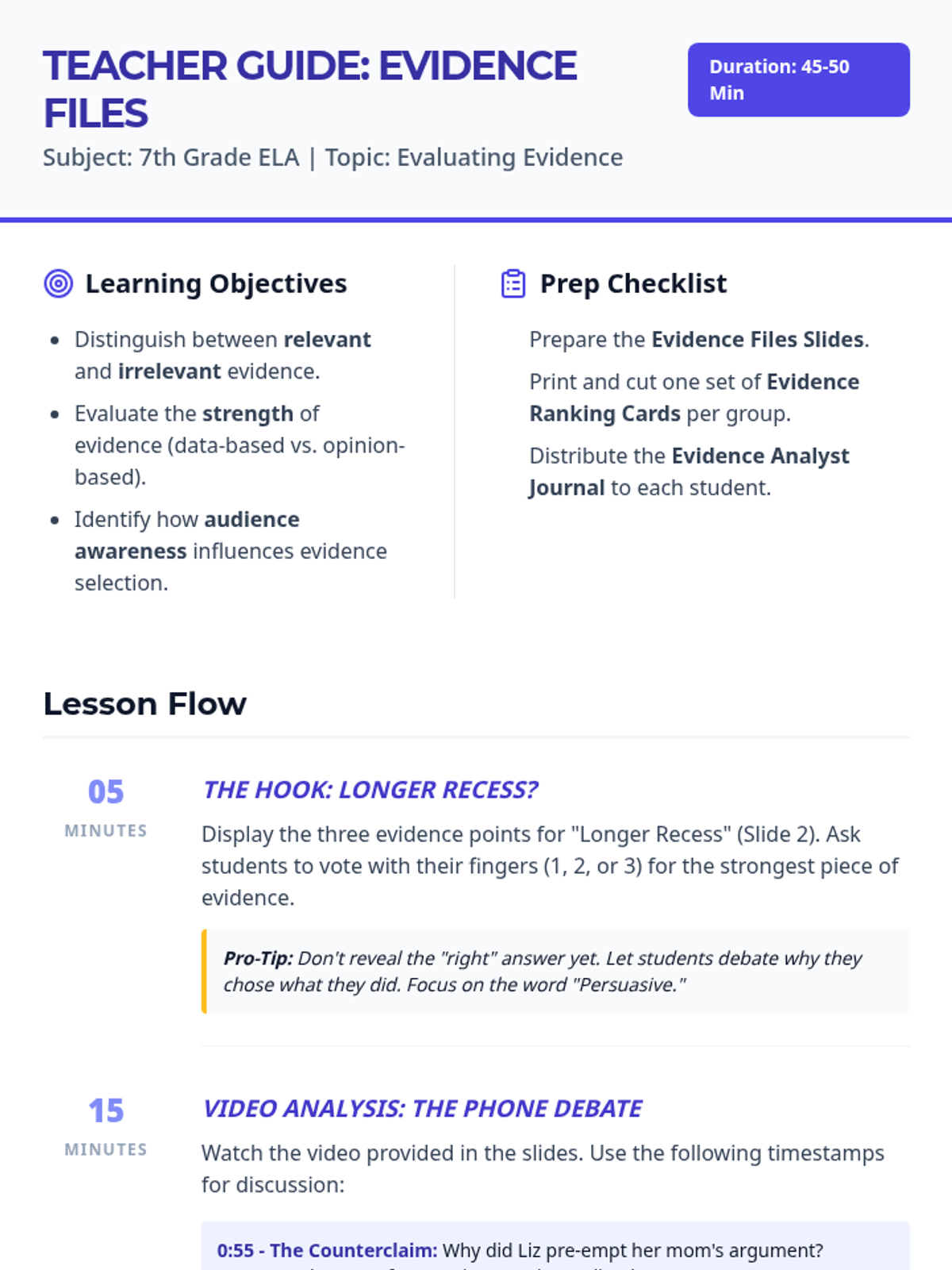 Students will learn to evaluate the strength and relevance of evidence within an argument by analyzing a real-world scenario (the 'phone debate') and sorting evidence for a claim about school start times.