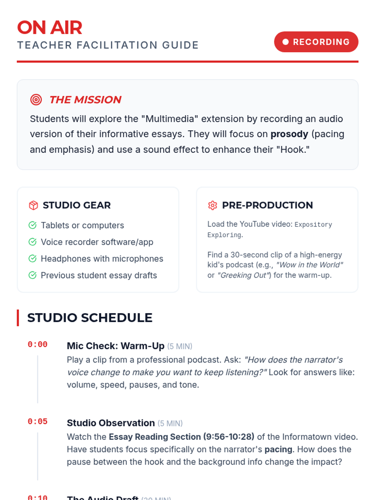 Students transform their informative essays into engaging audio recordings by focusing on prosody, pacing, and sound effects, based on the 'Multimedia' extension from the Informatown series.