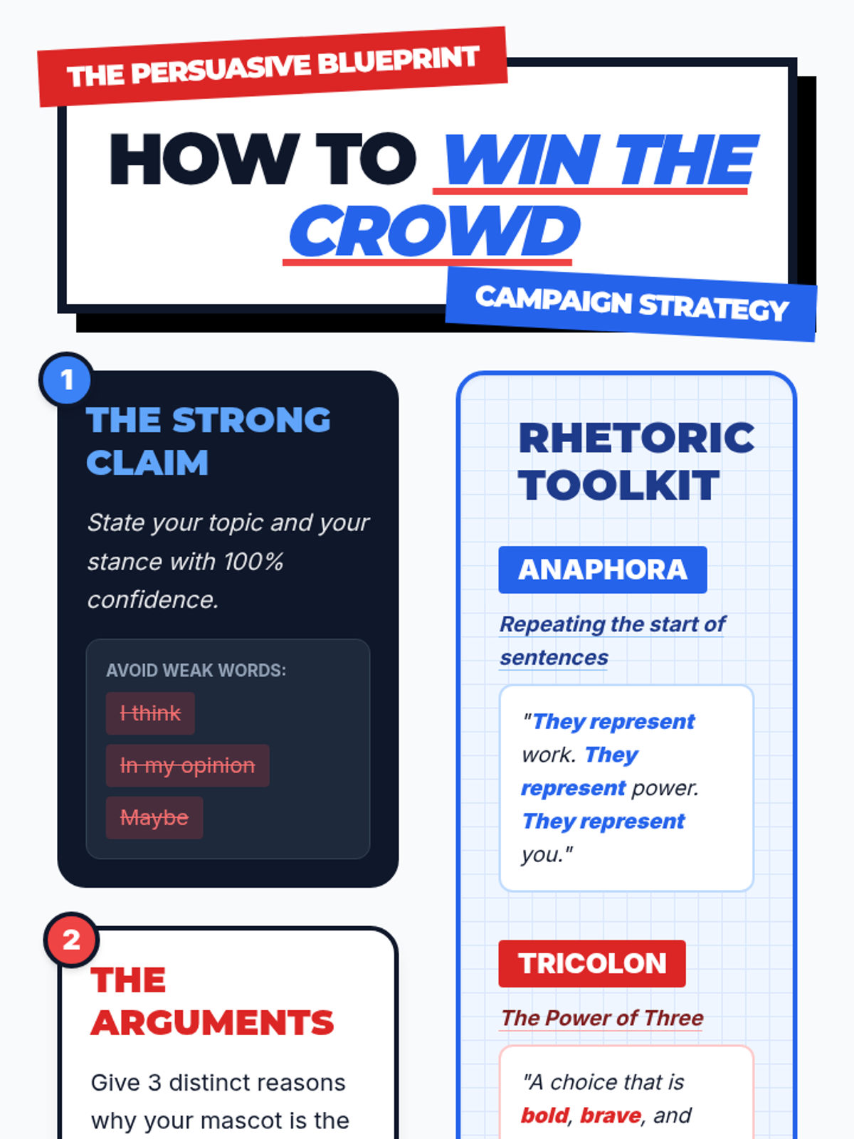 A persuasive writing lesson where students design a new school mascot and create a campaign poster using claims, arguments, and rhetorical devices like anaphora and tricolon.