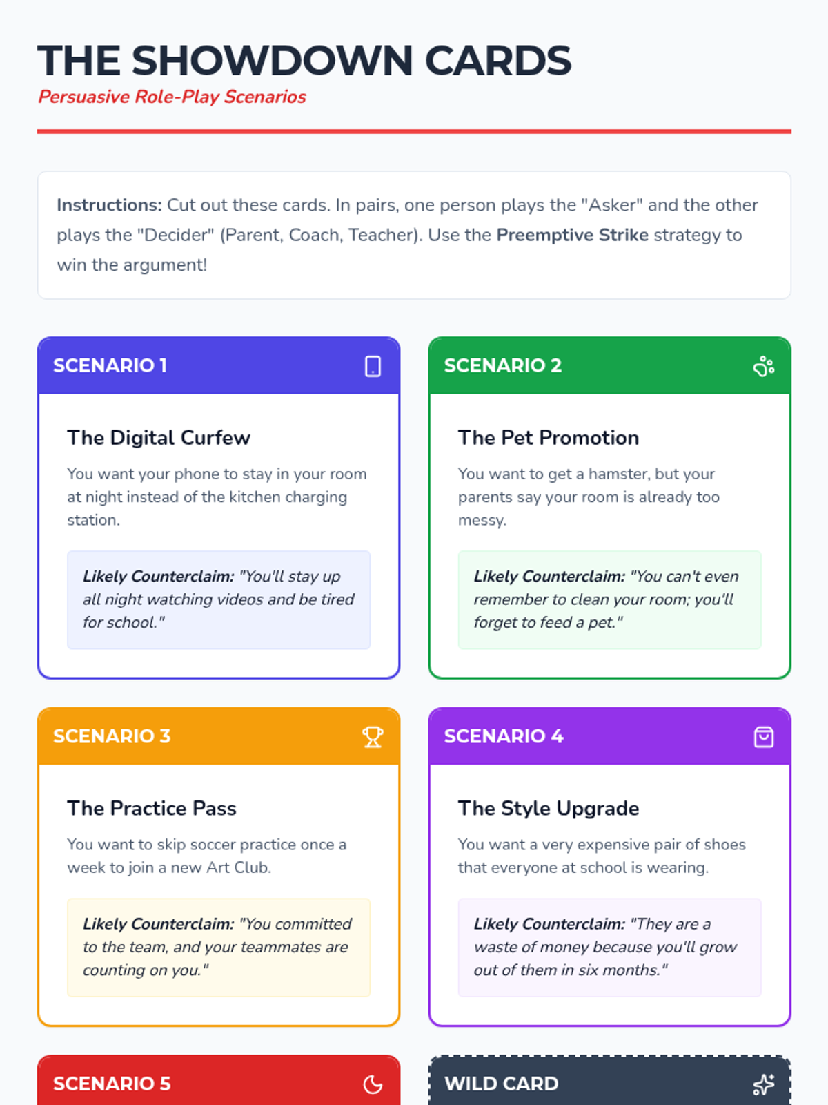 A lesson focused on the art of persuasion by practicing the skill of playing 'devil's advocate' to strengthen counter-argument skills. Students will use task cards to challenge popular opinions and build robust rebuttals.