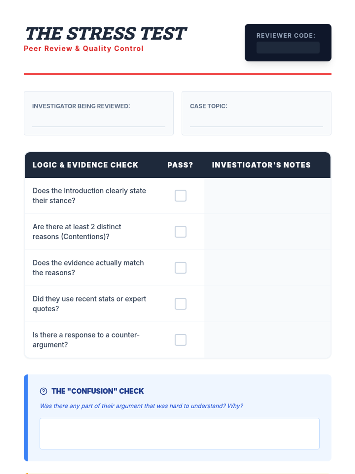 Students peer-review and 'stress-test' their briefs to identify logical gaps and strengthen their evidence before finalizing their research product.