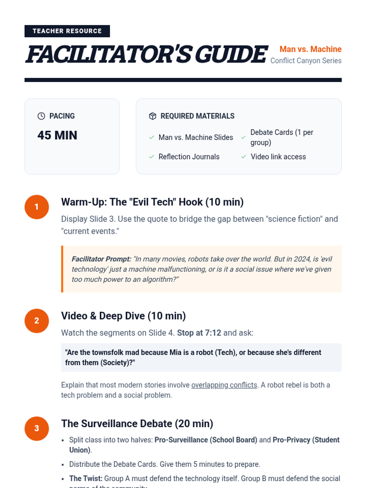 This lesson explores the intersection of Character vs. Society and Character vs. Technology conflicts through a modern ethical lens. Students will analyze segments from a literary conflict video and engage in a structured debate about facial recognition in schools.