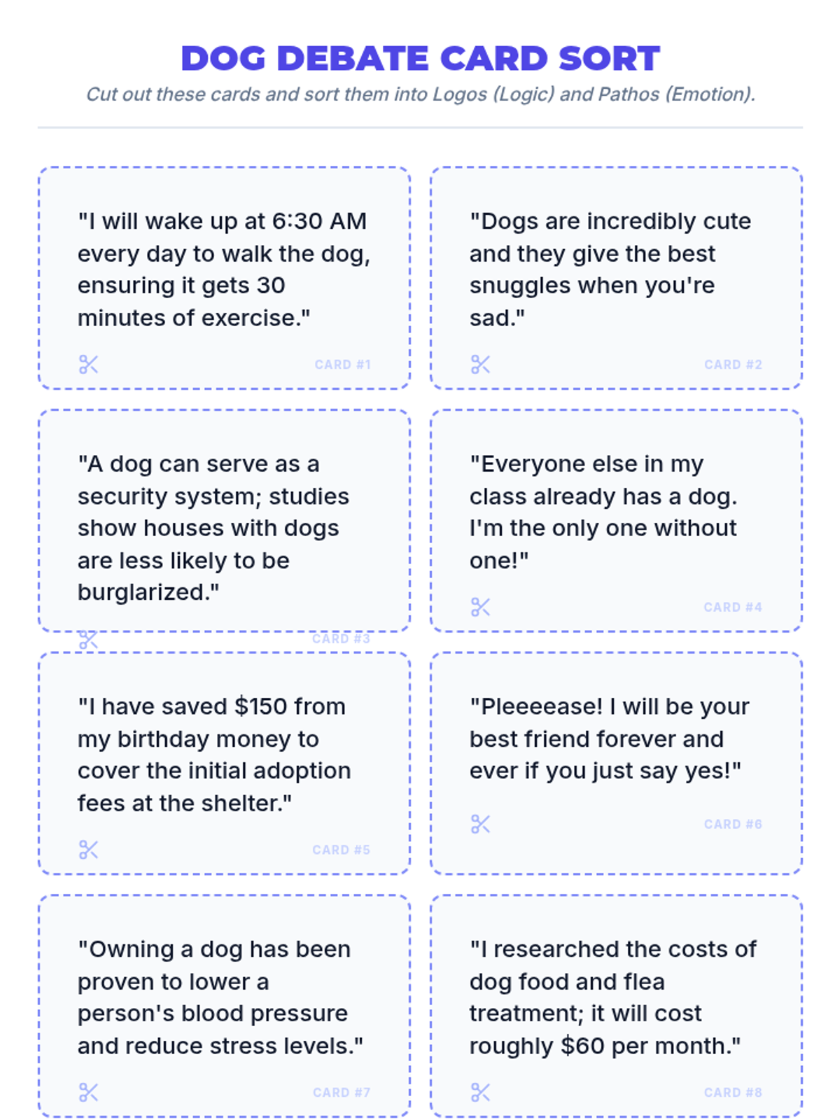 Students learn to distinguish between logical (Logos) and emotional (Pathos) evidence through a video analysis of a teen persuading her mother, followed by an evidence-sorting activity and a persuasive writing exercise.
