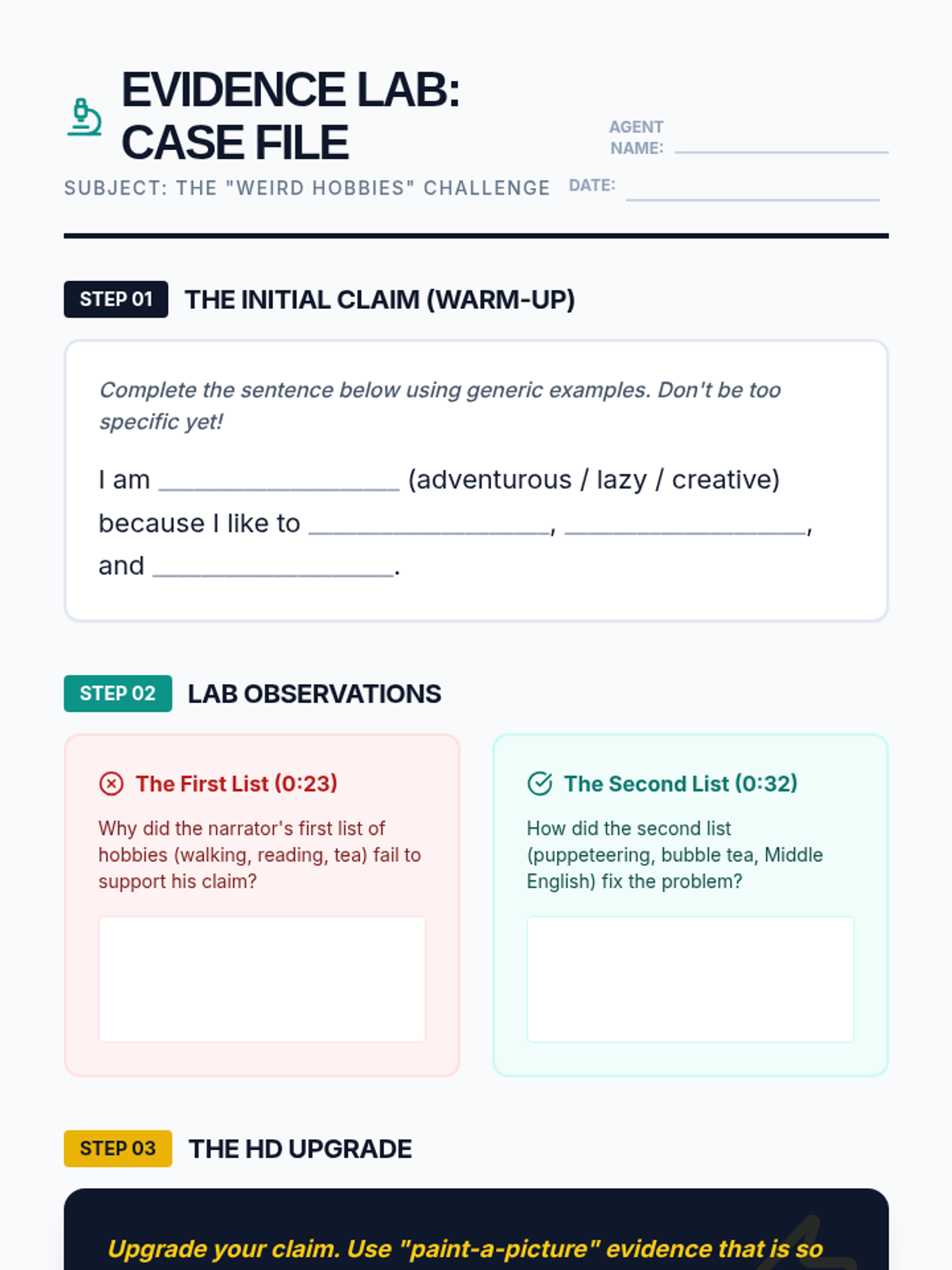 A middle school ELA lesson focused on using specific evidence to support claims, inspired by the Khan Academy 'Weird Hobbies' video. Students move from generic descriptions to high-definition examples that 'paint a picture' for the reader.