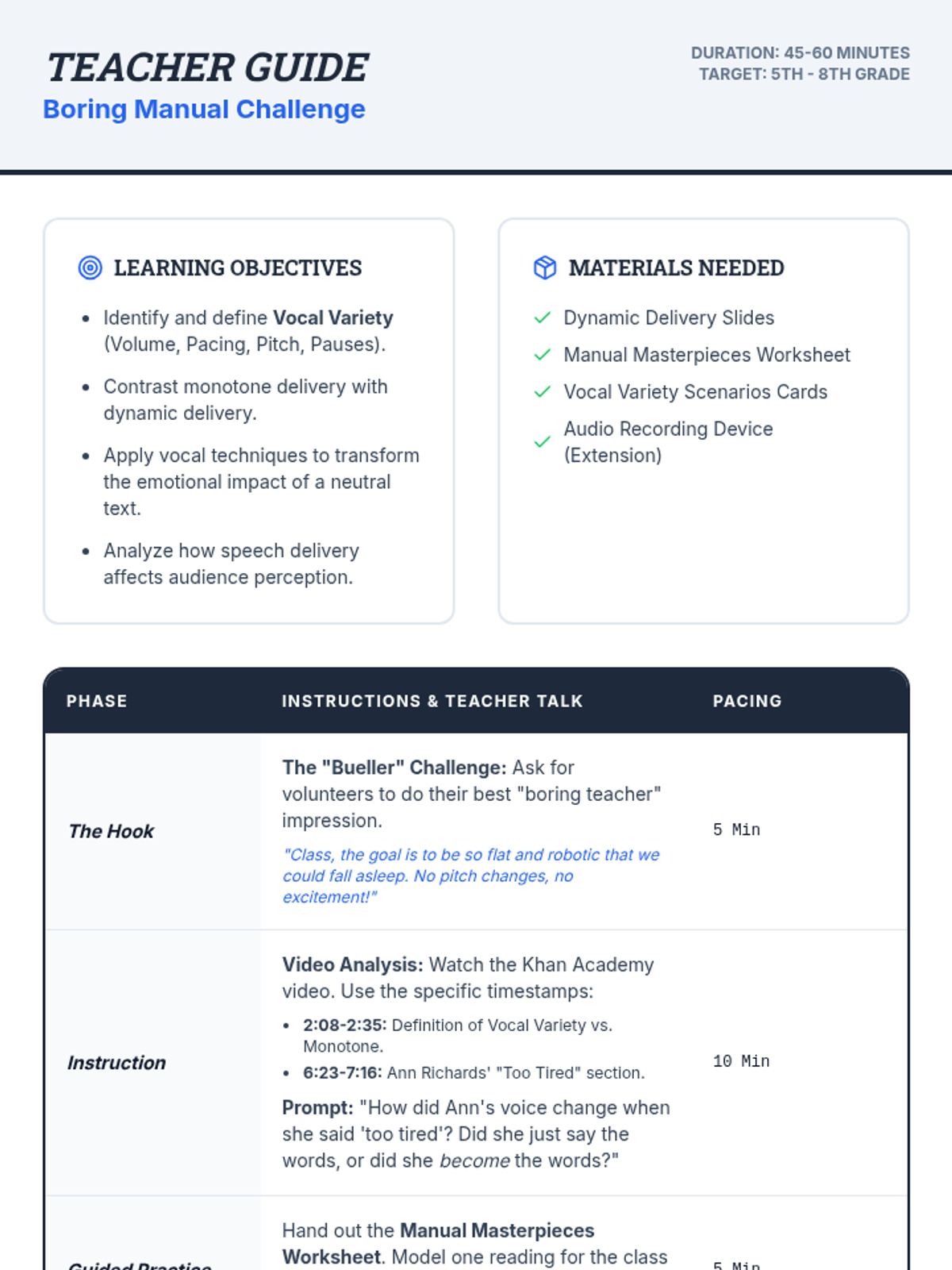 A high-energy lesson where students transform dry technical manuals into dramatic performances to master vocal variety, pacing, and pitch. Includes an analysis of expert speech delivery and a 'Bueller' challenge hook.