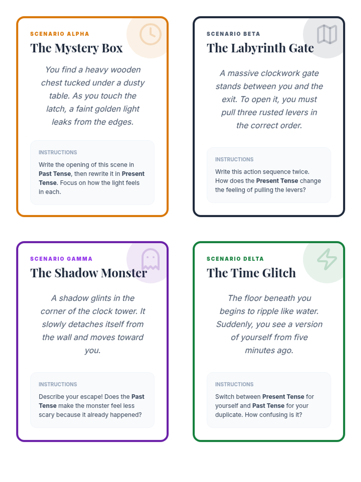 A narrative writing lesson for 5th-6th graders that explores how shifting between past and present tense alters the tone and immediacy of a story, using a steampunk 'time travel' theme.
