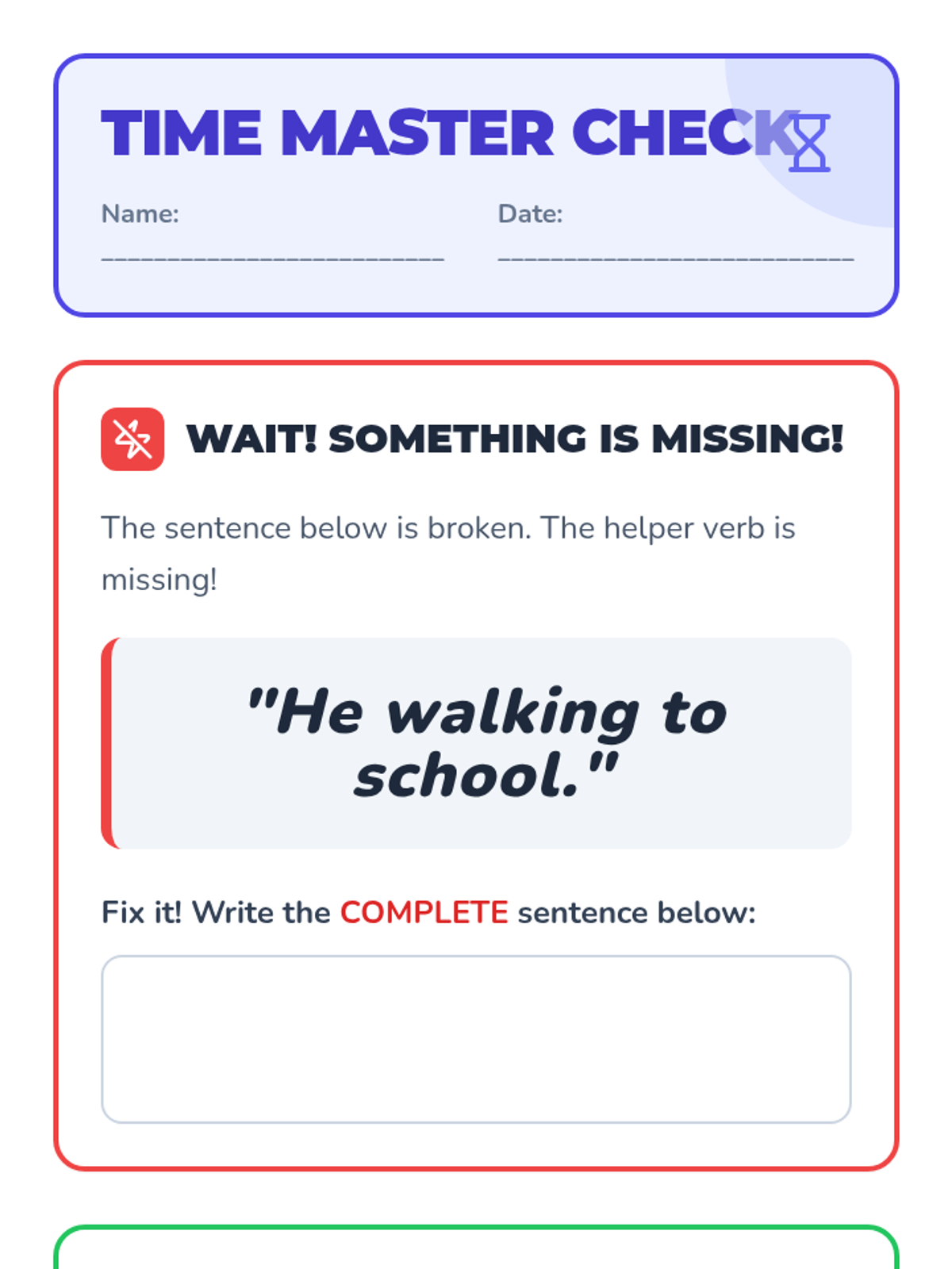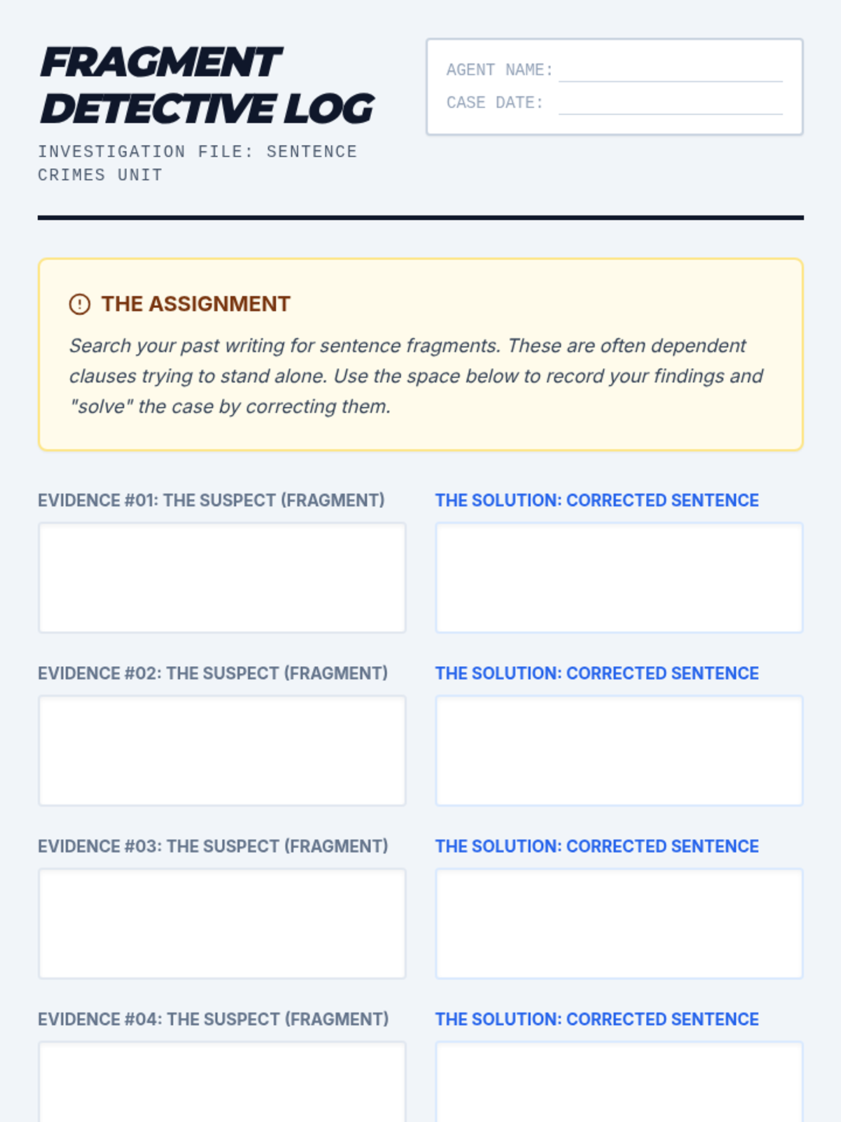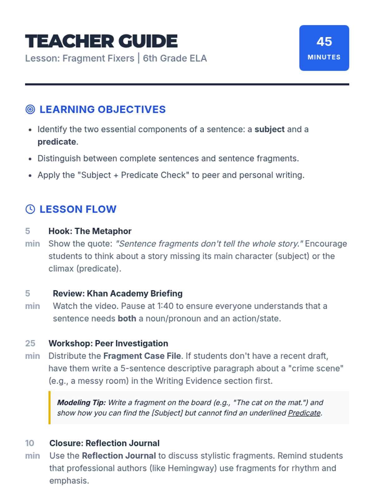 A 6th-grade ELA lesson where students act as 'grammar detectives' to identify and repair sentence fragments in their own and peers' writing using the Subject + Predicate Check method.