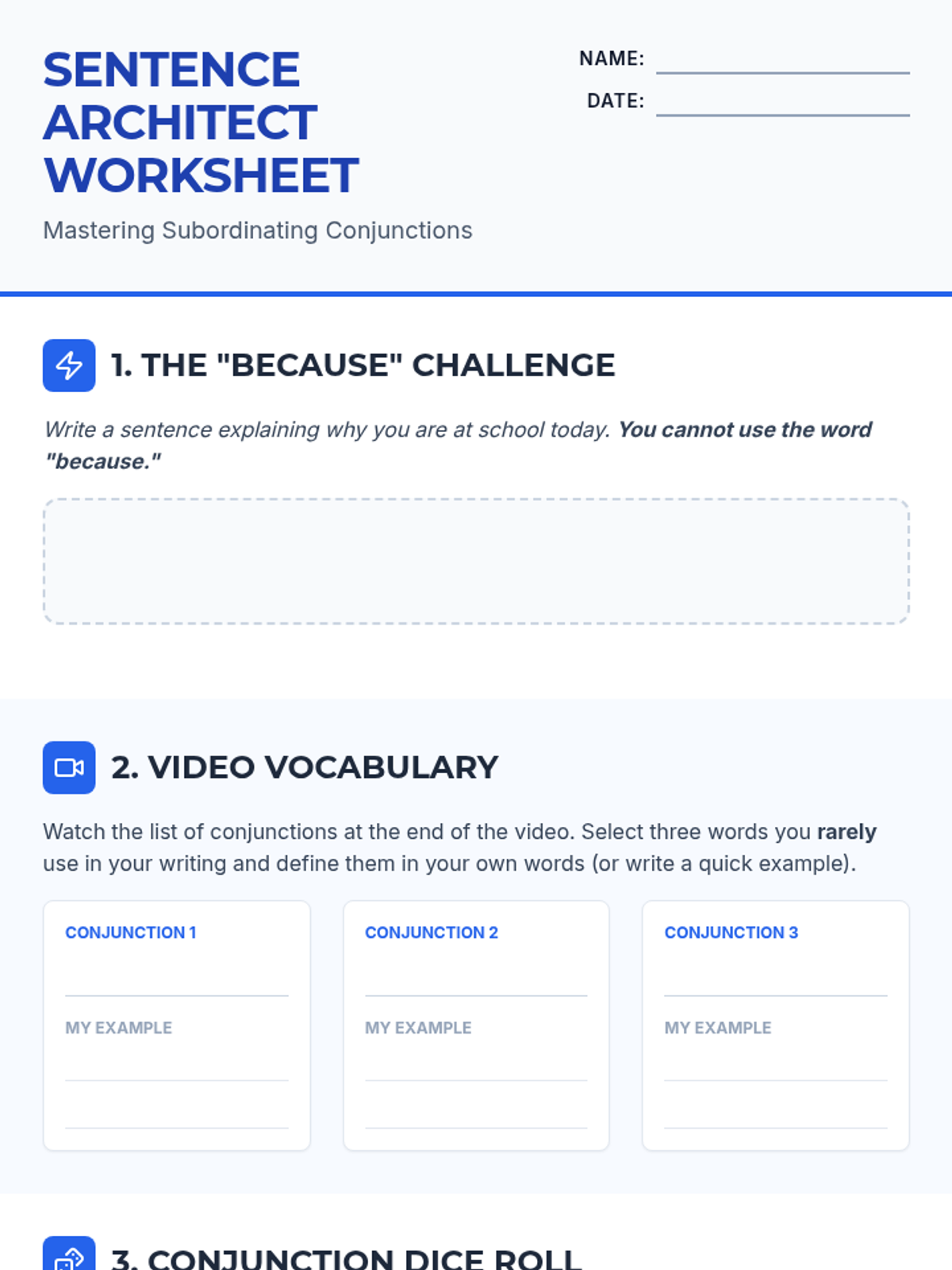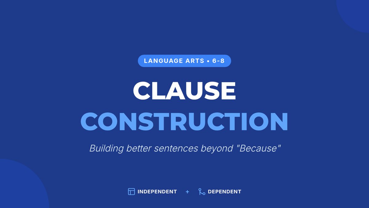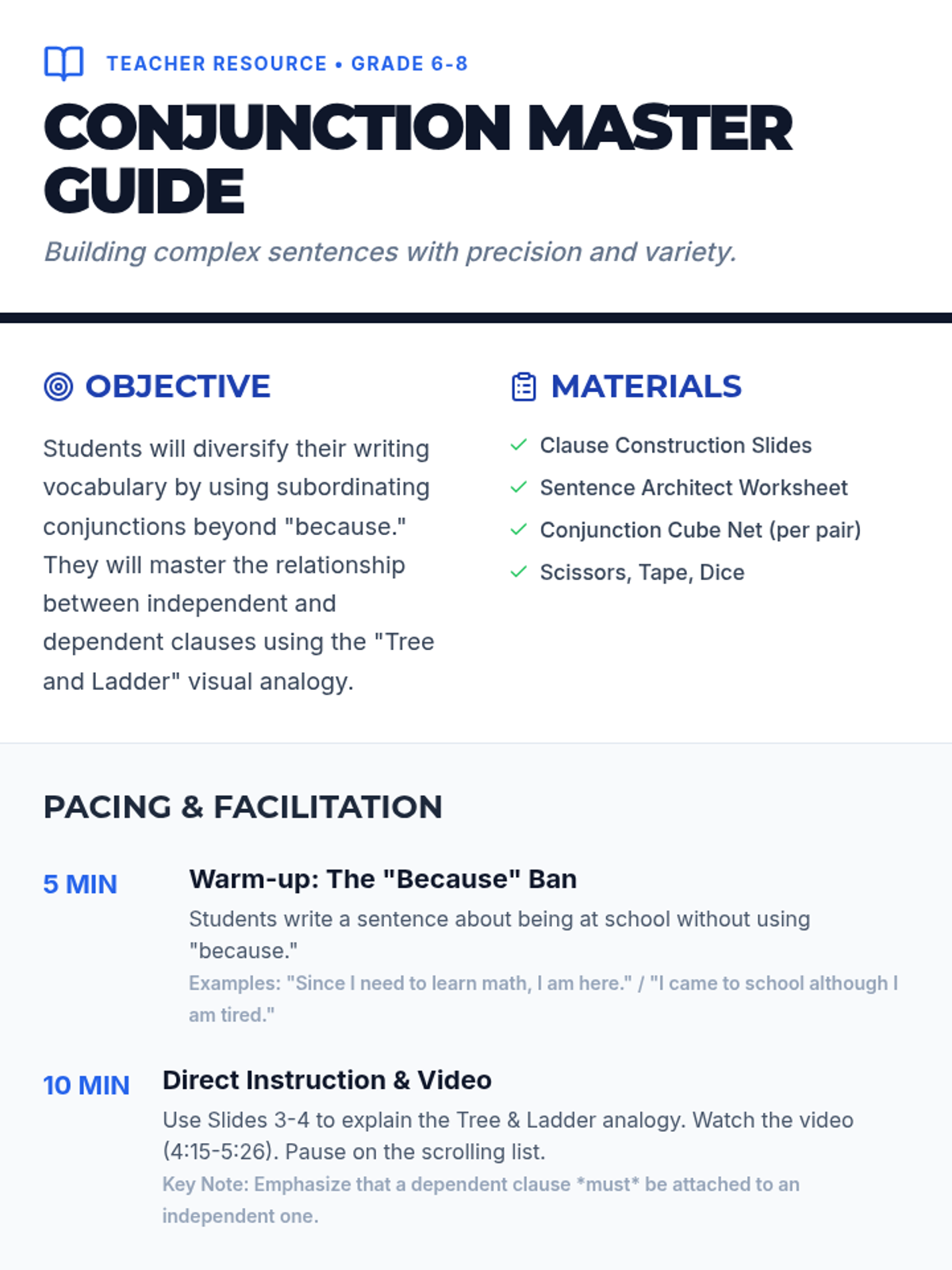 A dynamic grammar lesson for middle schoolers focusing on subordinating conjunctions. Students will move beyond 'because' by using a tree-and-ladder analogy and interactive dice games to build complex sentences.