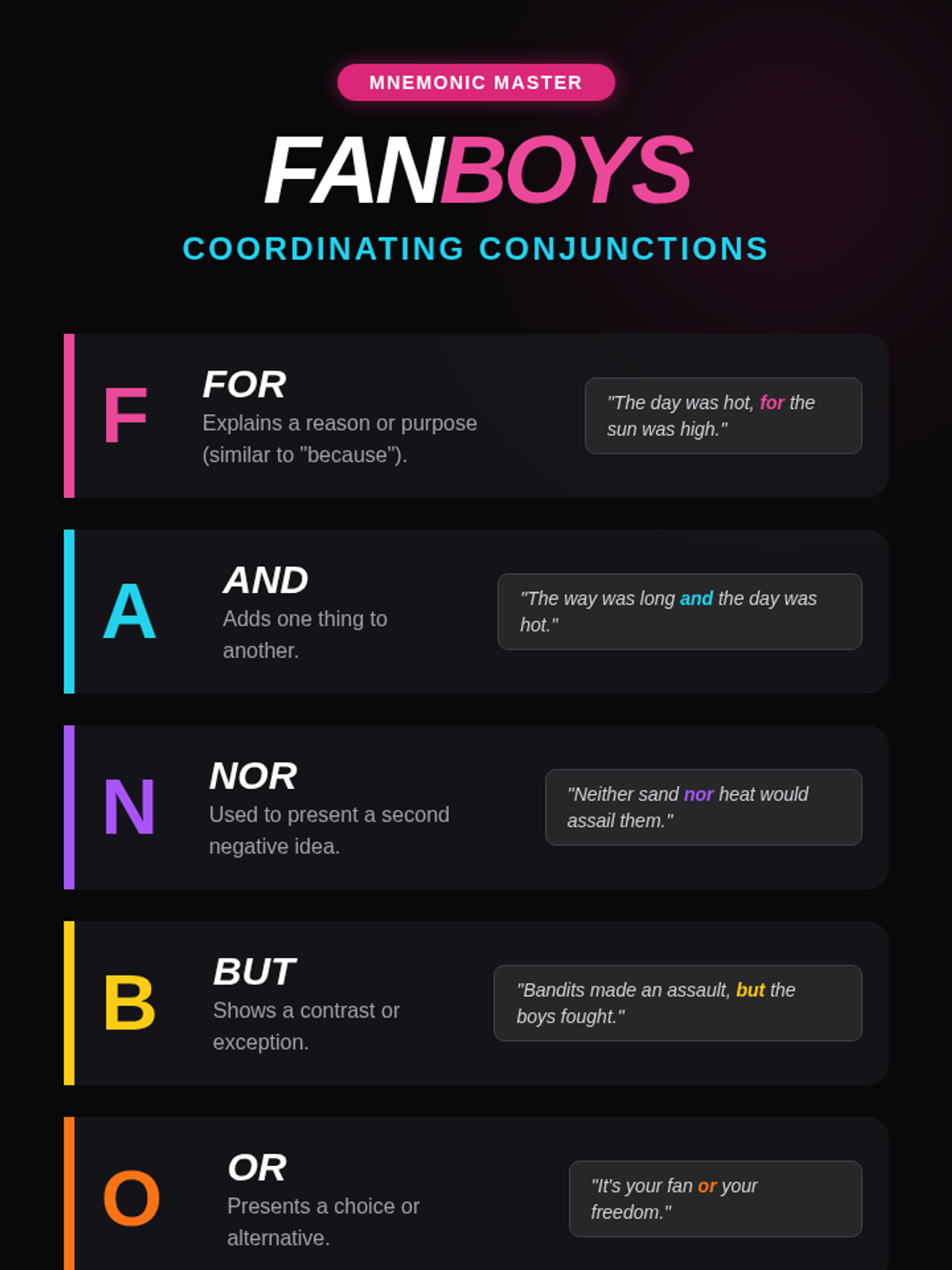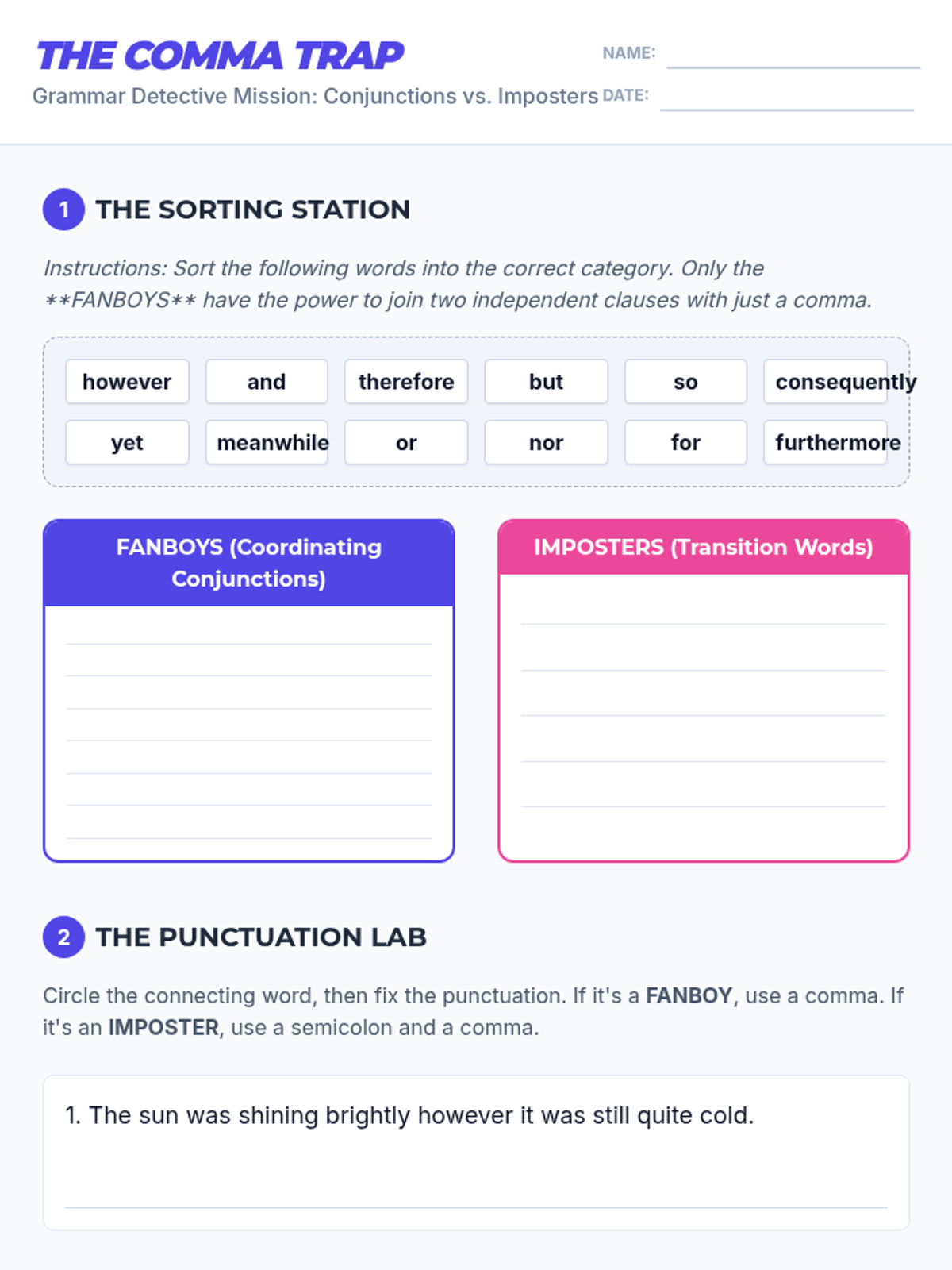 A lesson focused on distinguishing between coordinating conjunctions (FANBOYS) and other transition words to prevent comma splices, featuring a catchy mnemonic song and a sorting activity.