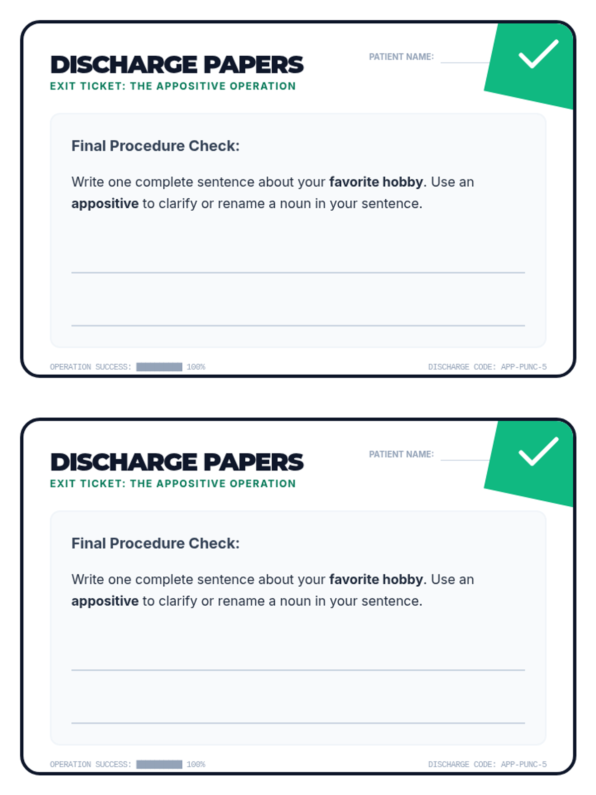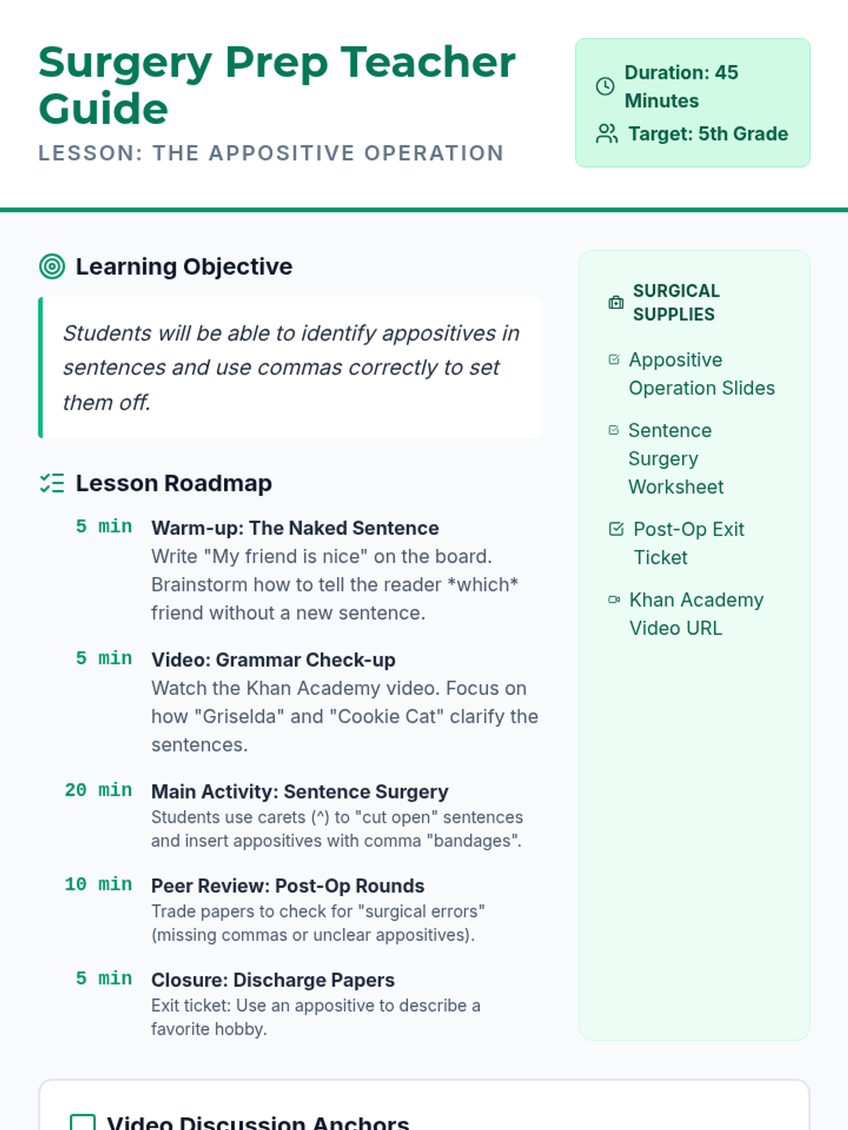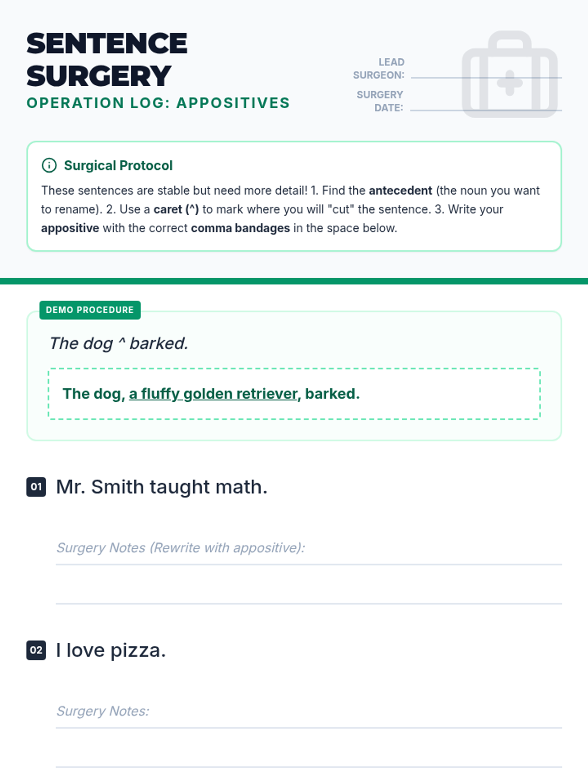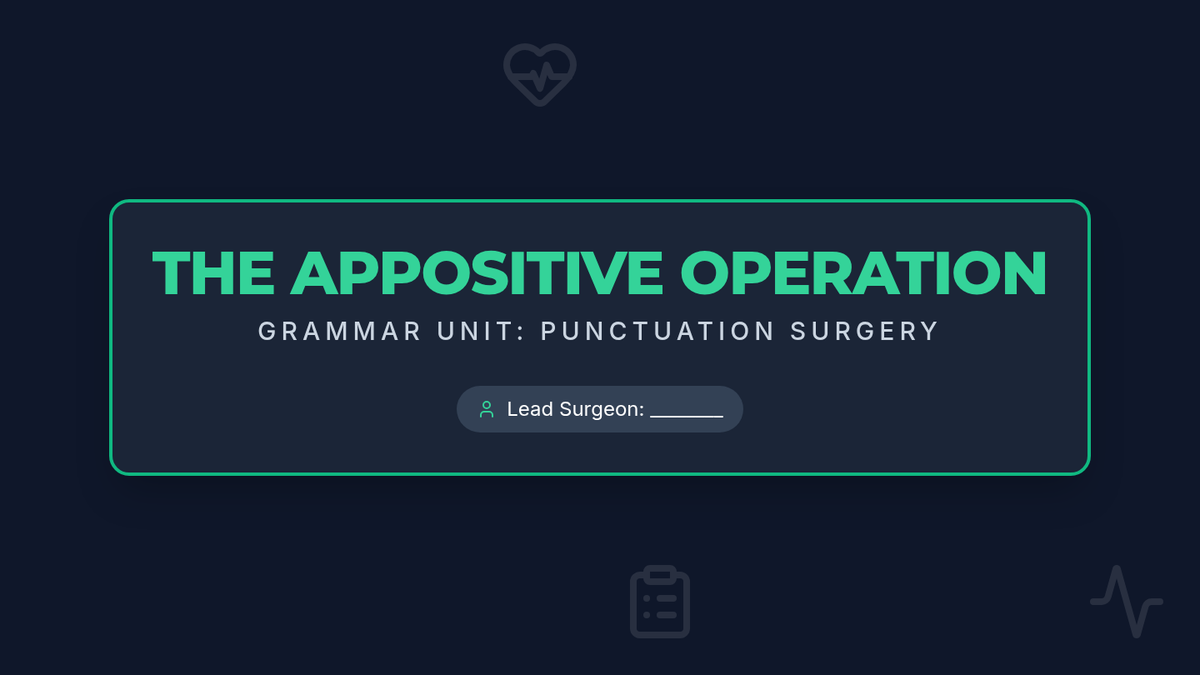 A medical-themed grammar lesson where students perform 'surgery' on simple sentences by inserting appositives and using comma 'bandages' to clarify information.