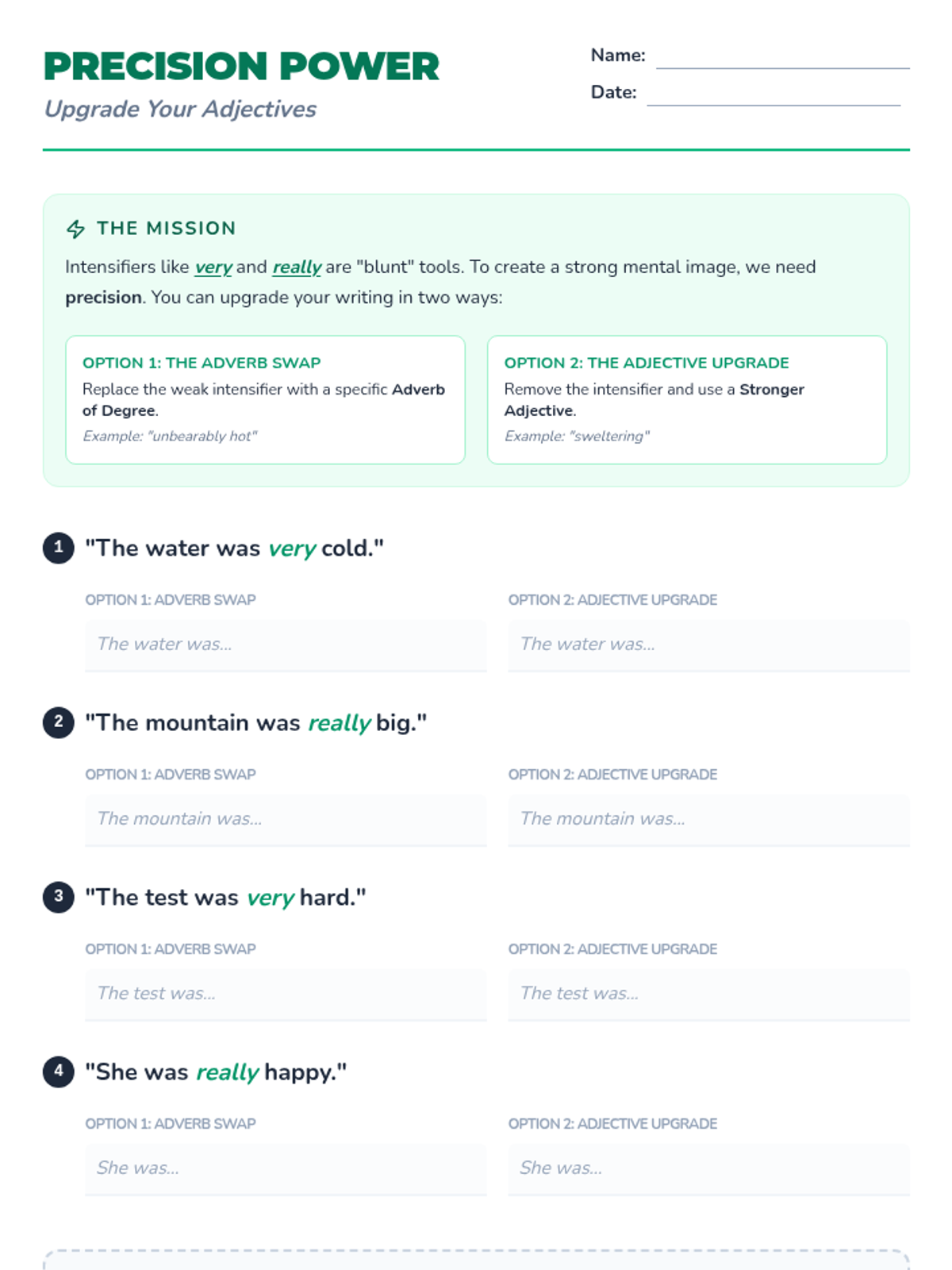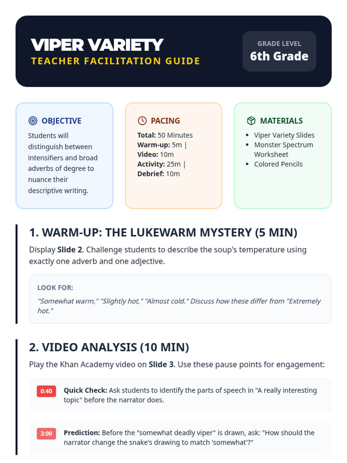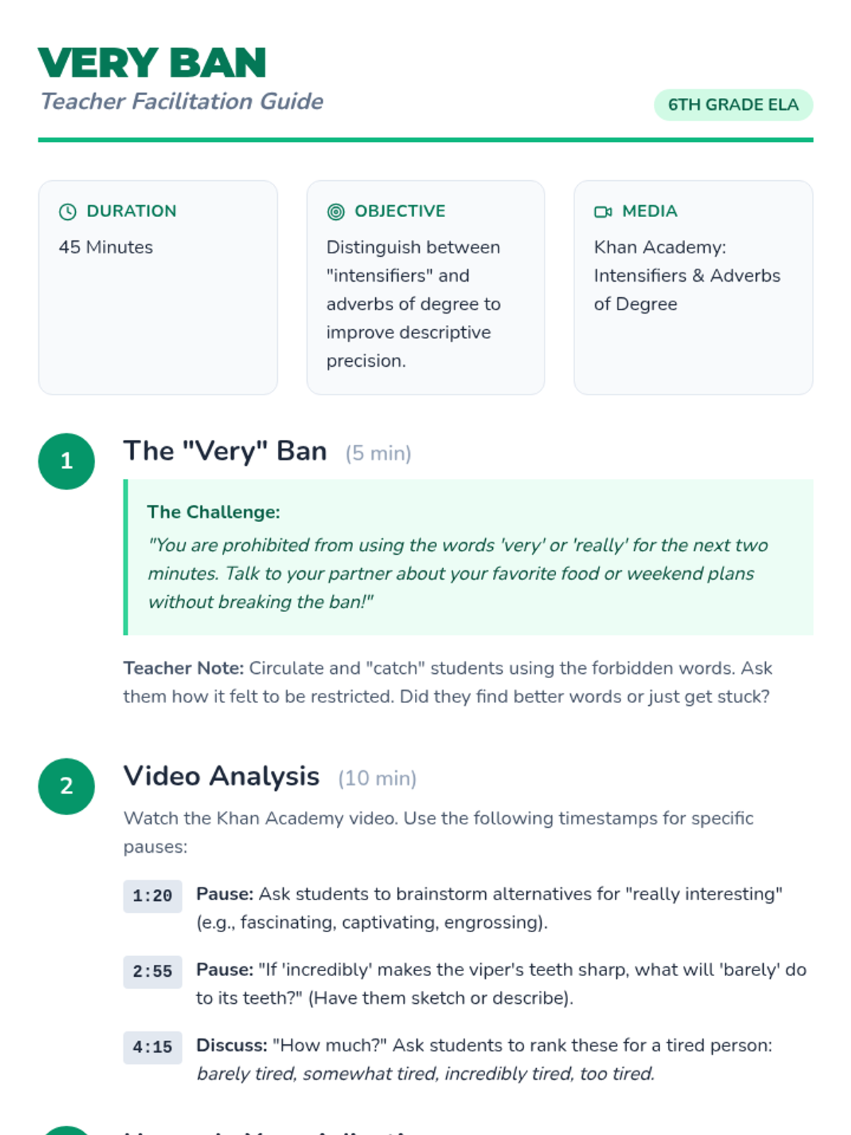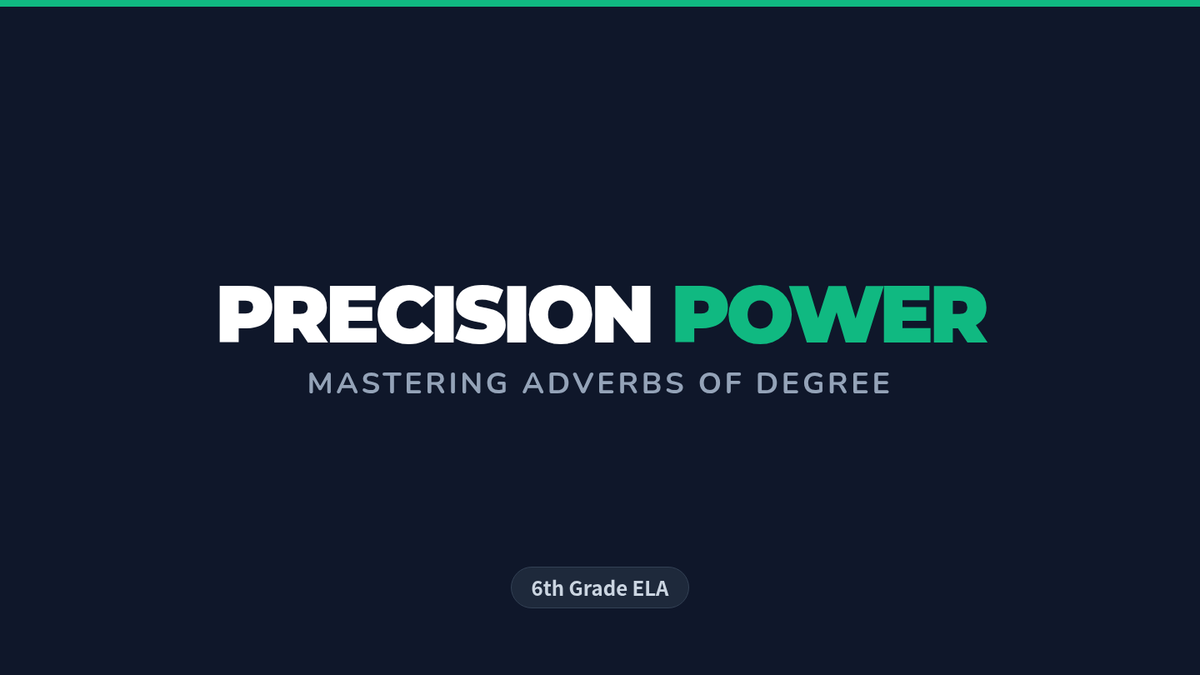 A 6th-grade ELA lesson focused on identifying intensifiers and adverbs of degree, helping students move beyond the overused word 'very' to improve descriptive precision. Students will analyze a Khan Academy video, participate in a 'Very Ban' challenge, and practice upgrading weak sentences with specific vocabulary.