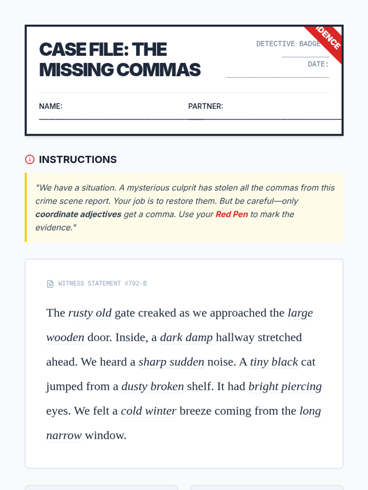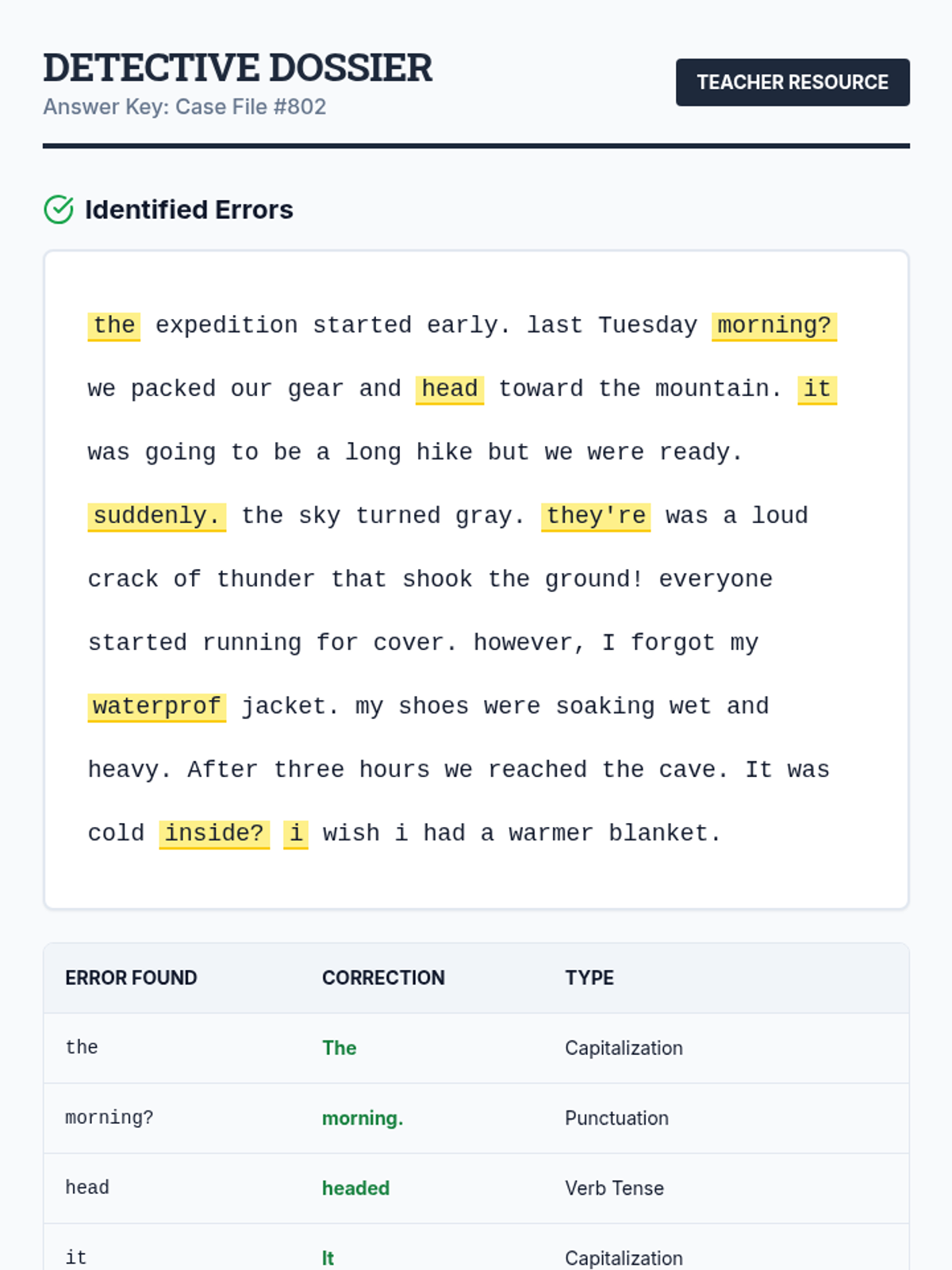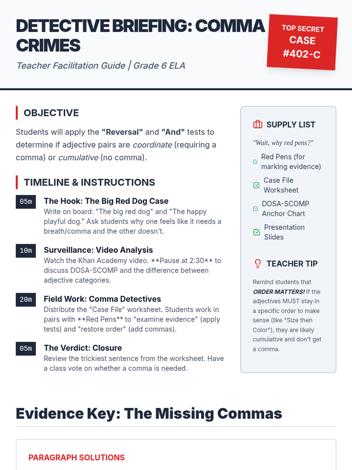 Students become "editing detectives" using the CUPS strategy (Capitalization, Usage, Punctuation, Spelling) to investigate and correct error-ridden "Case Files," including a tricky Red Herring.