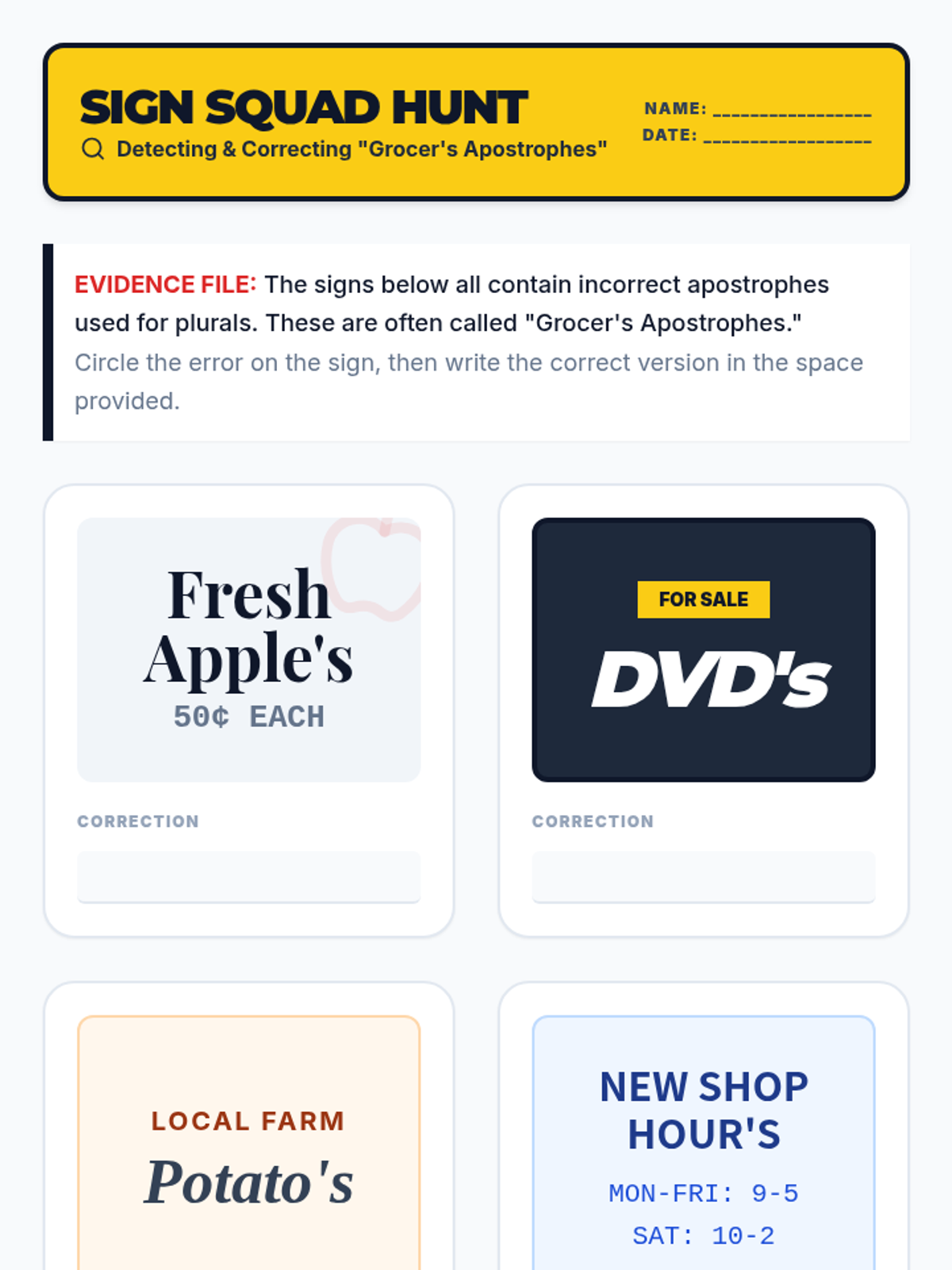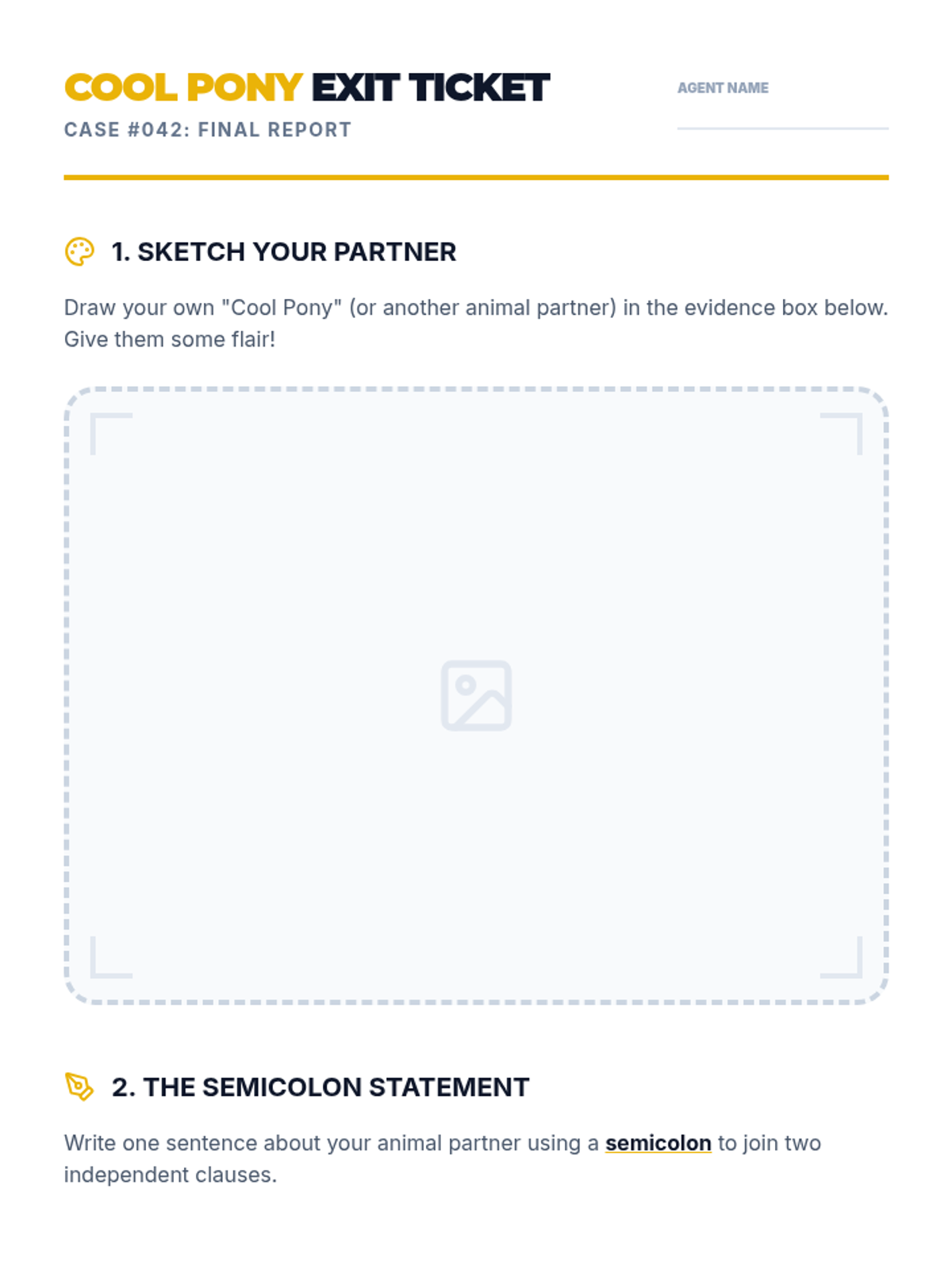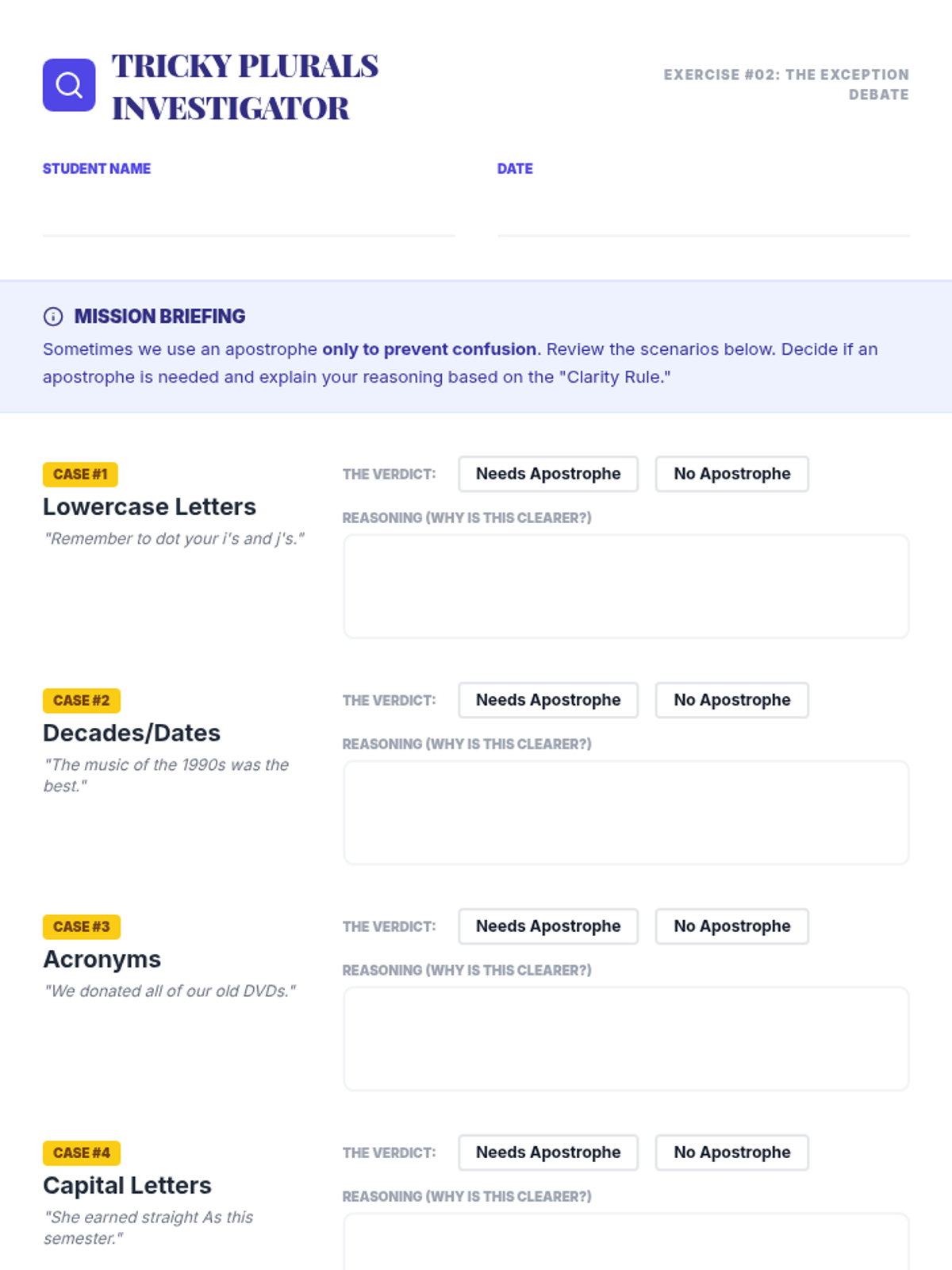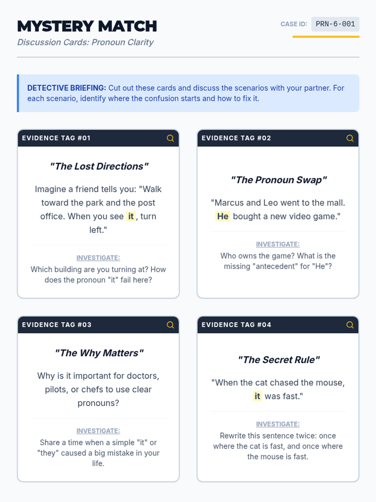 Students become "editing detectives" using the CUPS strategy (Capitalization, Usage, Punctuation, Spelling) to investigate and correct error-ridden "Case Files," including a tricky Red Herring.