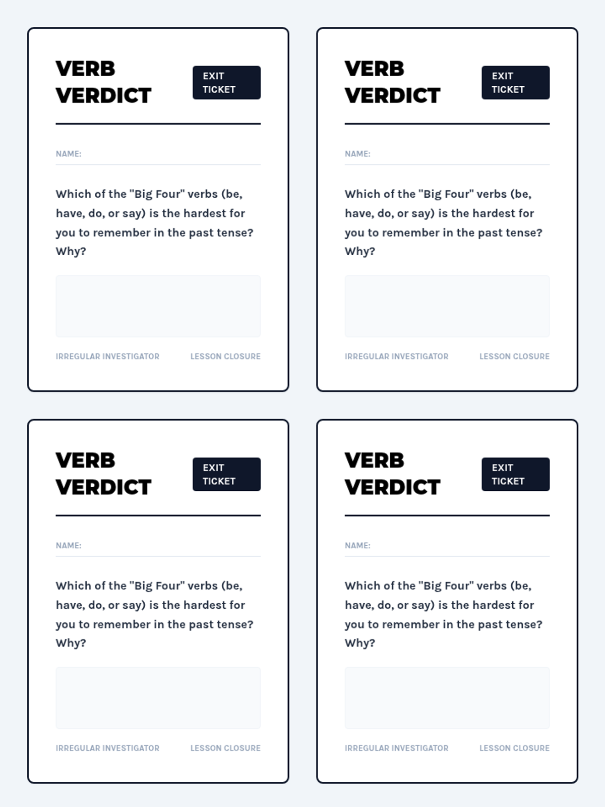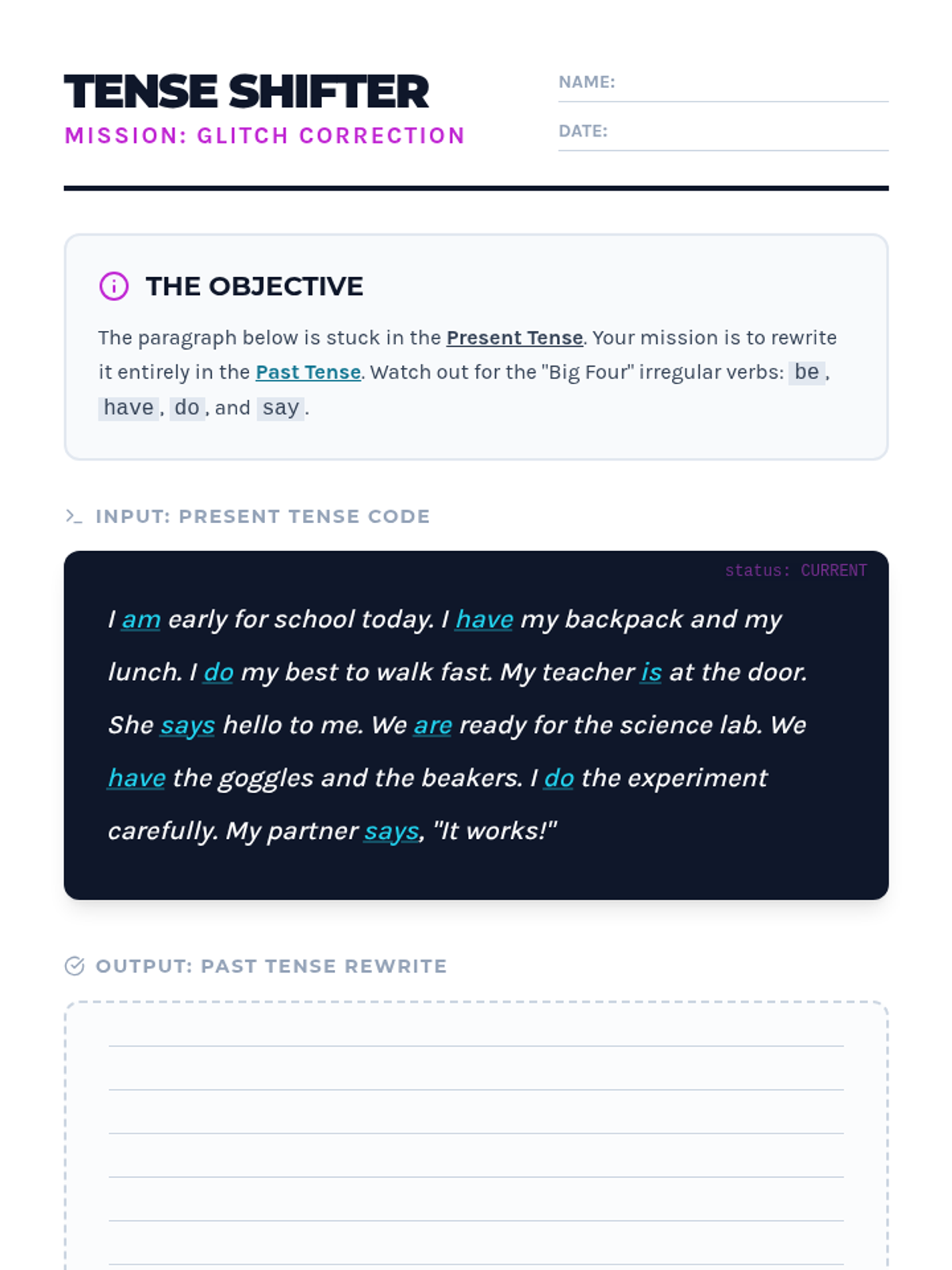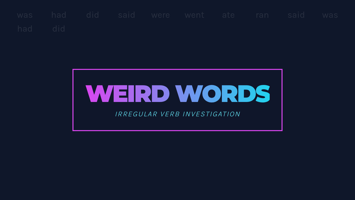 Students investigate the 'weird' world of irregular verbs, focusing on the four most common: be, have, do, and say. They will correct 'grammar fails', watch a conceptual refresher, and practice shifting tenses in a paragraph-length narrative.