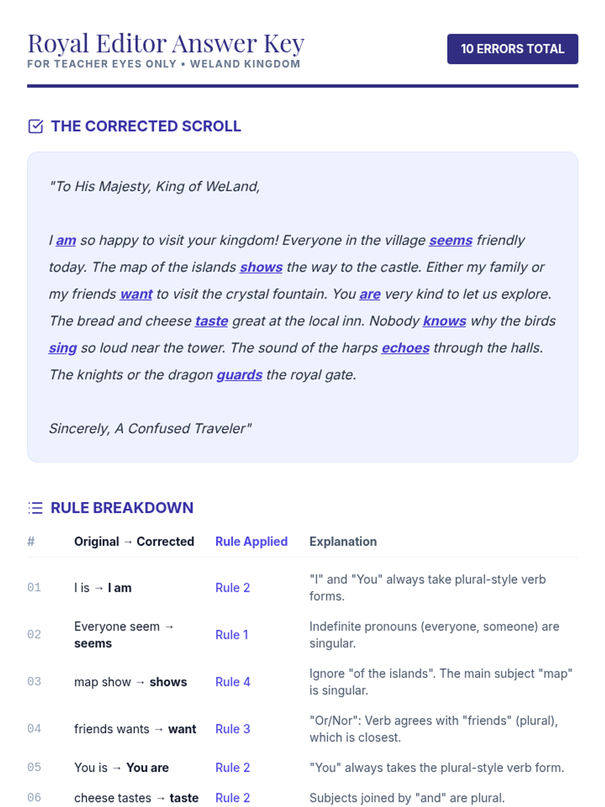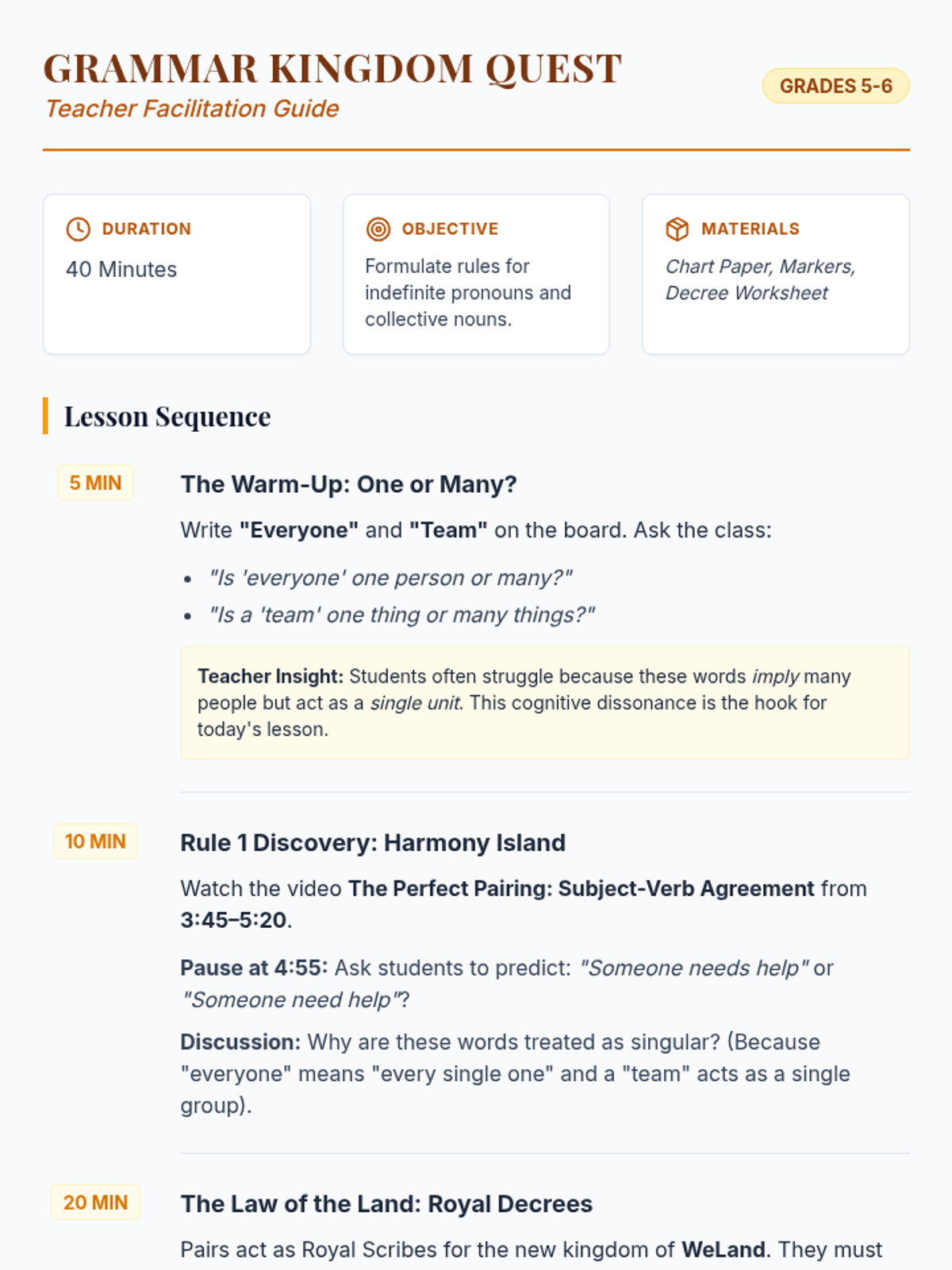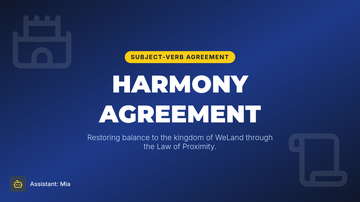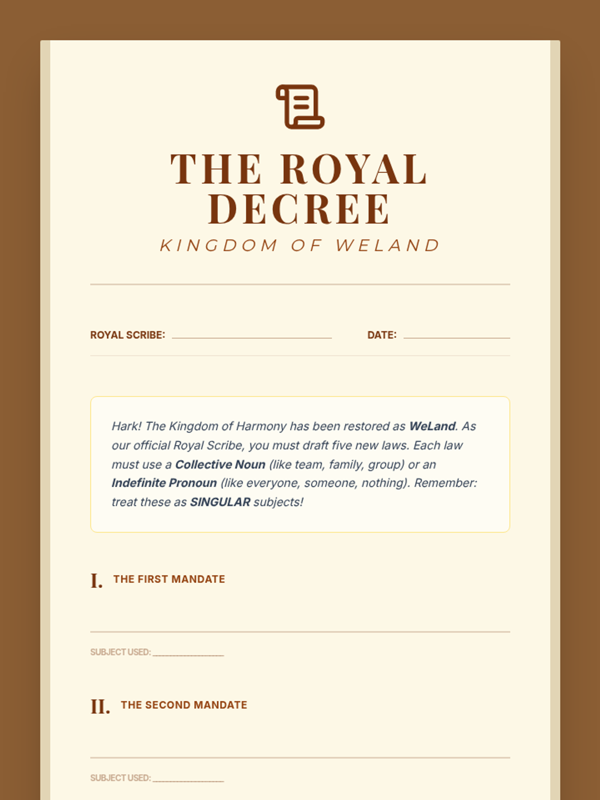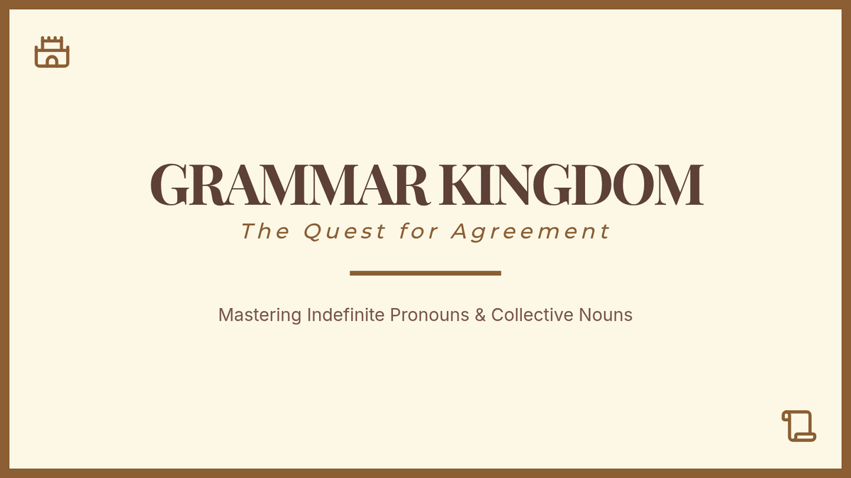 A fantasy-themed grammar lesson where students help restore peace to the kingdom of WeLand by mastering subject-verb agreement with indefinite pronouns and collective nouns.