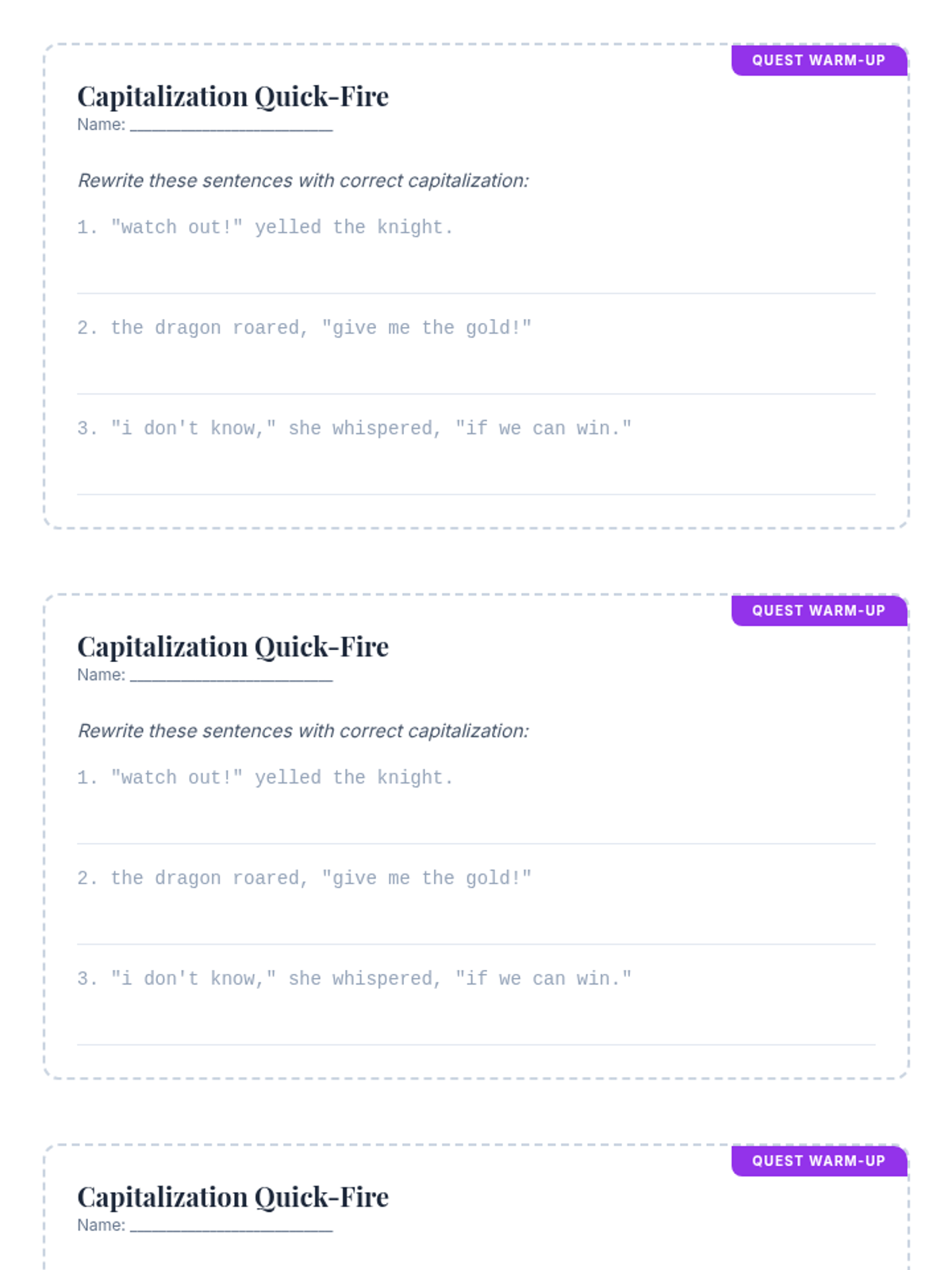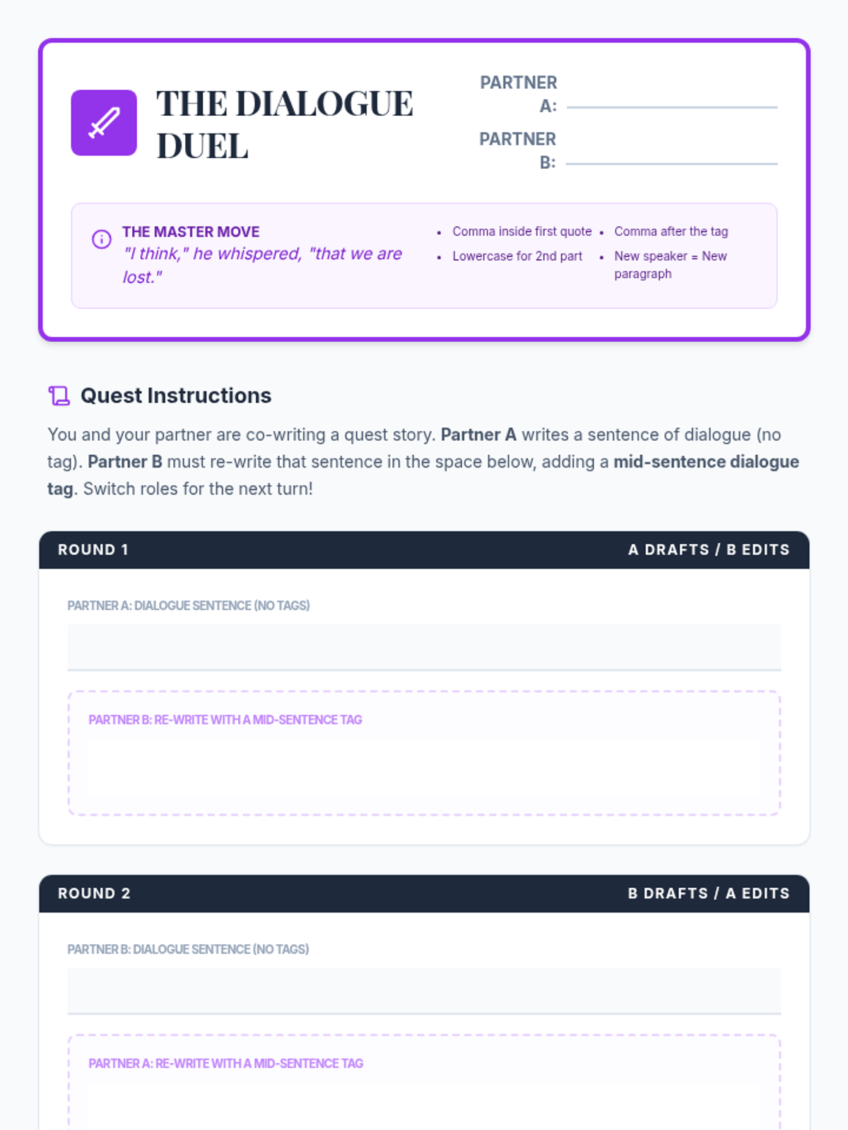 A middle school ELA lesson focusing on the intricacies of punctuating dialogue, specifically mid-sentence tags, through a quest-themed video and collaborative storytelling activity.