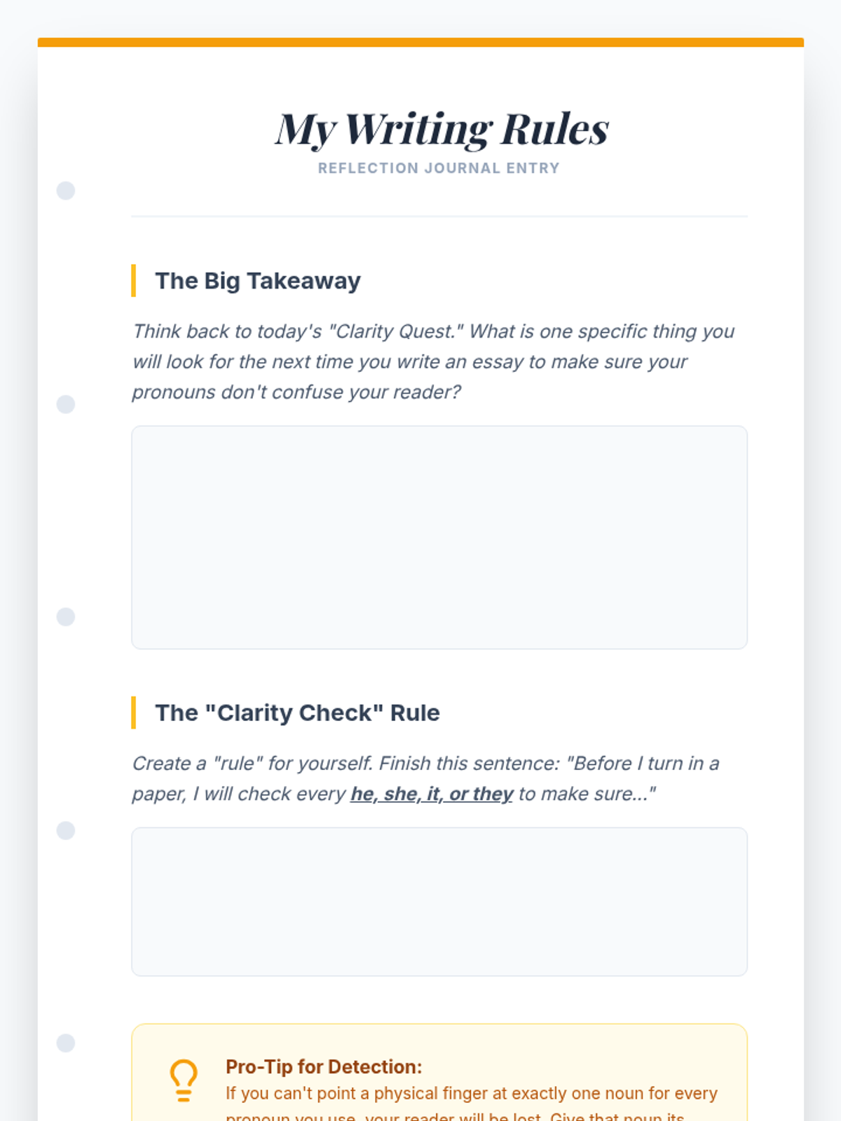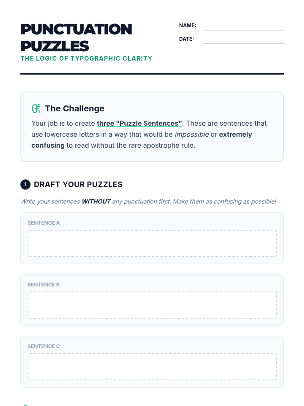 Students synthesize their learning by choosing the best punctuation mark for various rhetorical effects in a final editing challenge.