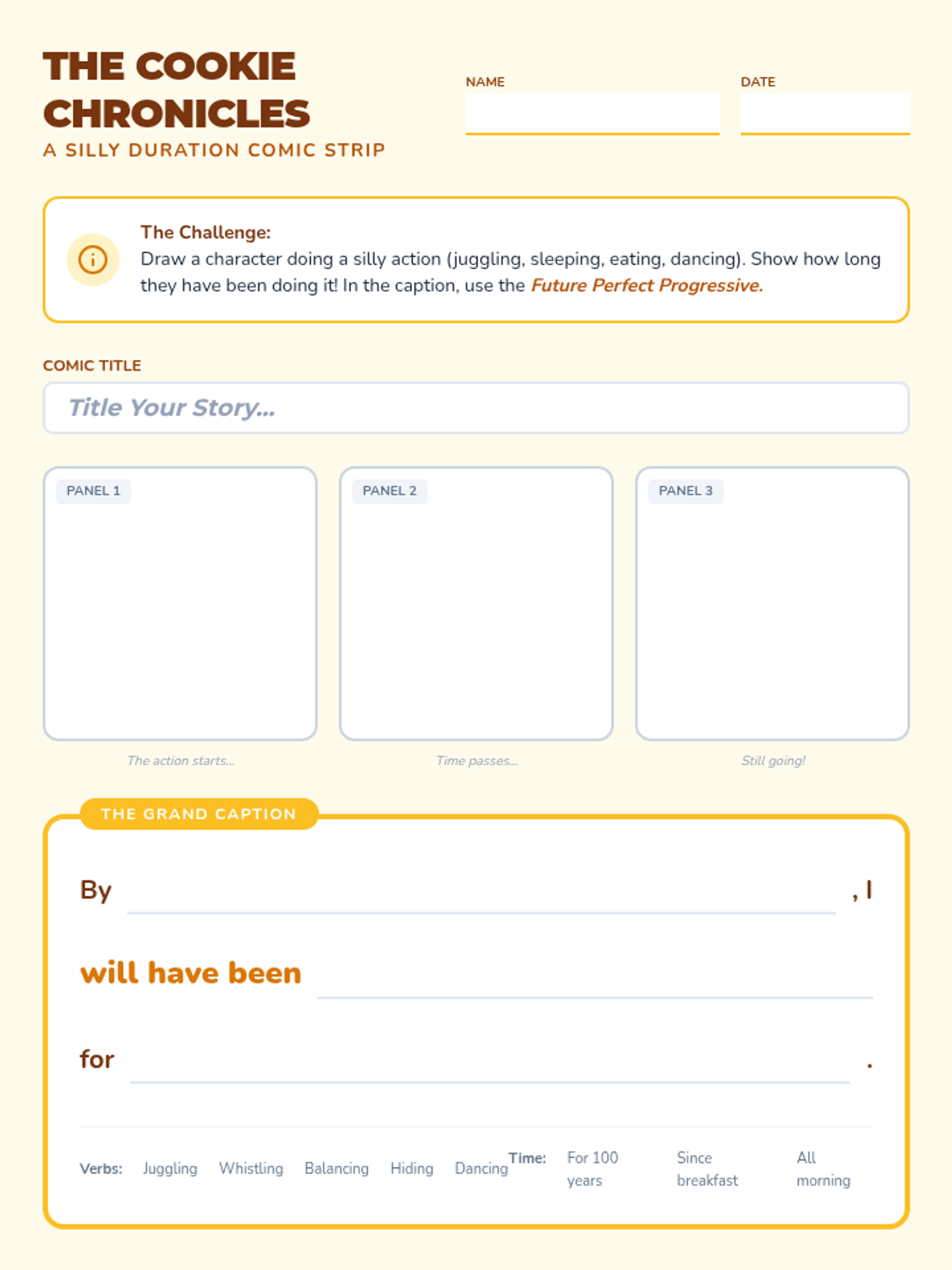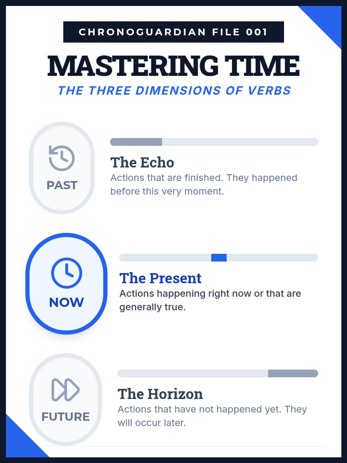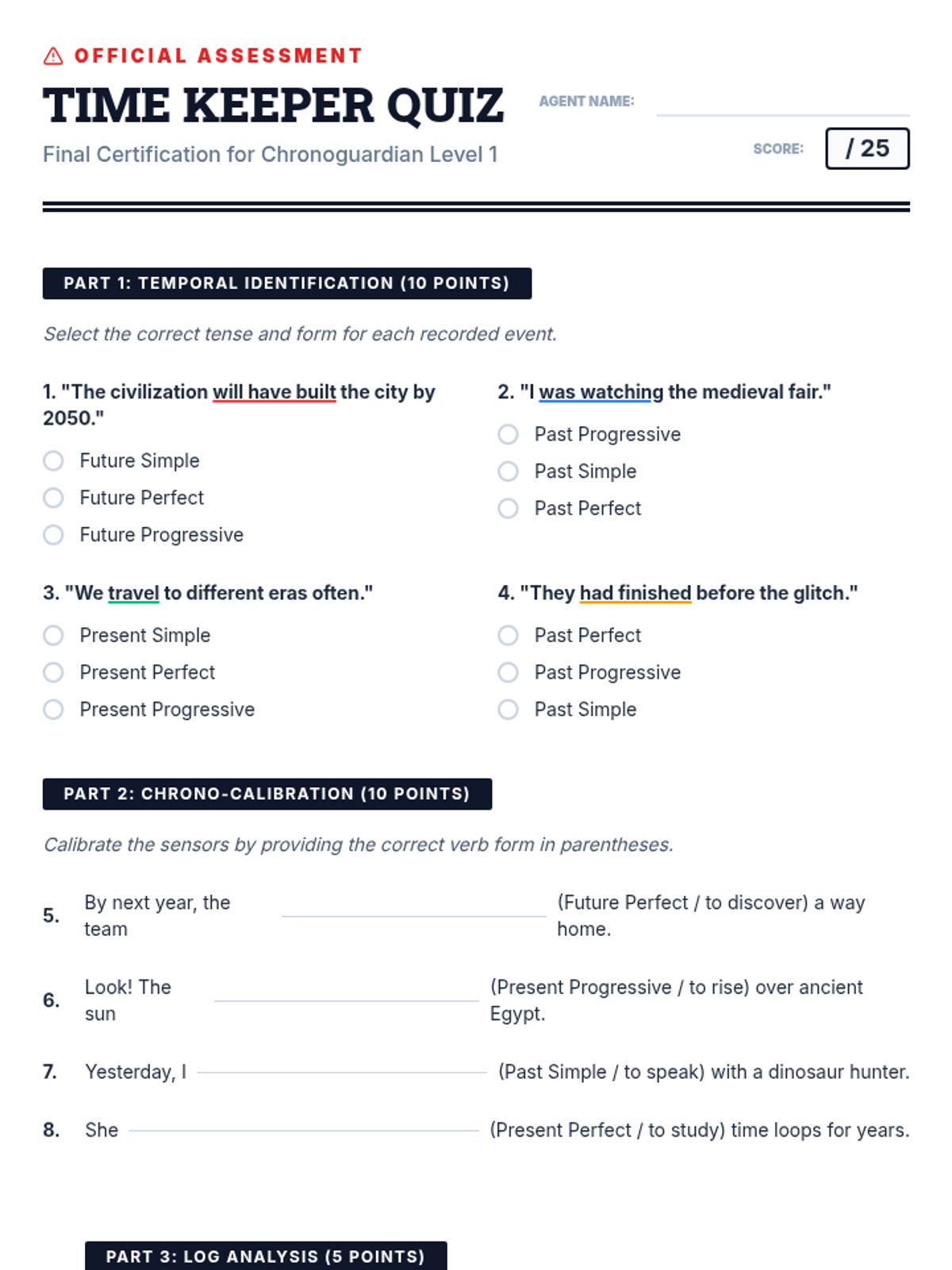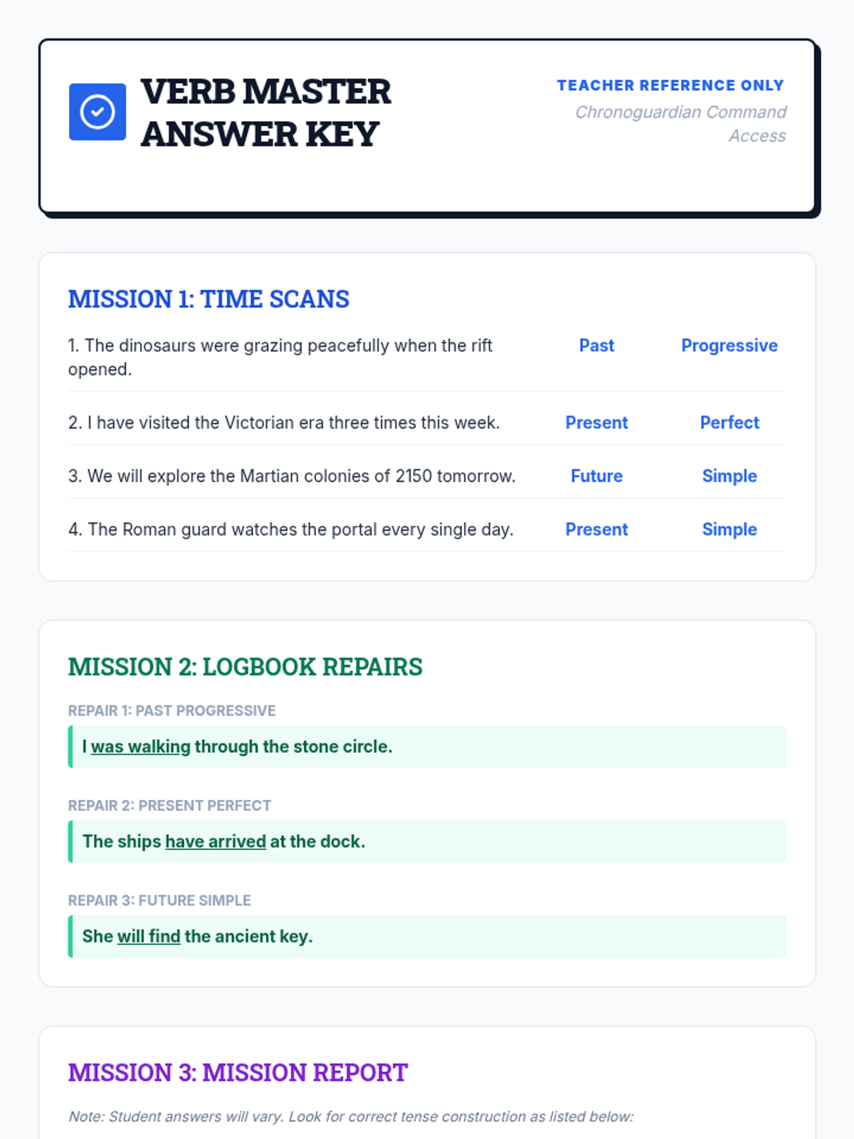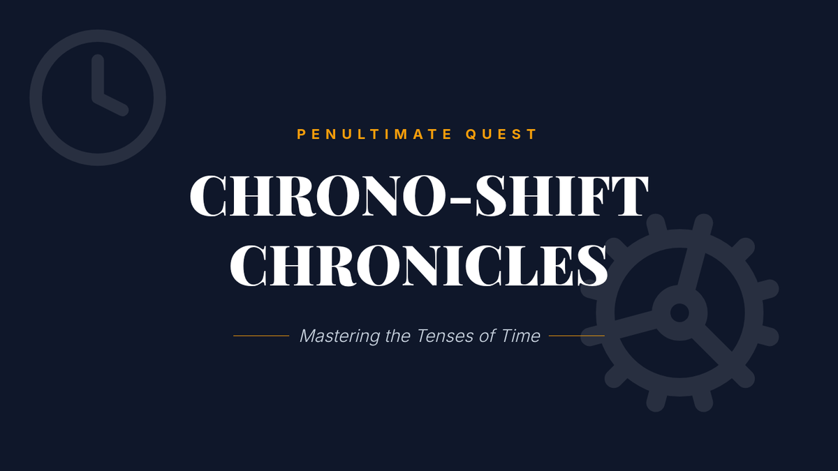 A comprehensive lesson on verb tenses (past, present, future) covering simple, progressive, and perfect forms through the lens of a time-traveling adventure.